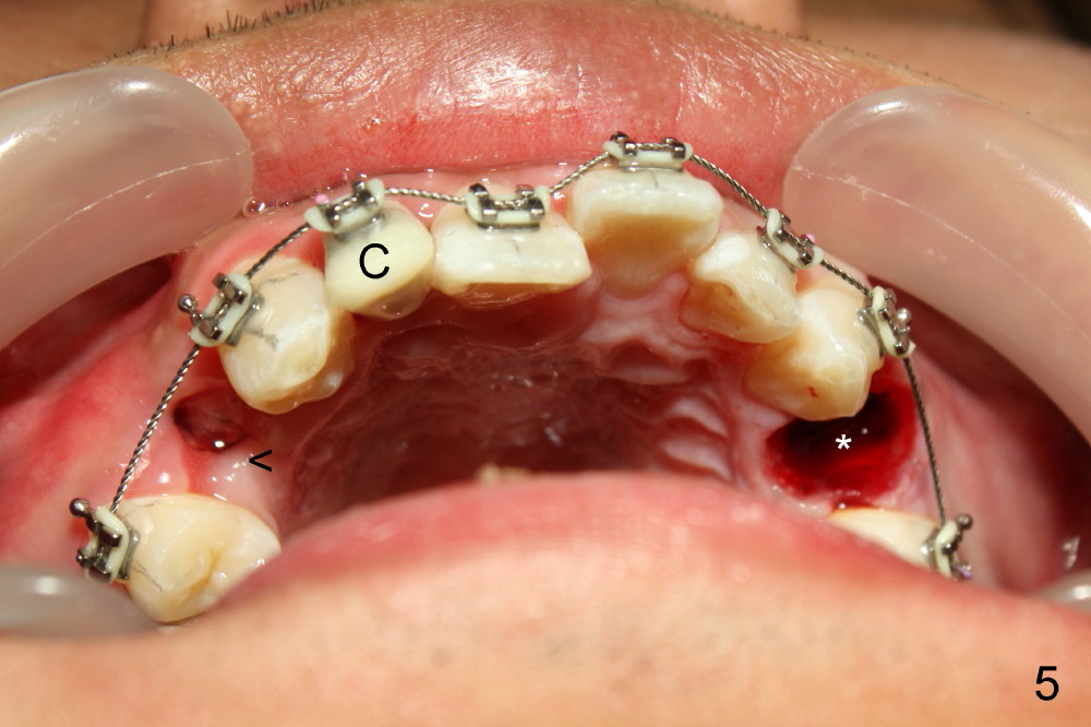 A 21-year-old man has severe maxillary protrusion (Class II malocclusion) with crown fracture of #7 (Fig.1,2,3 (latter two mirror images). Treatment plan is to place pre-fabricated post and provisional for #7 (Fig.4,5 C) and start ortho treatment with extraction of upper 1st bicuspids (Fig.5 *, <). When ortho finishes, fabricate full-coverage porcelain crown for #7.