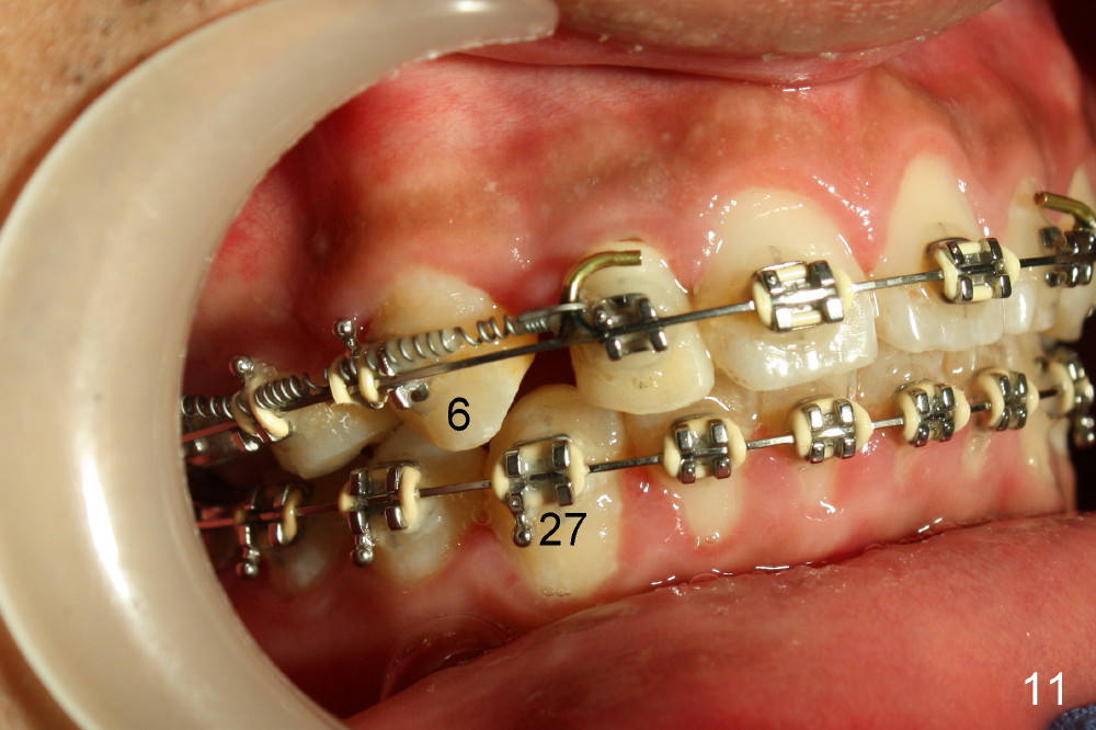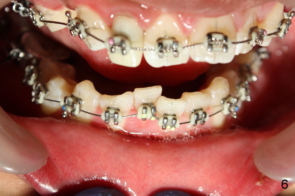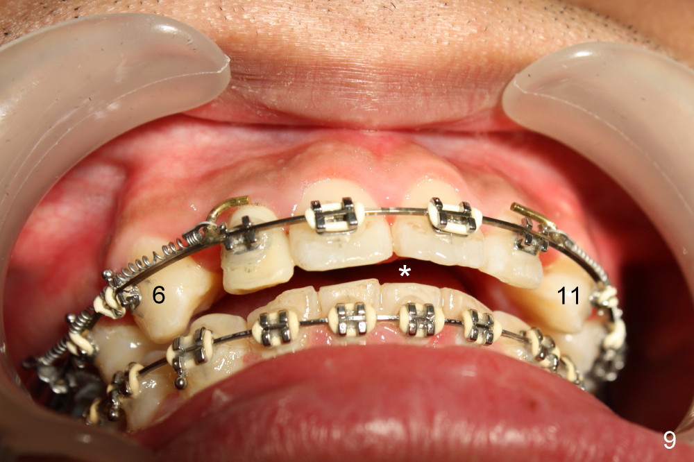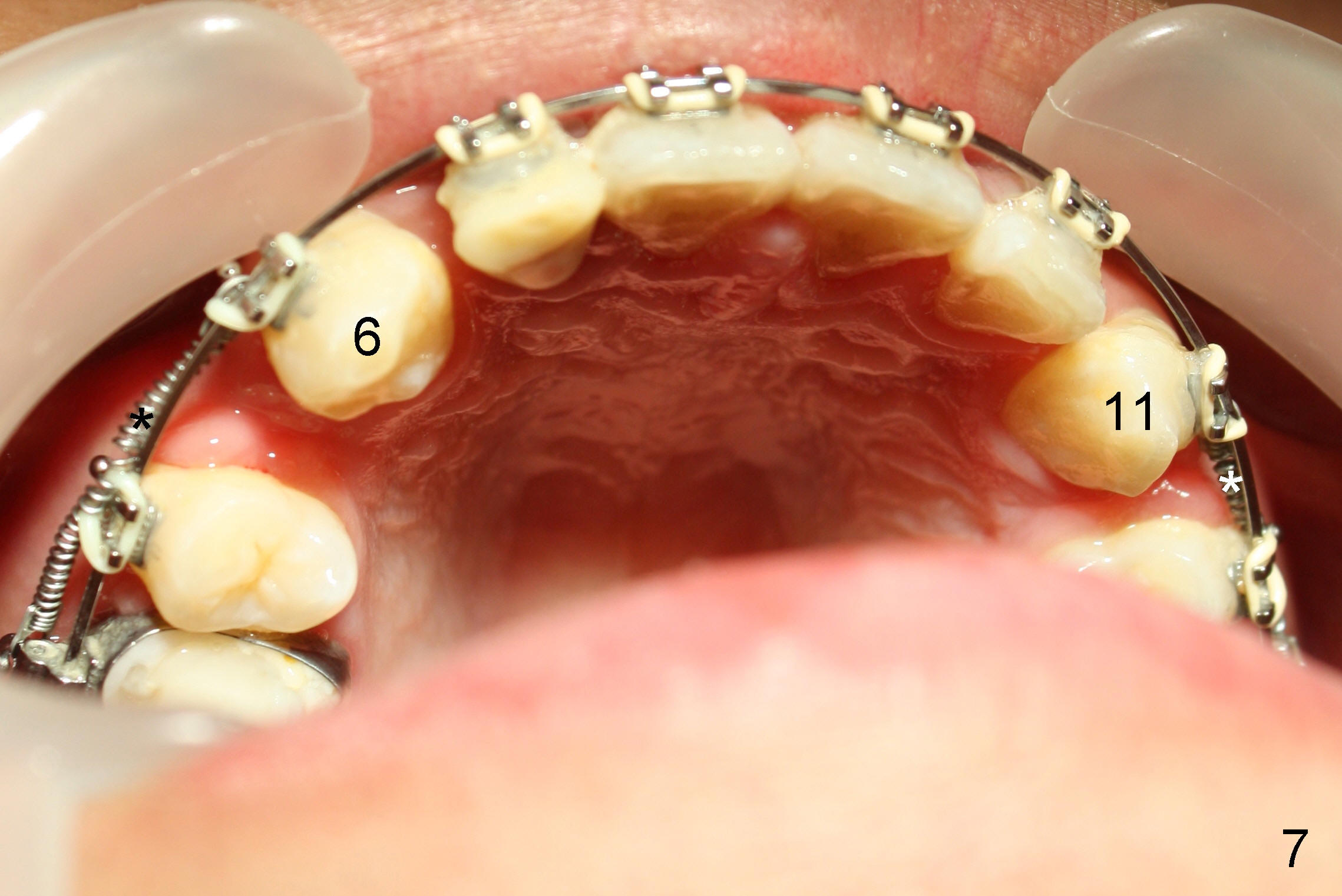 The 1st step of ortho is arch wire sequence to align the arches (from thin round wires to thick rectangular ones). The 2nd is to retract the canines distal (Fig.1 (planning), Fig.7 (6 months post bracketing), Fig.8 (7 months), using closed coil springs (*). The 3rd step is to move the remaining anteriors together distal using posted wire (^) and again closed coil springs (Fig.9; 8 month into treatment). Note the overjet between upper and lower anteriors (Fig.9: *). This space allows the upper incisors to move backward.