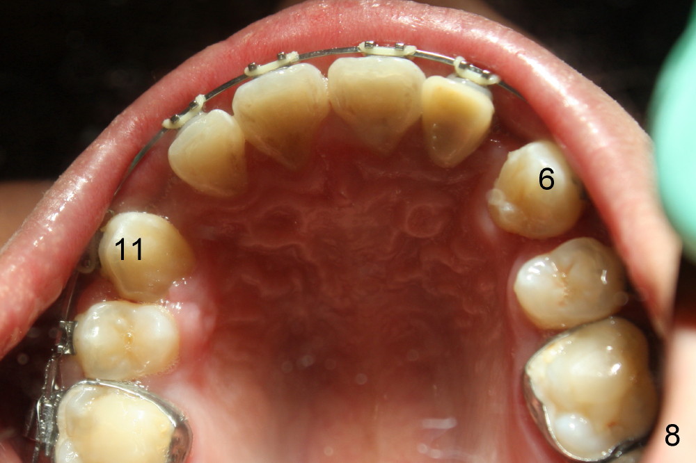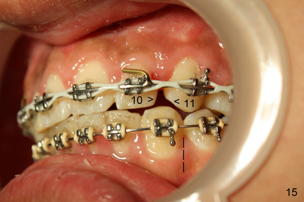 Fig.13-15 shows the upper incisors totally 4.5 month of retraction. The upper left canine (Fig.15: #11) seems to be distalized too much, as compared to the dashed line. Therefore whole arch power chain is placed with an intention to bring the canine mesially (arrowhead) while continue distalizing the incisors (including #10 (arrowhead).