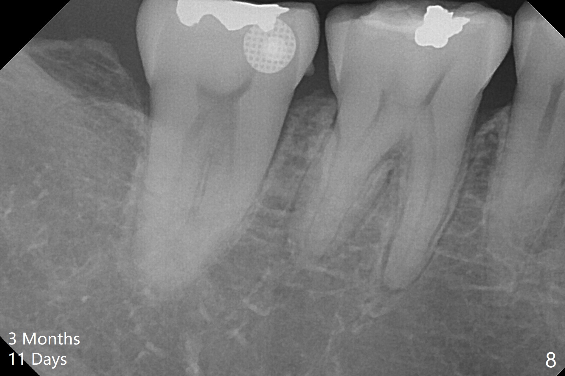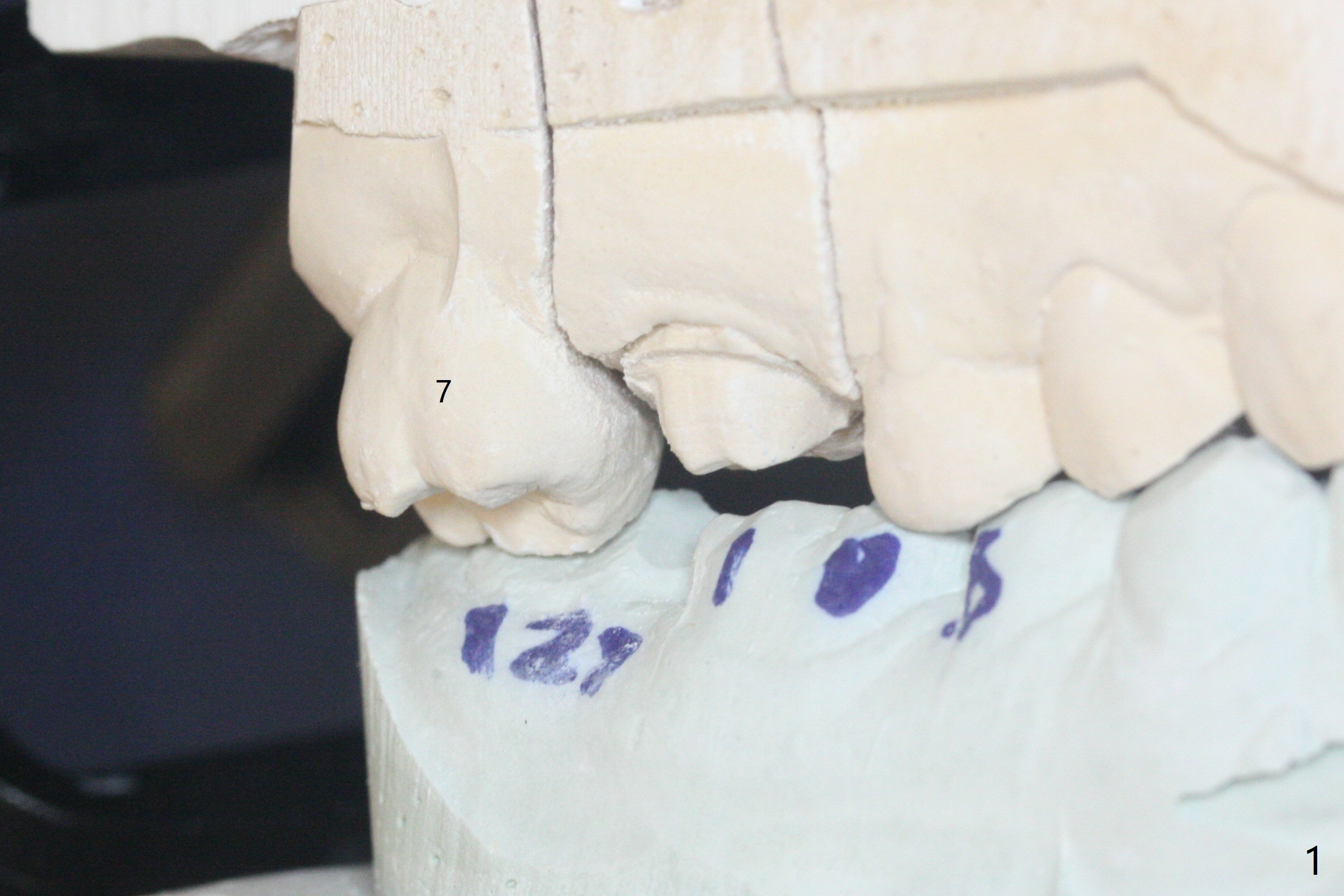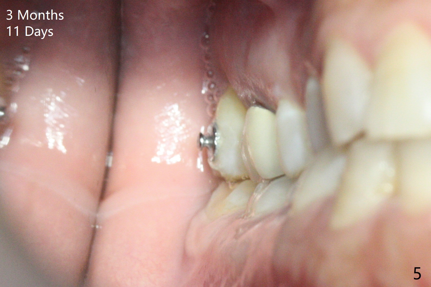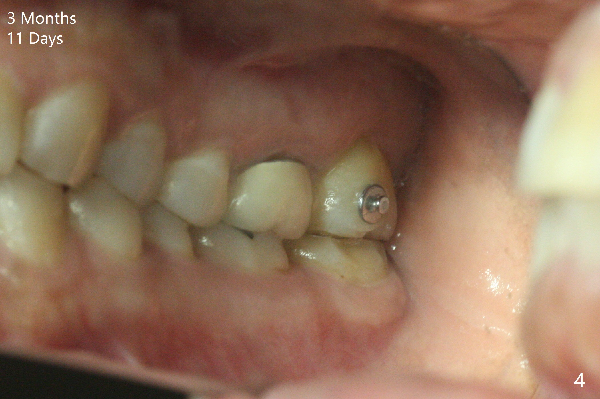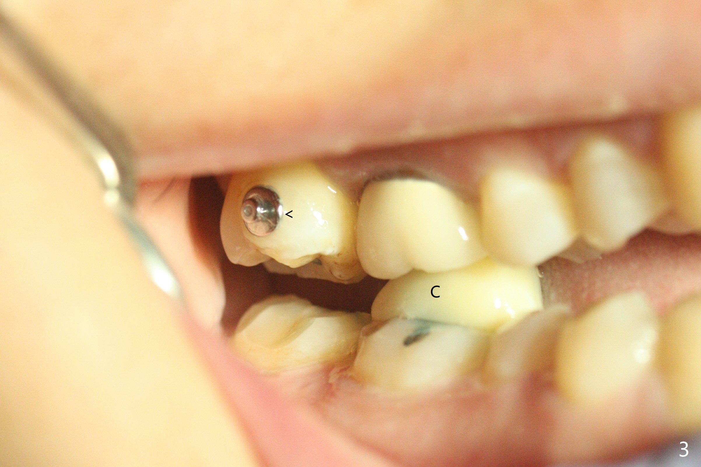 A 51-year-old woman agrees to correct cross bite of R7s 10 years post UR6 crown (Fig.1,2). Composite is placed in LR6 (Fig.3 C) and LL7 for clearance. Lingual buttons are placed in the buccal surface of UR7 (Fig.3 <) and lingual surface of LR7 (Fig.6 ^) with 6 oz. elastic in between. Cross bite correction finishes in 3 months. Photos (Fig.4-6) and PAs (Fig.7,8) are taken 11 days post orthodontic treatment.