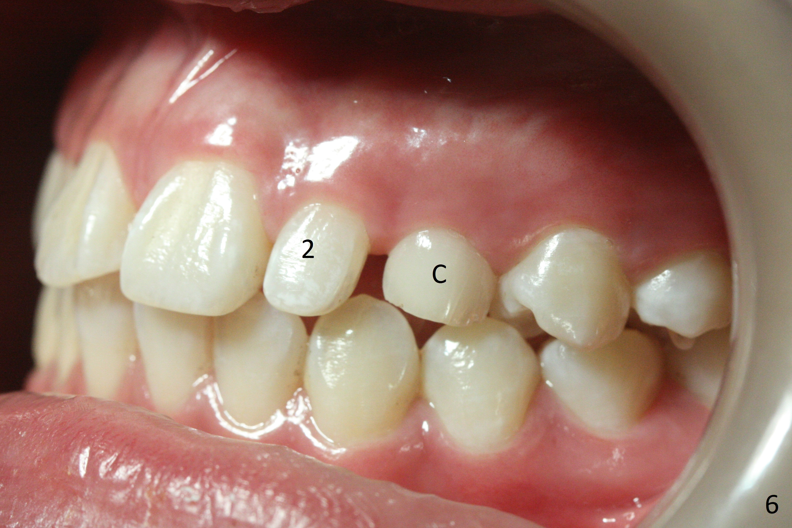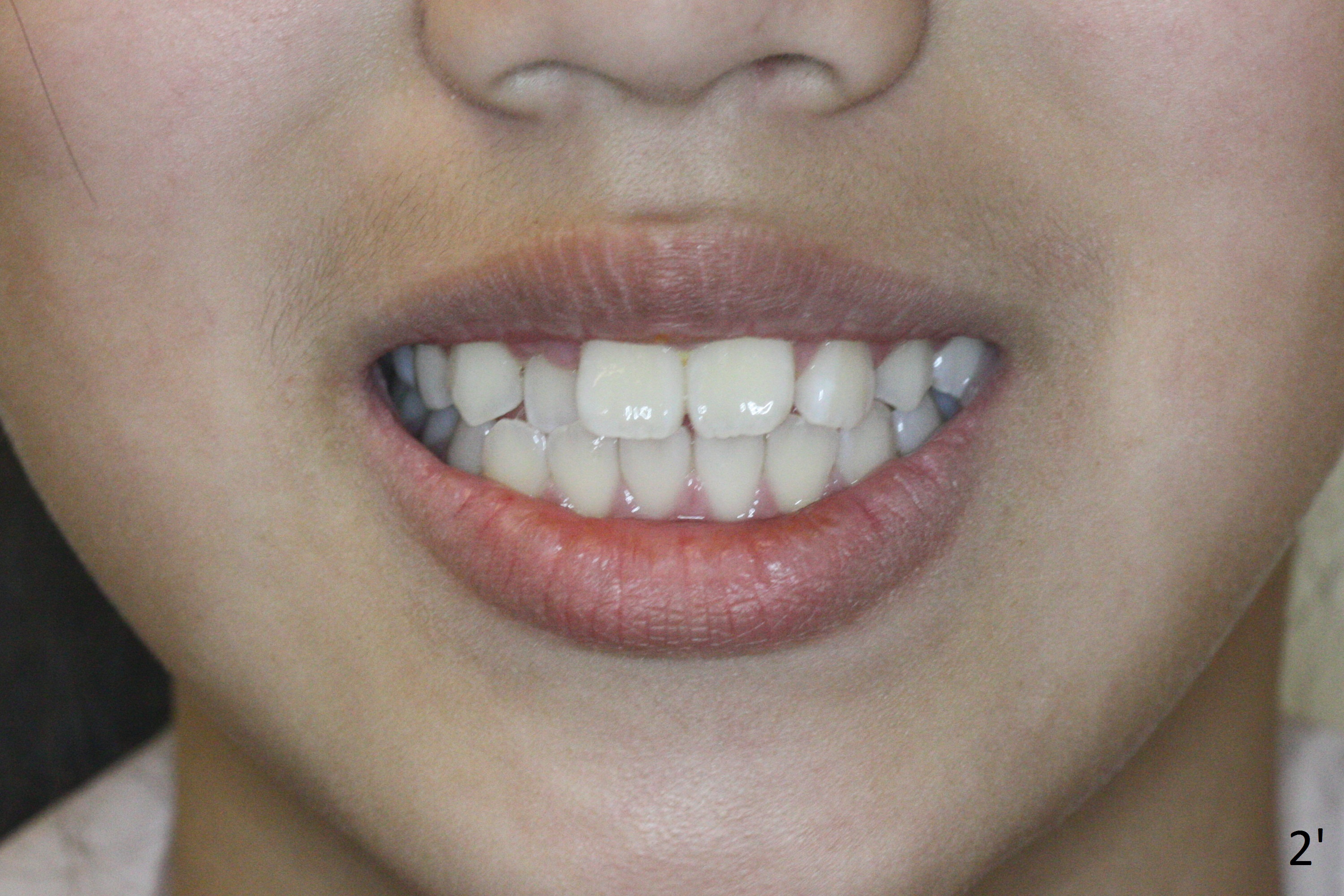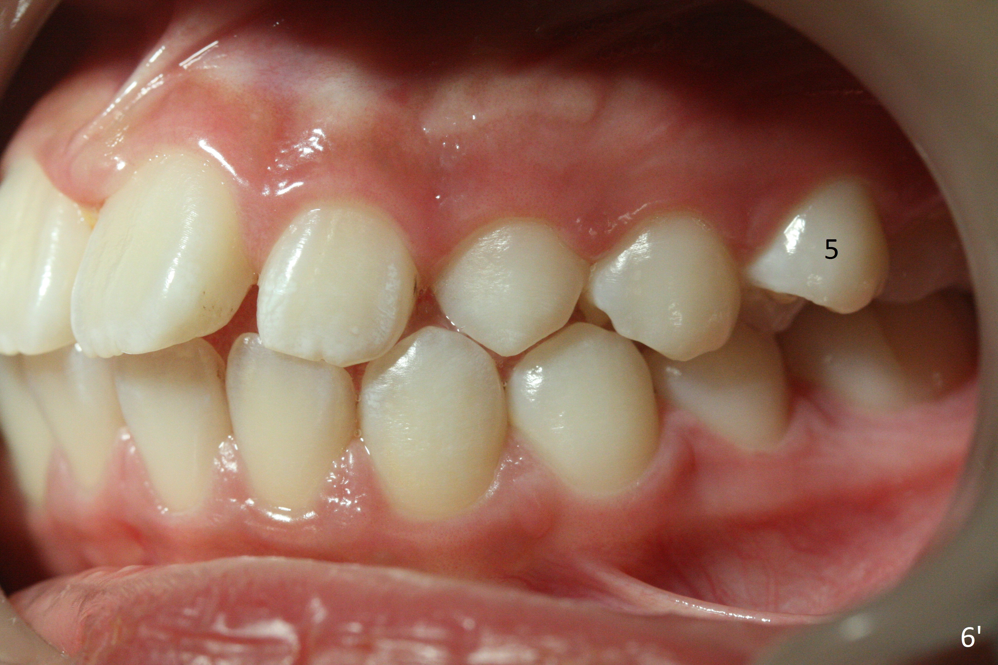 Two sisters (Sophia, 13 years old and Selina, 11) present to clinic for orthodontic treatment. Dental anomalies of Sophia include microdontia of the upper lateral incisors and congenital missing of the upper right permanent canine (Fig.5,6). For Selina, the upper right lateral incisor (Fig.5') and the upper left second bicuspid (Fig,6') are in cross bite.