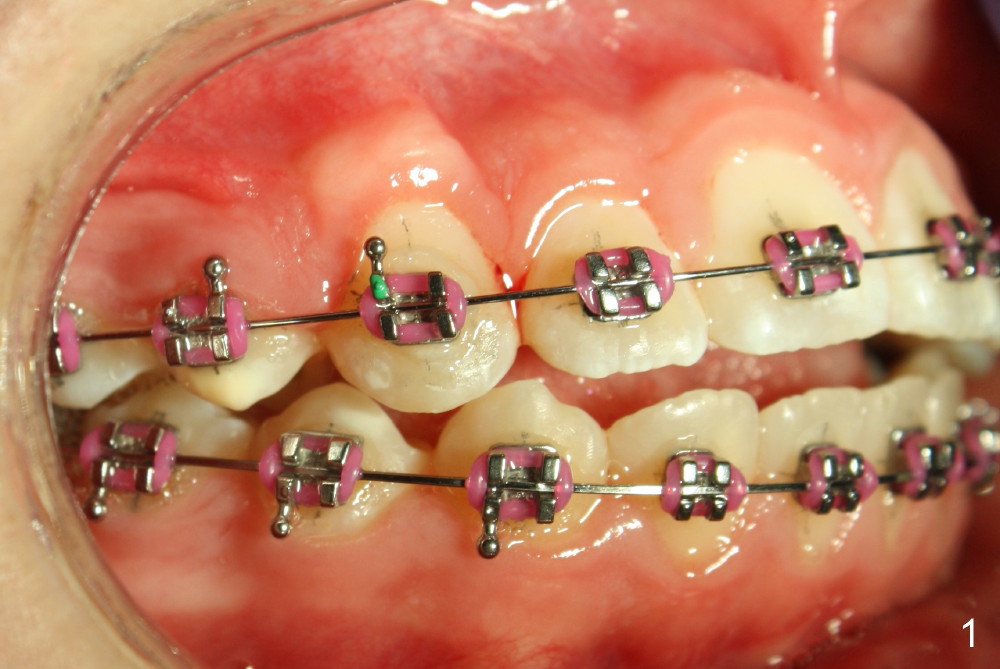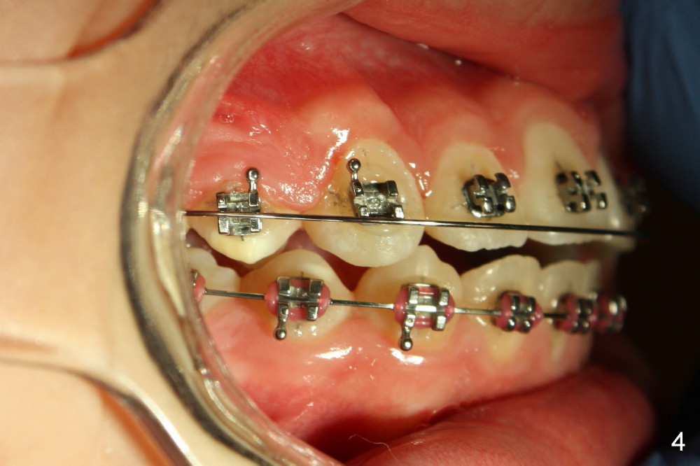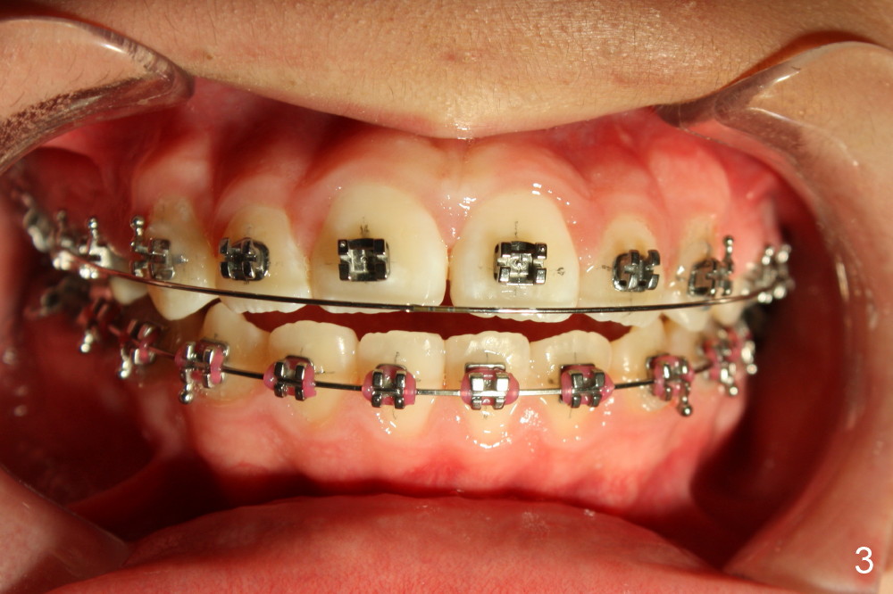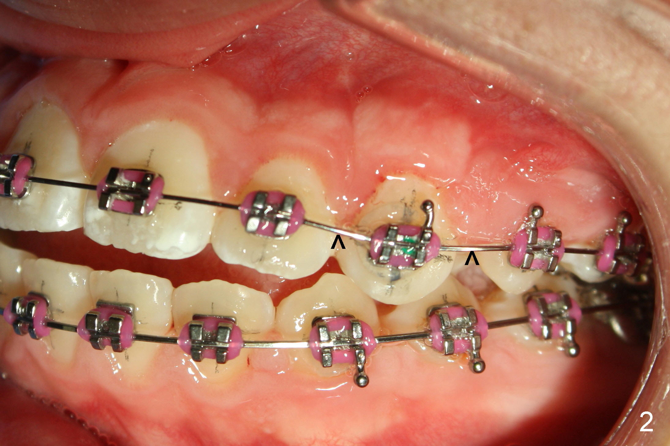 Open bite is aggravated probably due to bracket design/placement and wire manipulation. The first step is to re-bracket UL 3 (Fig.2), as evidenced by bending (^) of .016 ss wire. No rebracketing is done for UR3 (Fig.1).