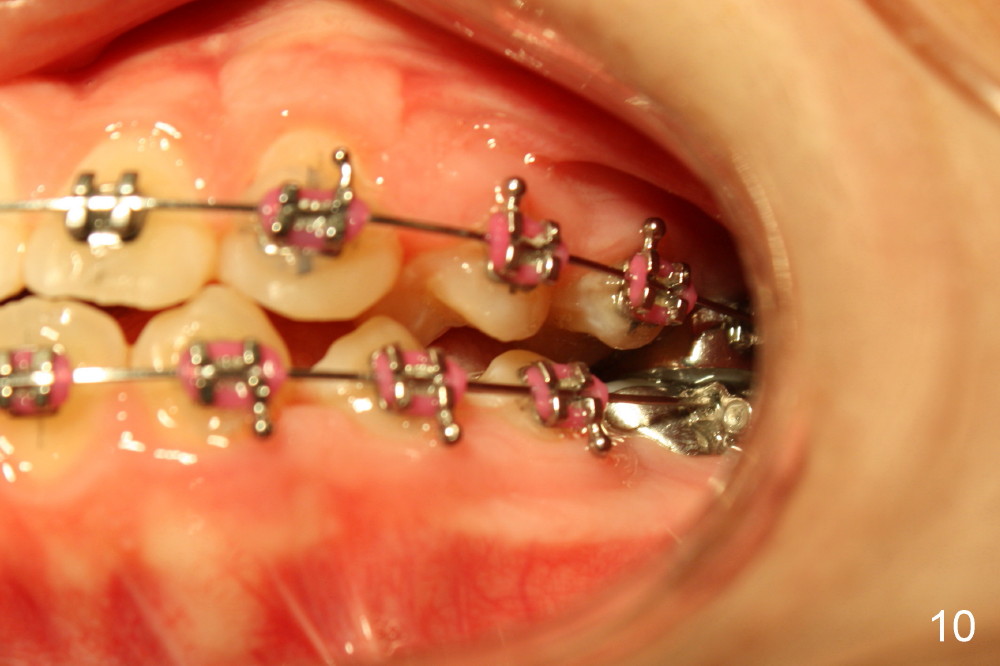Two months later, the anterior open bite improves (Fig.9,10). The lingual tilting of #19 also improves (Fig.10). Upper wire 16x16 (reverse curvature), Lower 16x22. Finally extraction appears to be necessary.