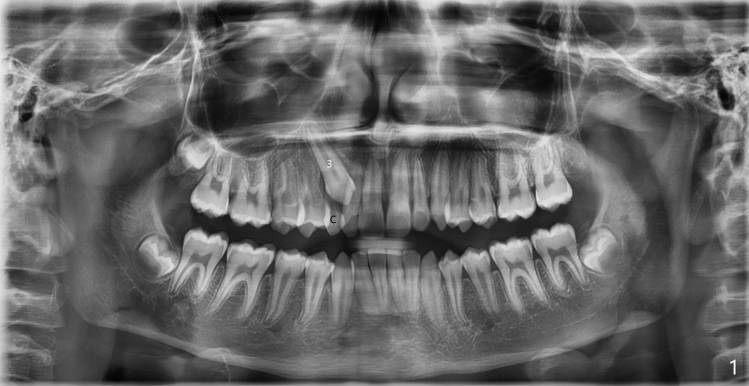A 12-year-10-month-old man presents to clinic for new patient examination. The upper right deciduous canine retains while the upper left permanent canine has erupted. His profile is normal. What is sequence of diagnosis and treatment?