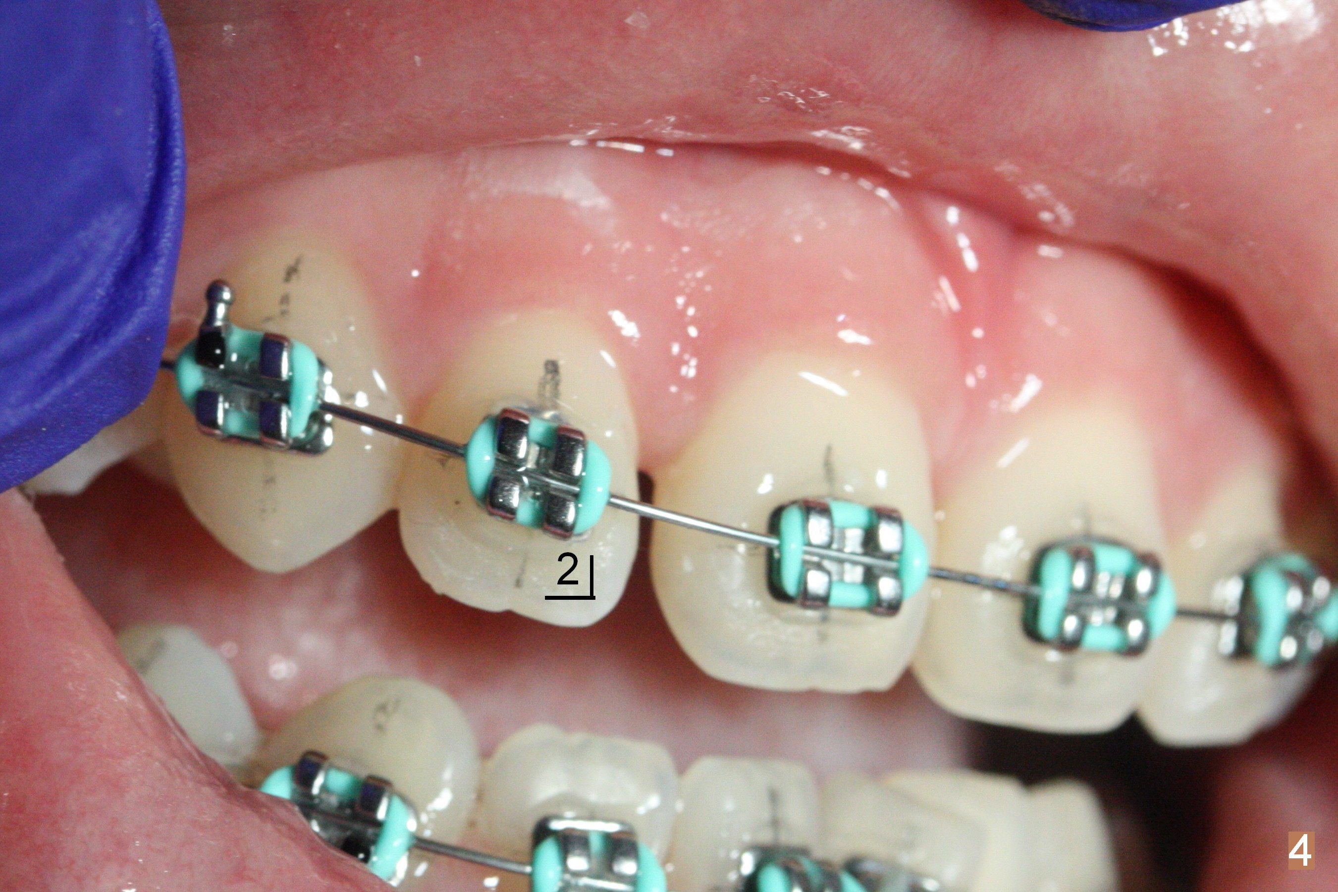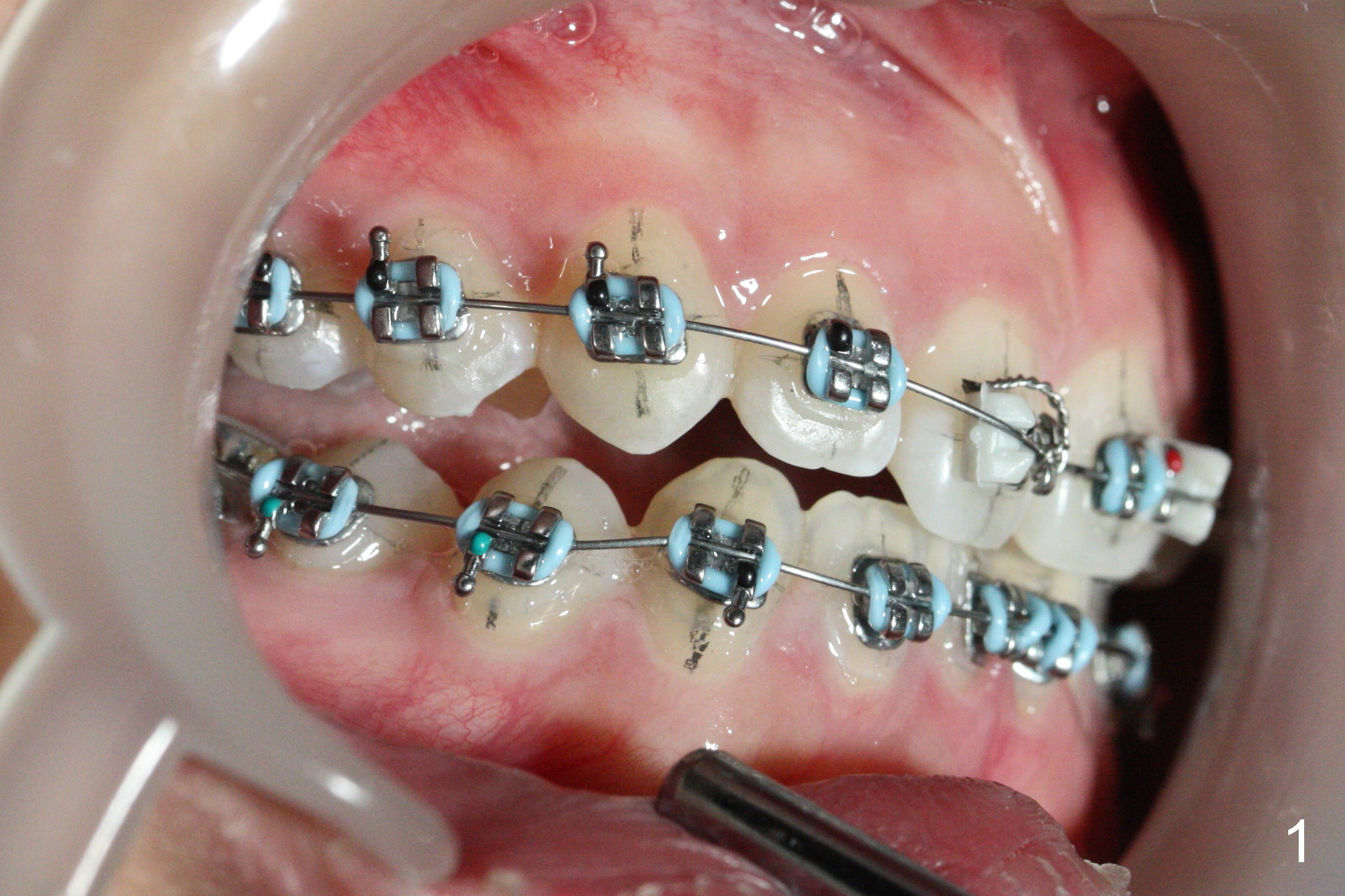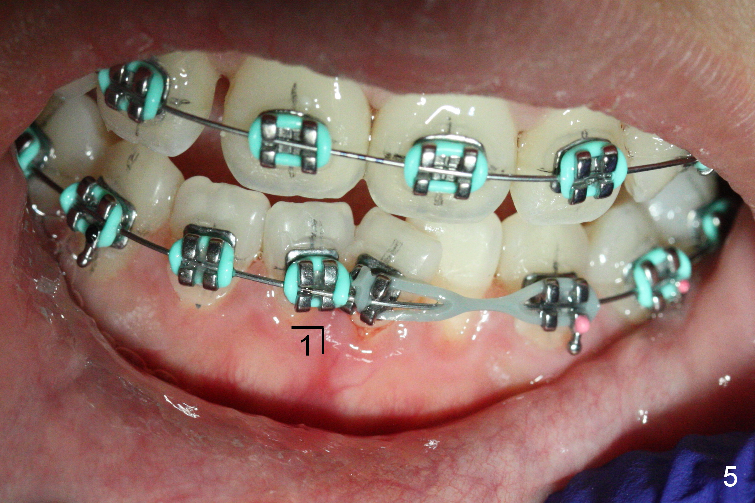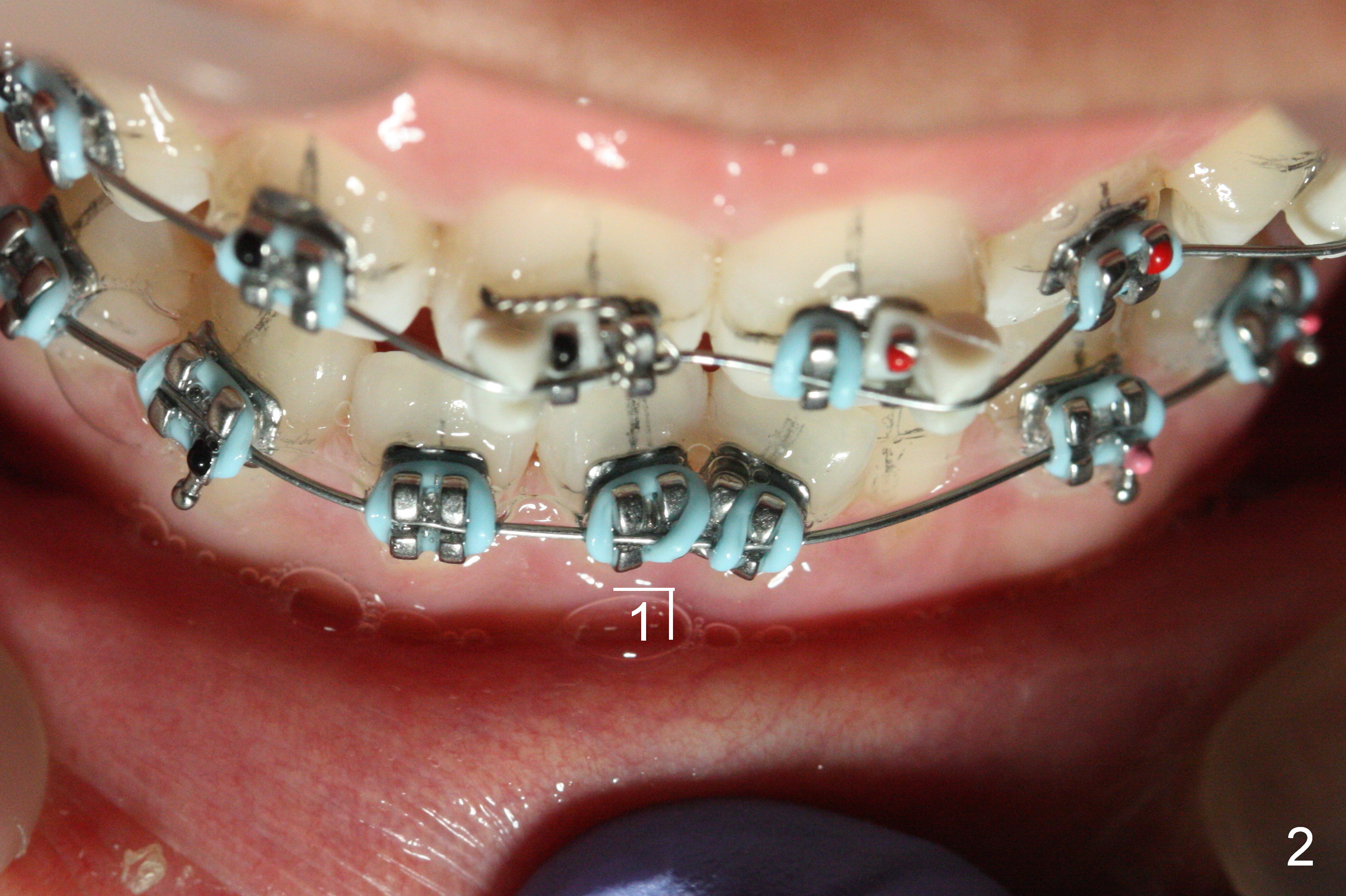 The second issue for this case is crowding of the lower incisor. There is no space between brackets LR 1 and LL 1 so that the alastiks at the sites are not fully engaged (Fig.2). Ideally the bracket at LL1 should be not placed initially. When there is severe crowding, lines for each bracket should be drawn. Brackets should be tried in without application of bonding material. What will happen in this region next appointment?