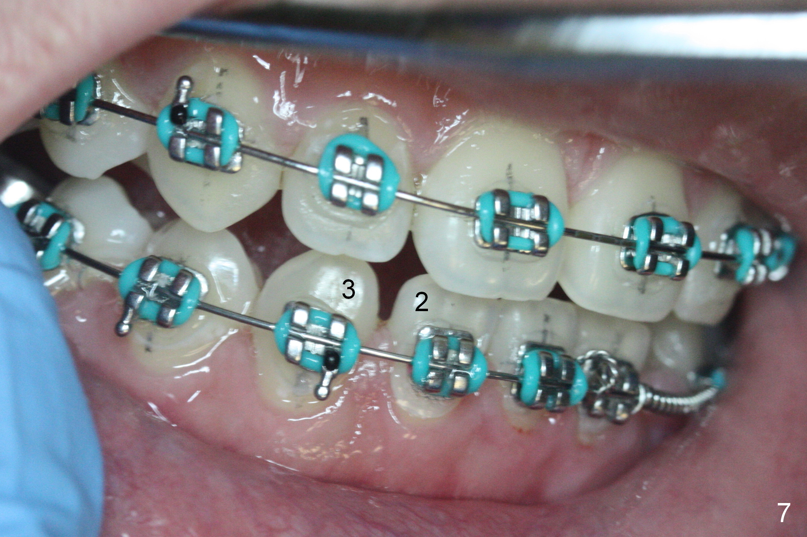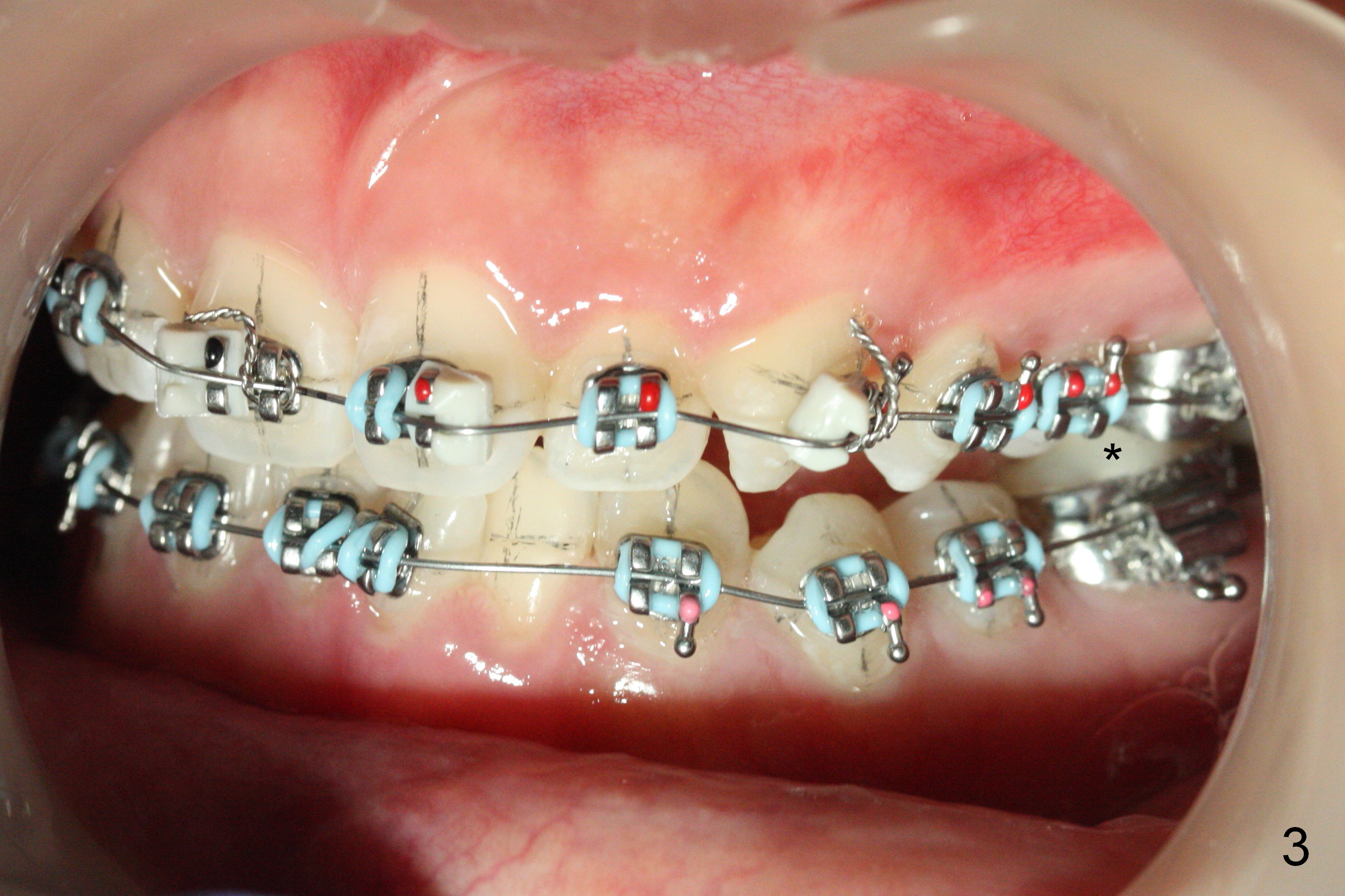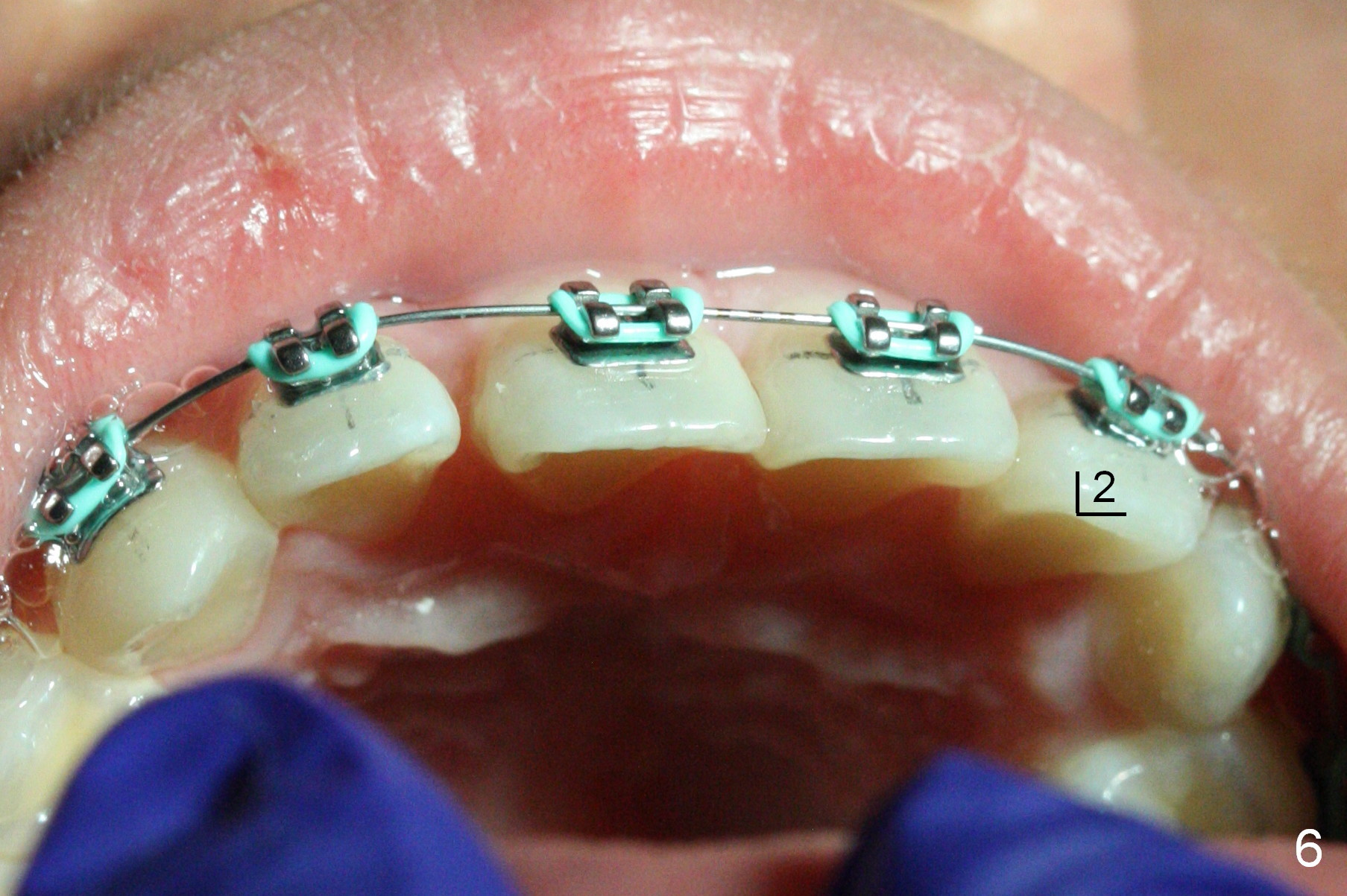 Twelve days post banding, UL2 is buccoincisally displaced due to the presence of the rotation wedges at UL1 and 3. The latter are removed.