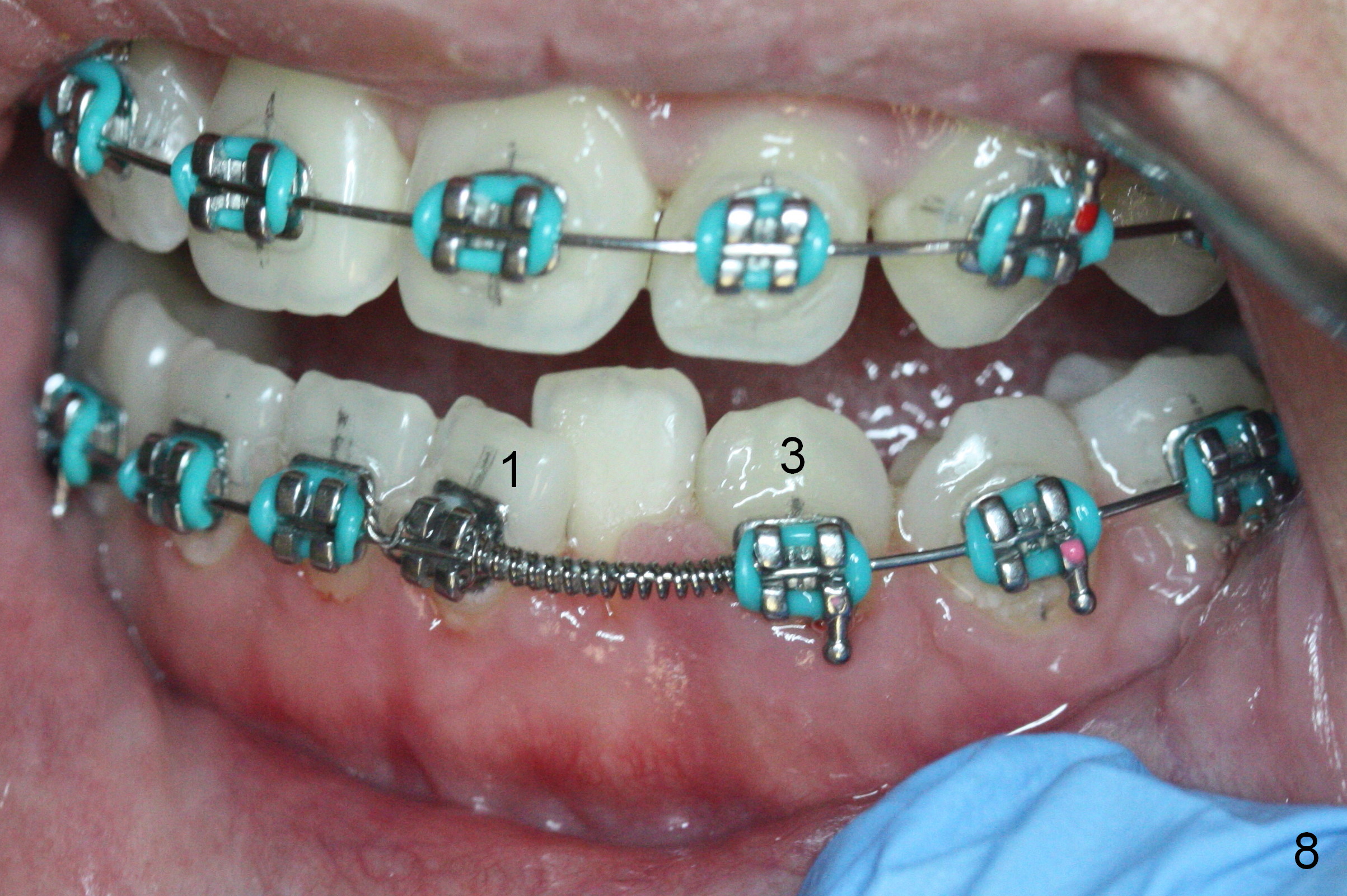 Diastema appears between LR2 and 3 (Fig.7) 2.5 months post banding, while open coil spring is placed between LL1 and 3 (Fig.8). Due to tension between LR 6 and 7 while insertion of 18 SS wire (saved), the lower 16 niti wire is reused whereas the upper wire is changed to 18 ss (Fig.7,8). Two rules are violated in this case. Stiffer wire (18 ss) should be used while placing open coil spring. Ligature wire has to be used to engage an open coil spring (Fig.8: 1). The advantage of using softer wire is easy engagement to LL2 bracket when the space is created. Using alastik in LL3 is convenient. In the next few appointemtns, we will detect any adverse effects of rule violation. In fact alastik holds the wire in place without any ill effect.