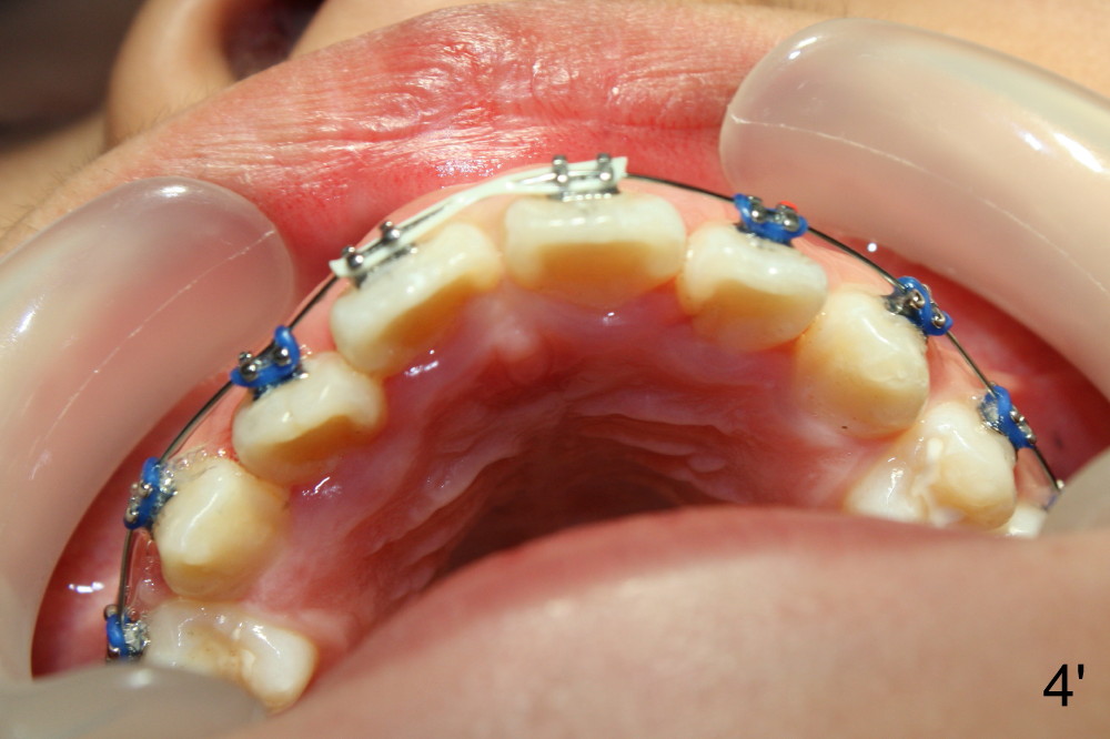 The upper arch is more rounded one month of orthodontic treatment (Fig.4'). UR1 rotation (Fig.4) is corrected (Fig.4'). The rotation wedge was removed; power chain was placed between U1s to close the diastema and make room for UR2 to move labially.