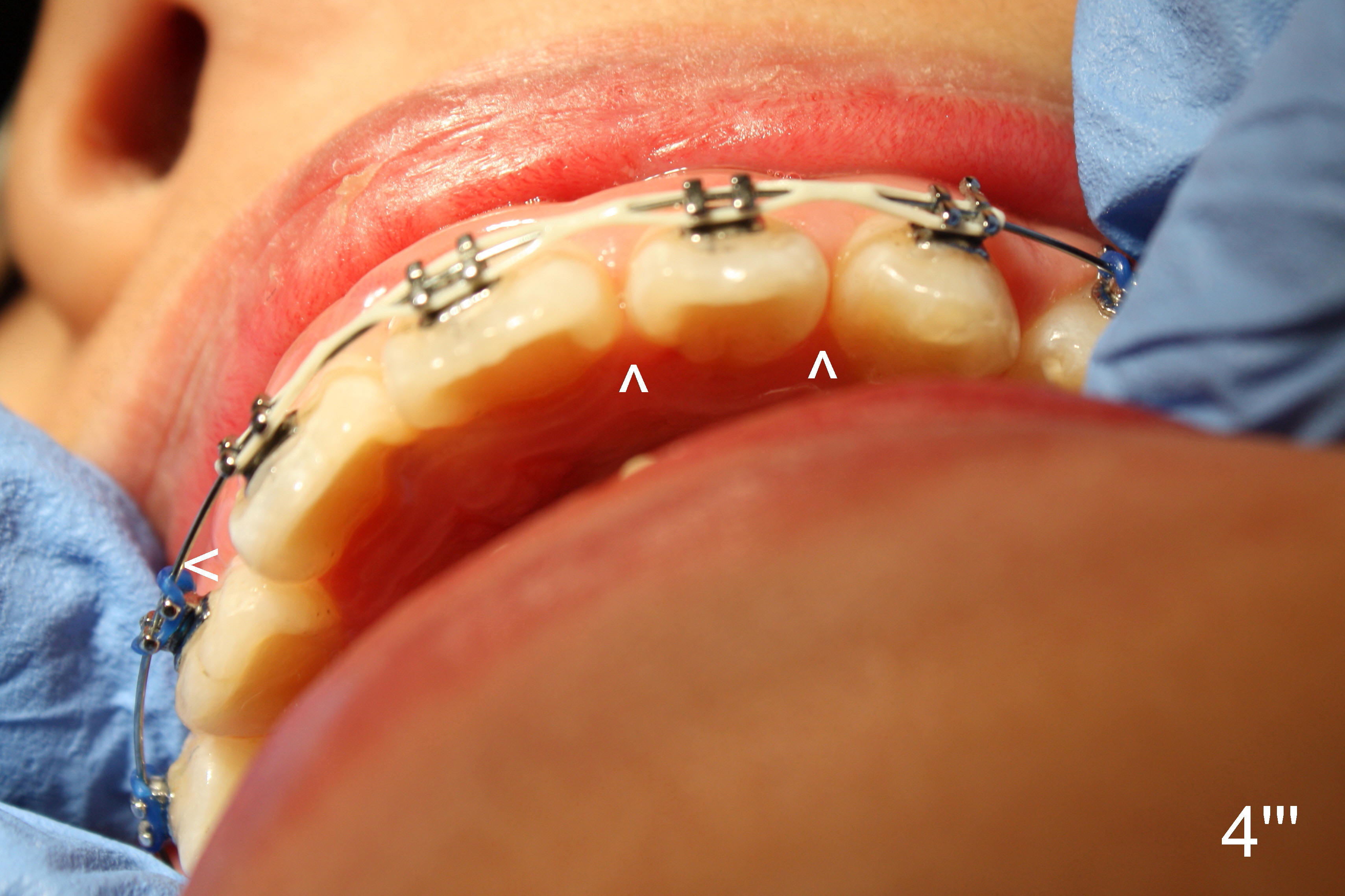 In fact, the patient returned earlier, because UL 5 bracket was loose. There were still spaces among UL 1-3 (Fig.4''': ^). The arch wire did not engage completely into the mesial slot of UR2 bracket (<). Therefore, power chains were placed among UR1-UL3 using the latter as an anchorage. It is hoped that UR2 will get extra space mesially for rotation correction.