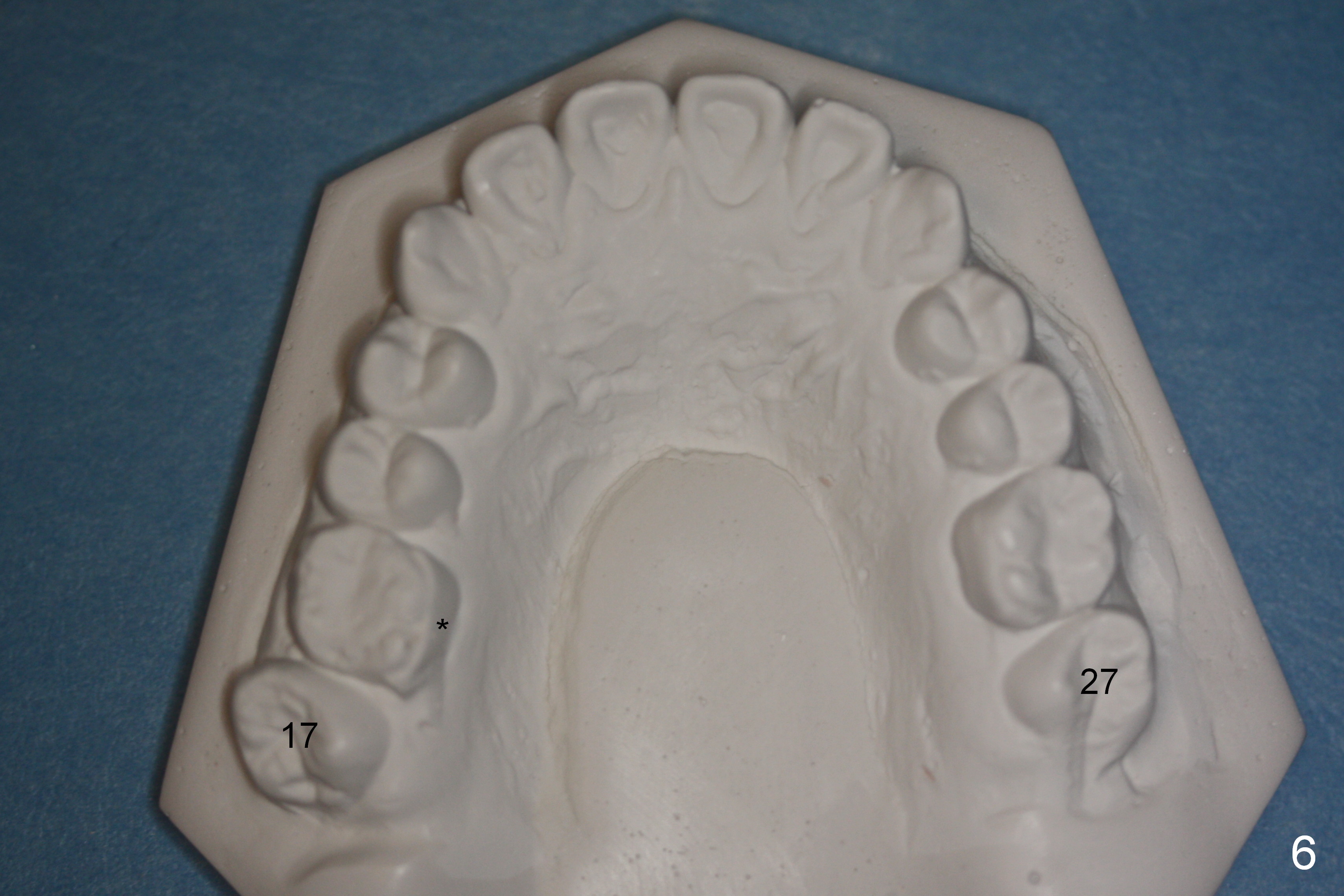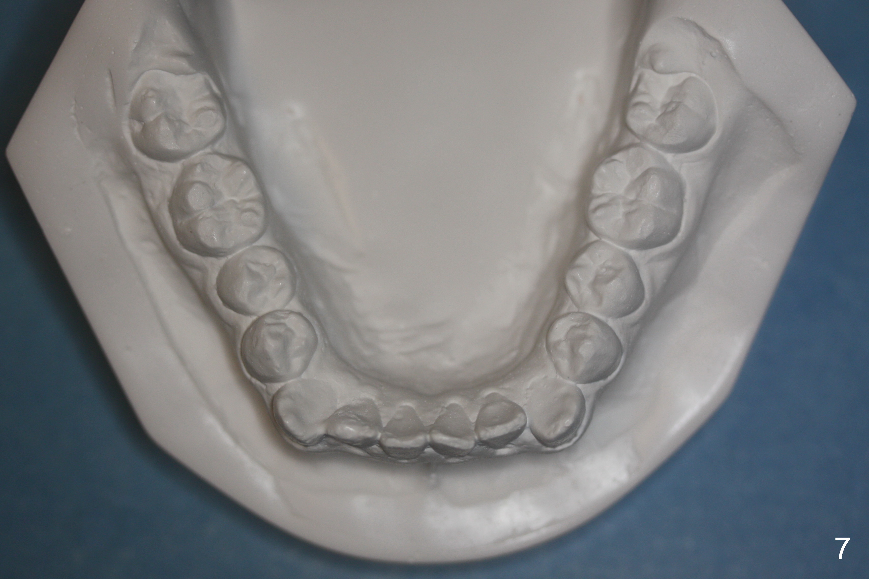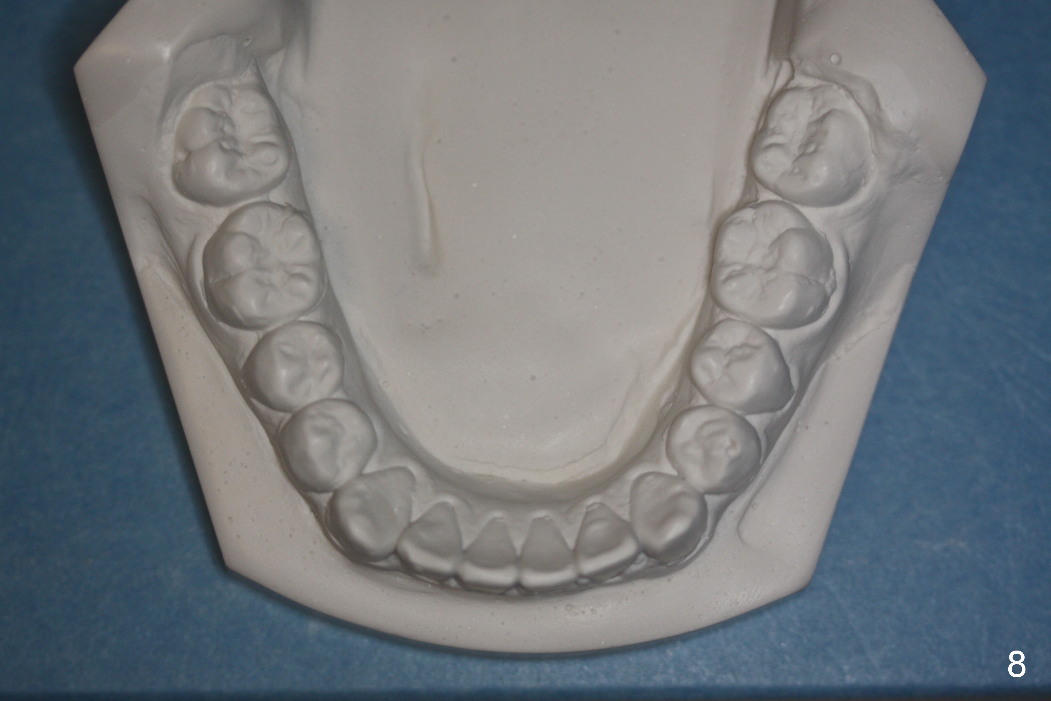 Phase II orthodontic treatment for a male lasts 3.5 years (from 13 years old to 16 years 8 months). The upper right lateral (Fig.2: #12 (pronounced one two)) needs more torque; it would be the best to place brackets upside down for both #12 and 22. Study the angulation and position of the blocked out lateral (Fig.5) carefully initially and have a good plan. Use power chains longer period of time so that the upper incisors do not look protrusive (Fig.4) with no space between them (Fig.2). Due to noncompliance, the upper 2nd molars are not re-positioned correctly (Fig.6 (#17,27)). The cement should have been removed prior to impression for postop model and retainers (Fig.6 *). The alignment of the lower arch, especially anterior segment, is impressive (compare Fig.7,8), to the patient's mother as early as after phase I treatment.