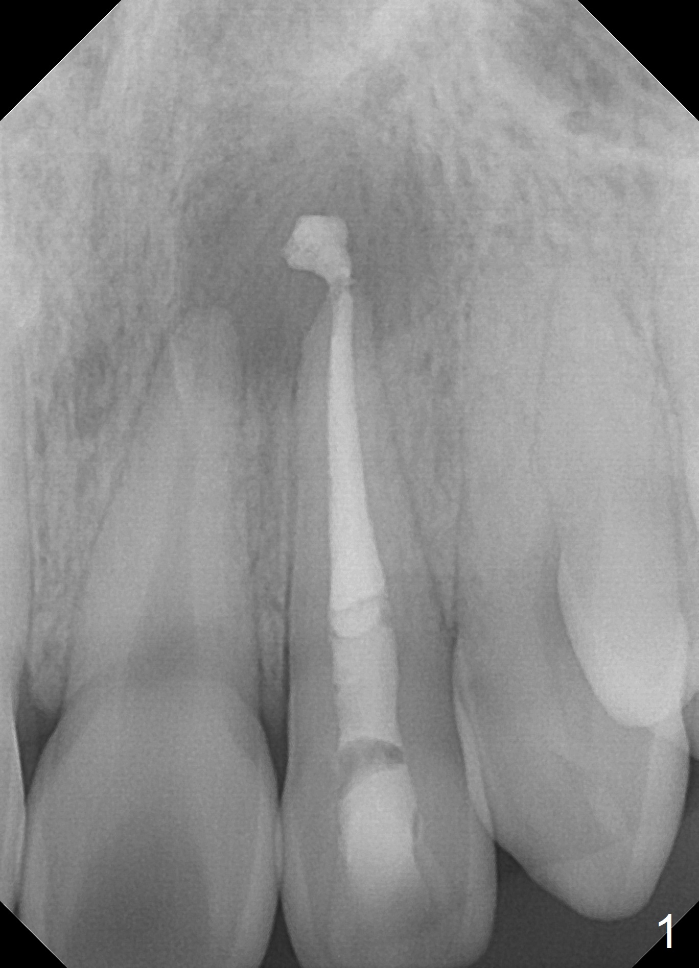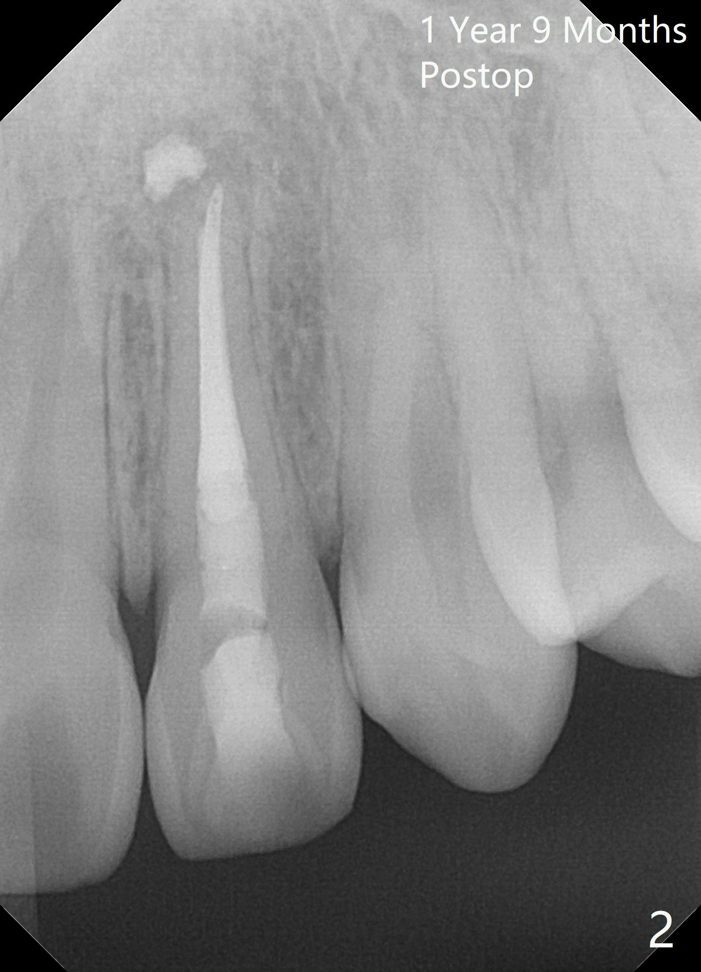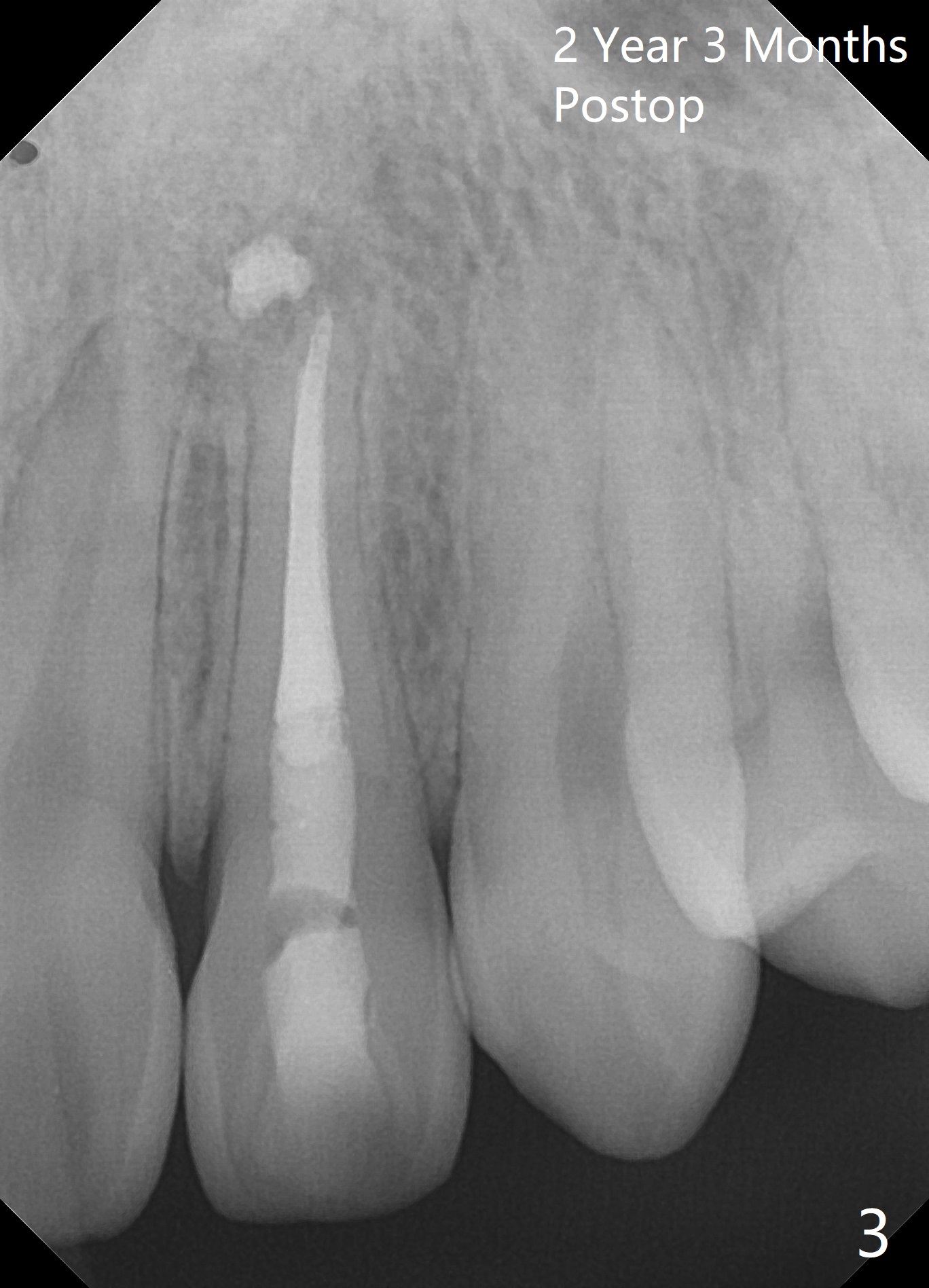 A 18-year-old man develops acute apical periodontitis at #10 several years after phase I and II orthodontic treatment. Fig.1 is taken immediately post RCT with #70 master gutta percha (GP) and 2 medium and 1 fine fine accessory GP. Periapical radiolucency reduces 1 year 9 months postop (Fig.2). The patient reports occasional tingling 2 years 3 months postop (Fig.3).