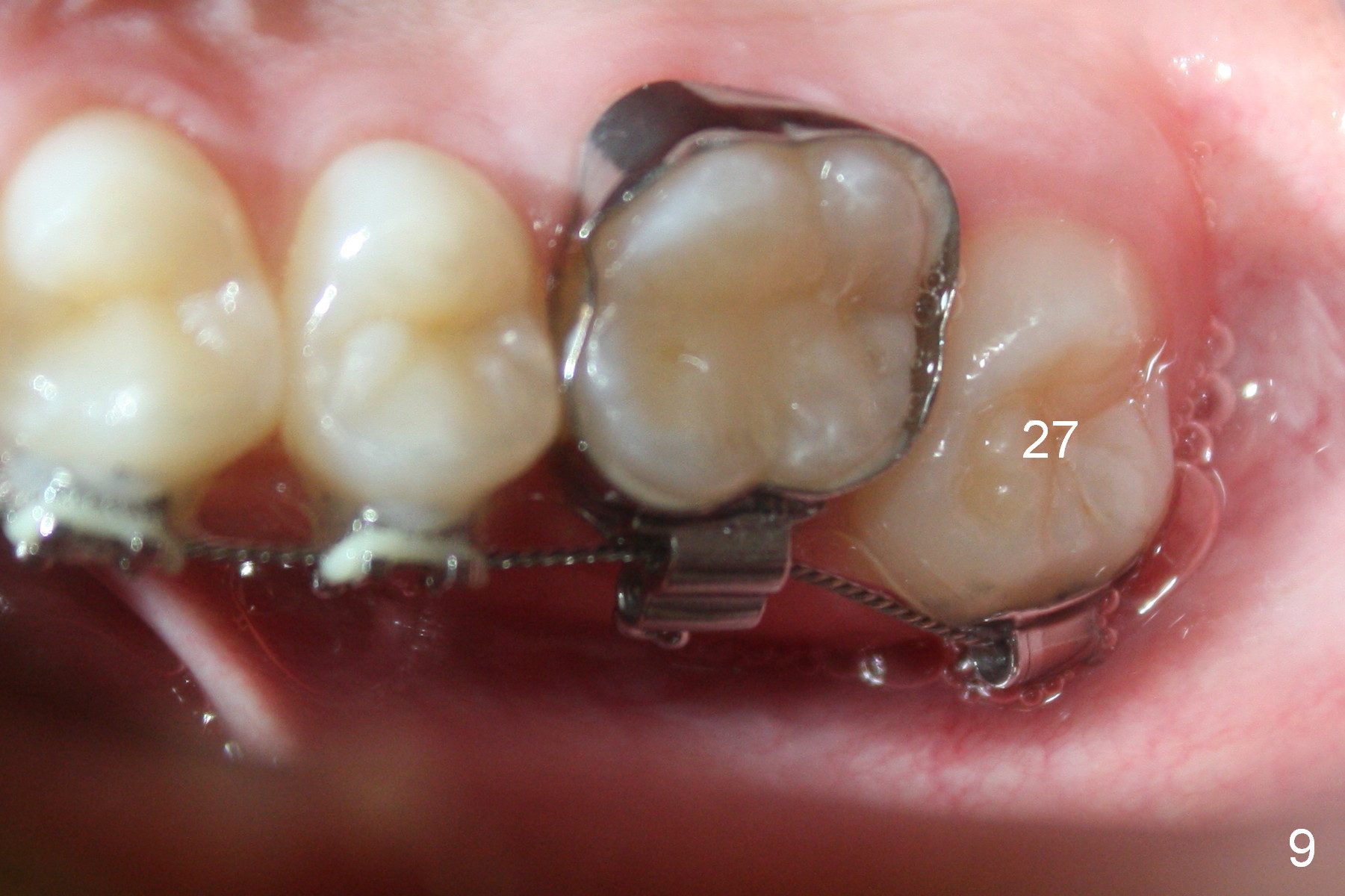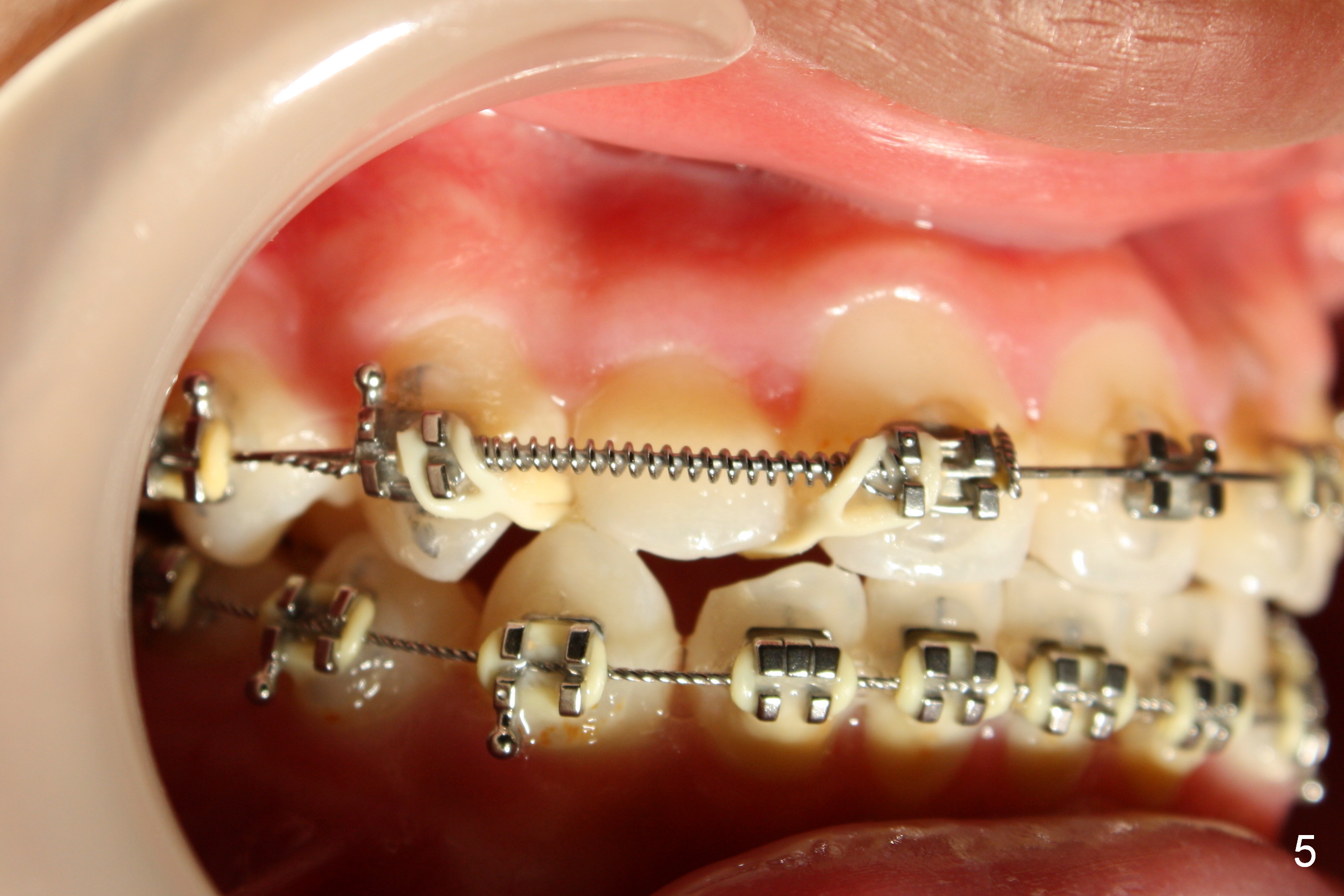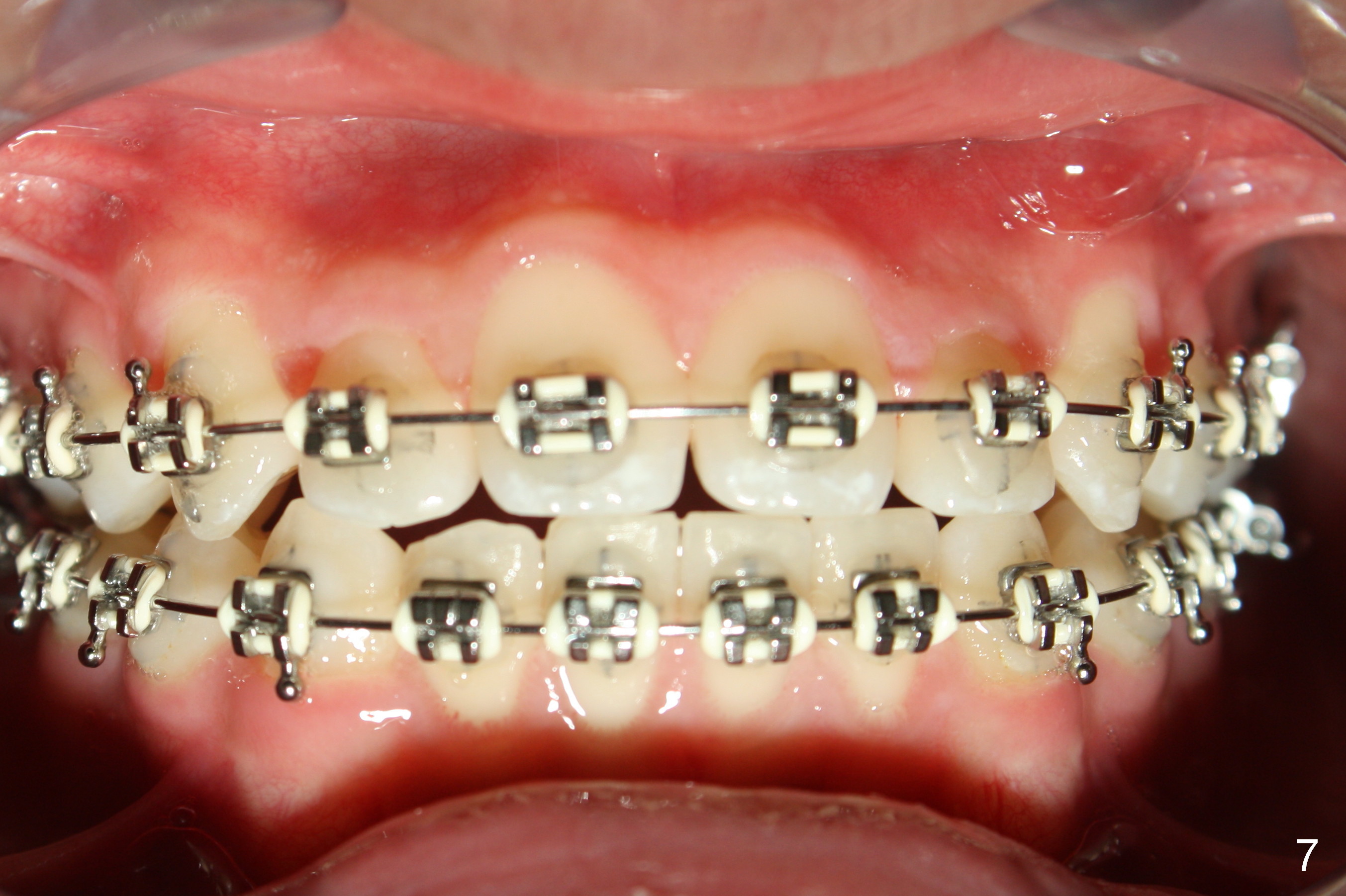 Another issue is late eruption of 2nd molars (Fig.8,9 (17 (one seven),27 (two seven)), 16 months post bracketing). The patient is not compliant with wearing elastics. The final result is not ideal.