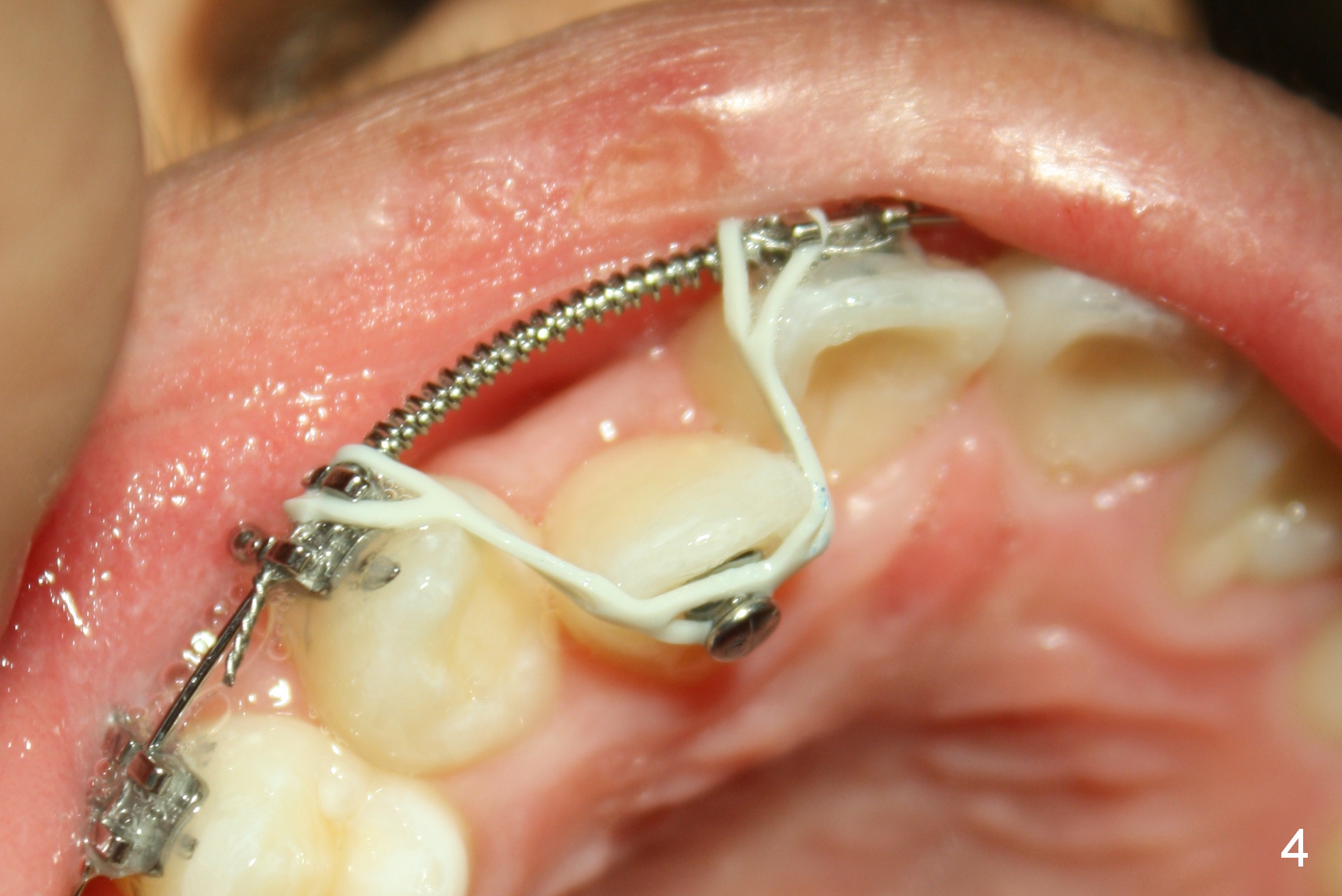 Two years after phase I treatment, cross bite relapses (Fig.1,2): the right lateral (12, pronounced as one two (not twelve)) in cross bite, while the left one (22, two two (not twenty two)) in edge to edge. One year and a half later (13 year old male), phase II treatment starts without a bracket on 12 (Fig.3). Two months and a half later (with open coil spring in action for a month (space increases, but not enough), a lingual button is placed on 12 with power chain x5 (sling shot, Fig.4 (lower banding starts)). In 2 months, the cross bite is corrected (Fig.5,6). A bracket is then placed on 12. In fact the bracket should have been placed upside down to avoid torque later on; so is for 22. A second problem is minimal over bite for incisors (Fig.7 (22 months post banding)). When the upper canines are more cervical than the incisors (Fig.1,3), bracket placement differential should be .5 mm, in stead of 1 mm.