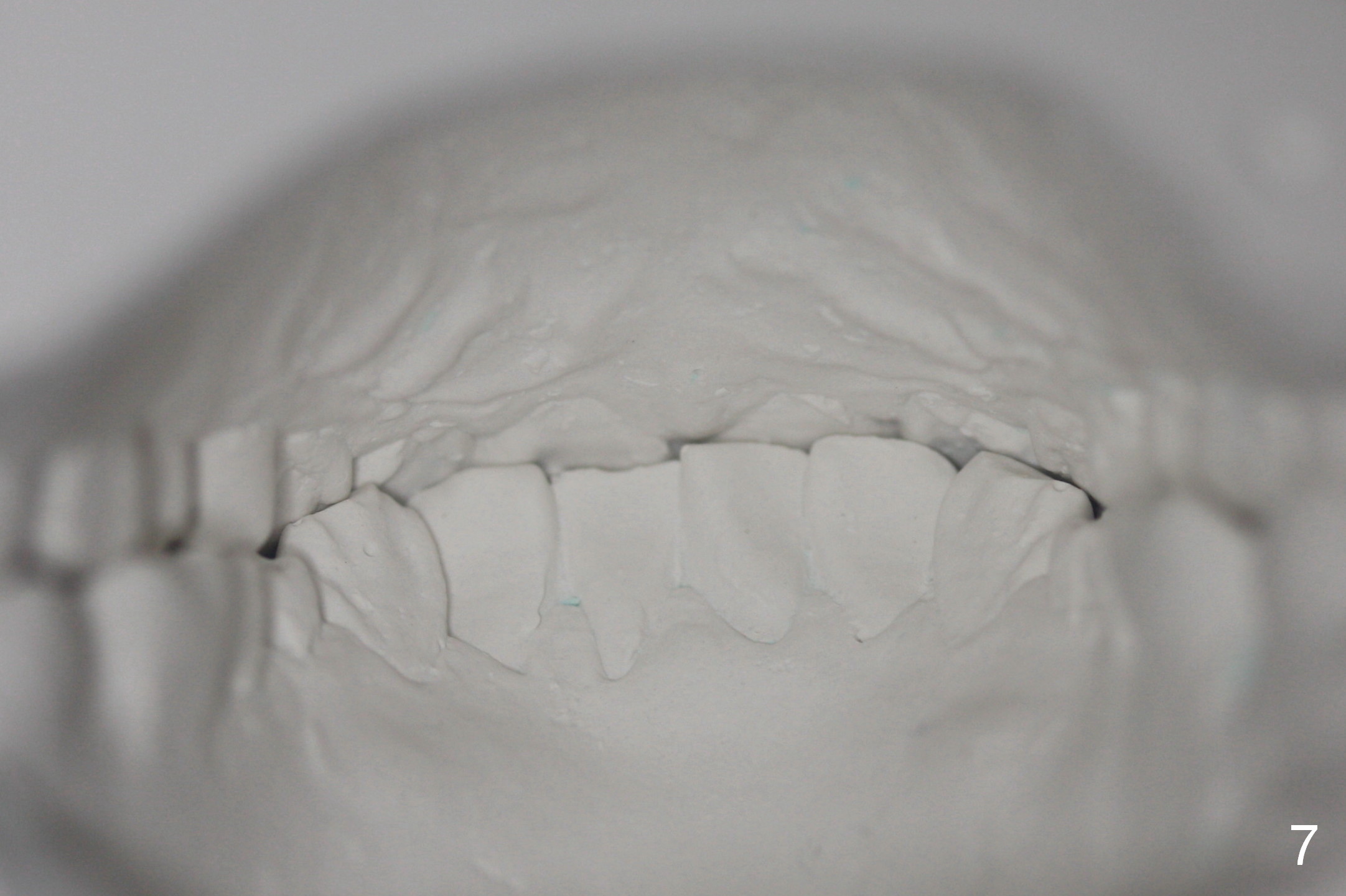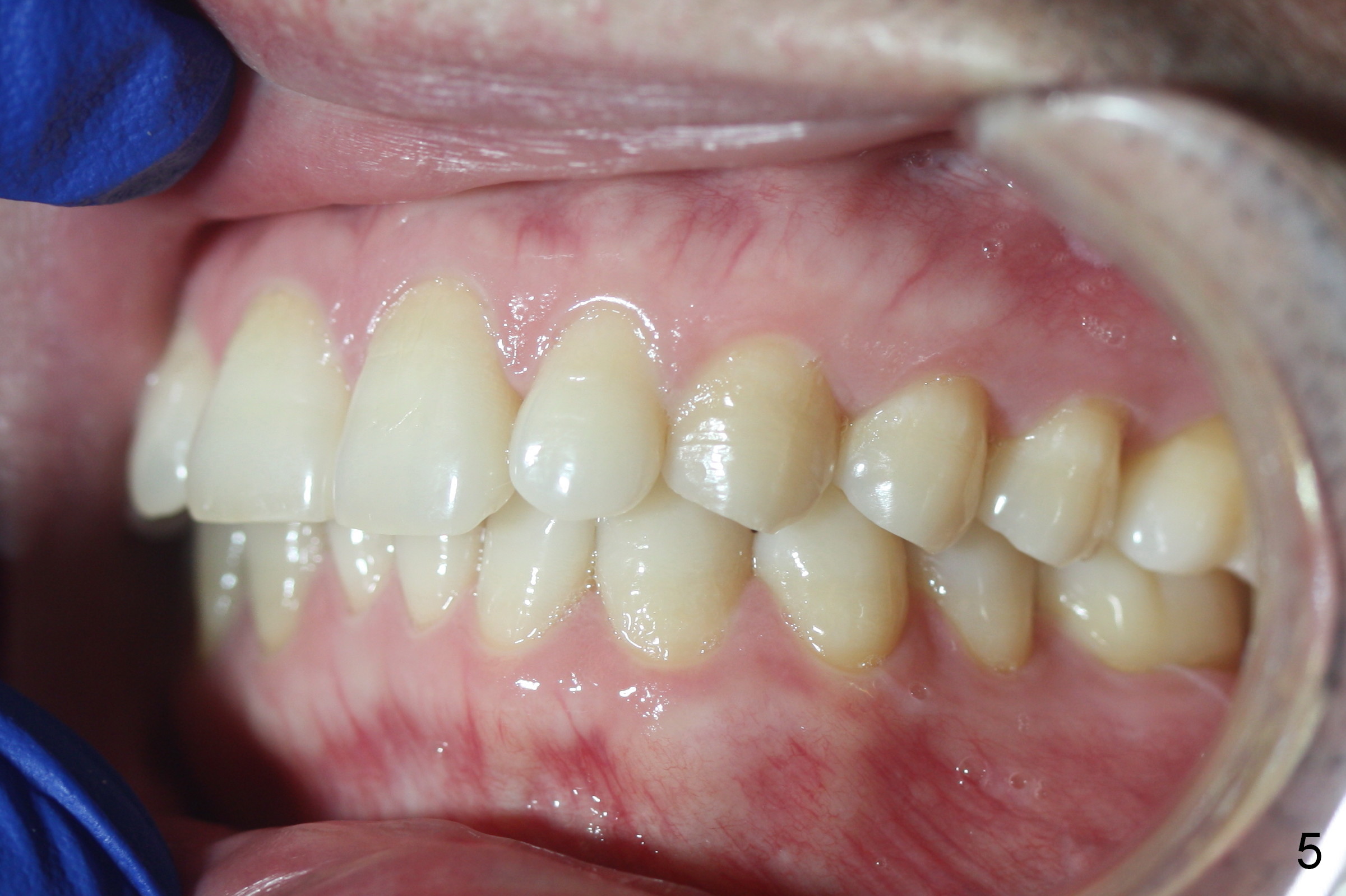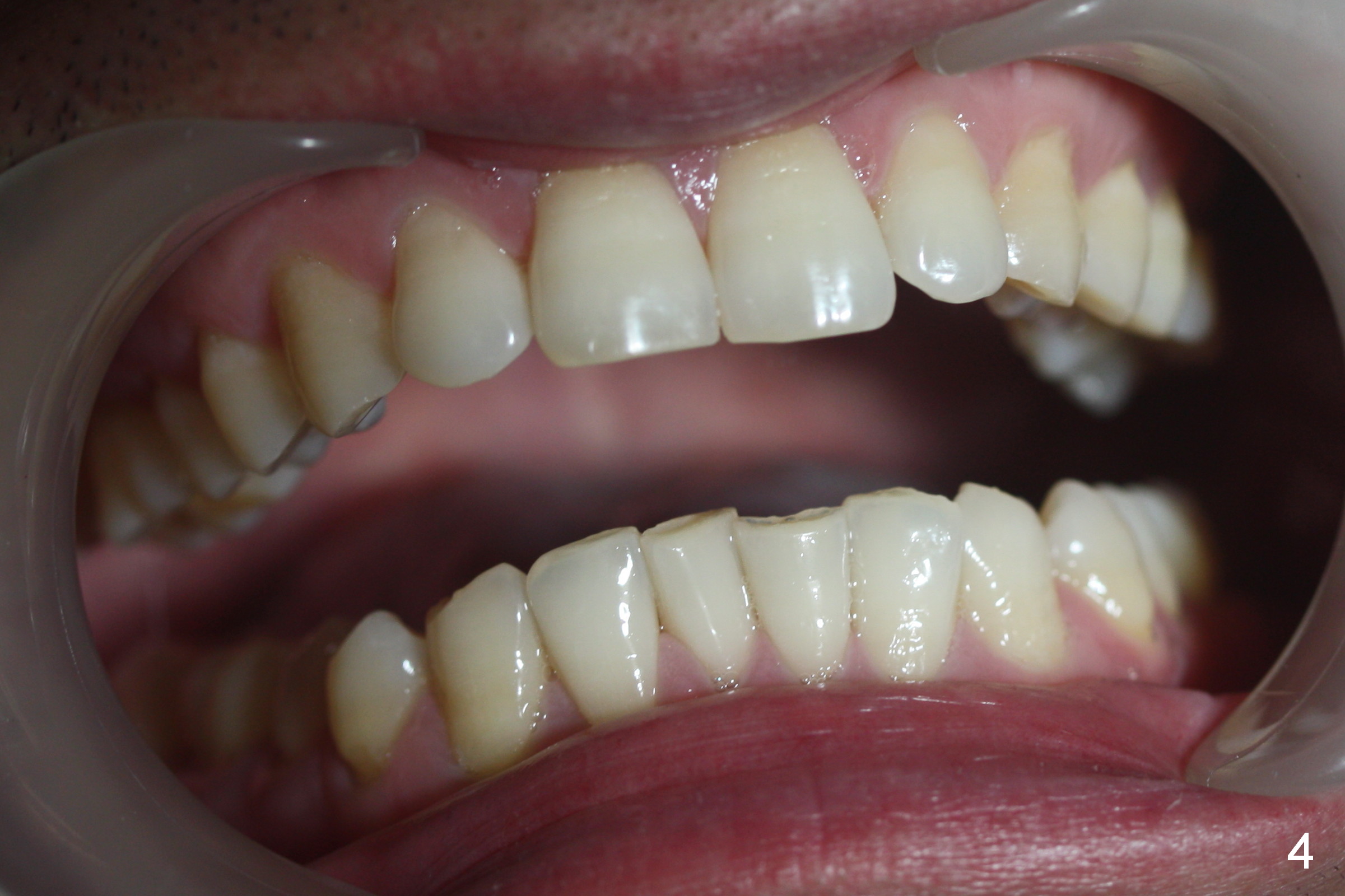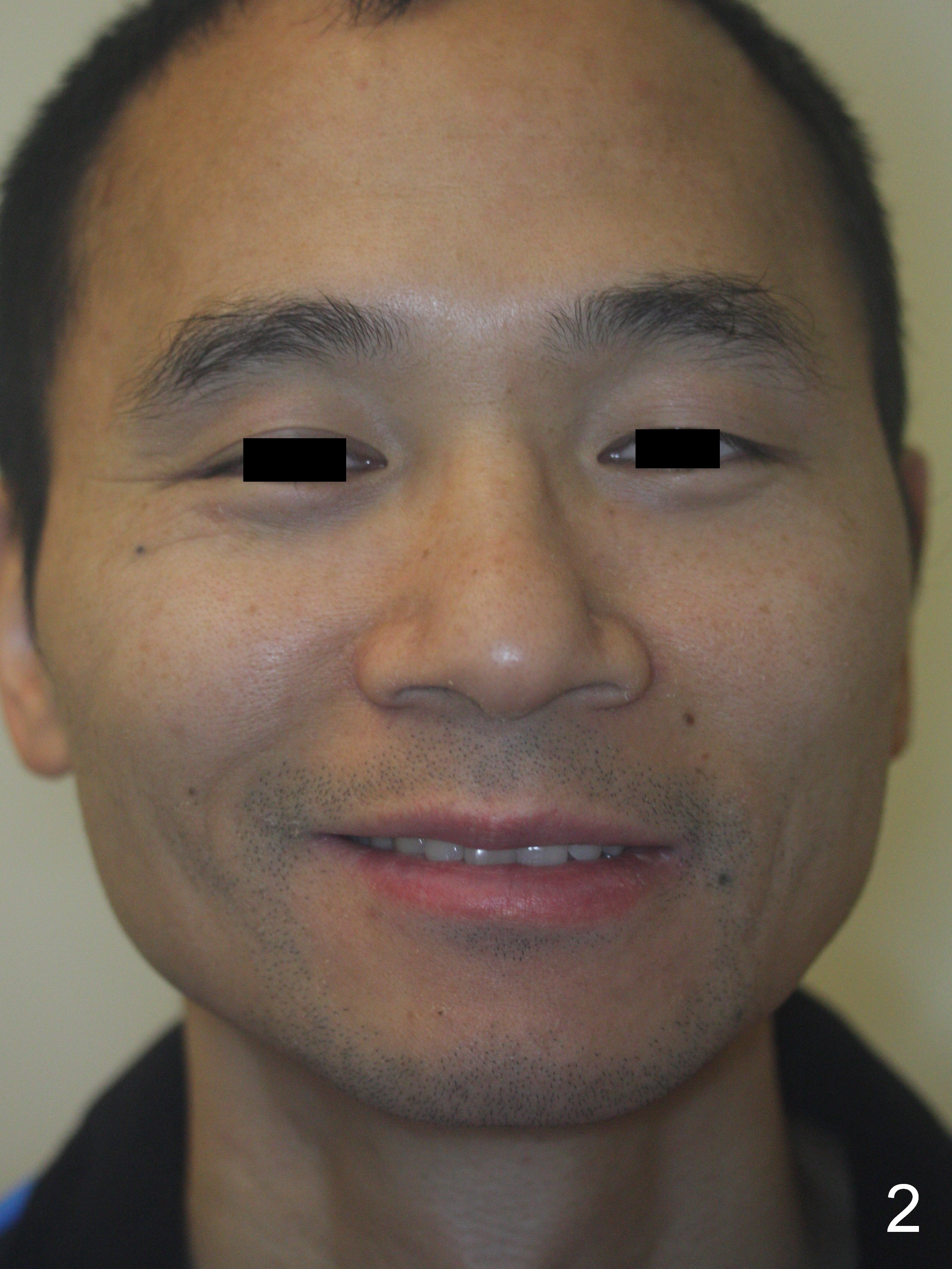 A 42-year-old man requests orthodontic treatment after extraction of the teeth #1, 16, 17, and 32, because it is easier for him to maintain oral hygiene post extraction. He thinks that orthodontic treatment will do the same. He appears to care about his dental alignment: not showing his teeth while smiling (Fig.2). The facial profile is within normal limit (Fig.3). His lower anterior teeth are moderately crowded (Fig.4) with anterior deep overbite and overjet (Fig.5,6). The deep overbite is more appreciated when the model is viewed posteriorly (Fig.7), approximately 90% of the upper incisors are covered by the lower anterior ones. More lingual surfaces are shown in another case before (Fig.8) and after (Fig.9) orthodontic treatment. With differential placement of brackets on the canines vs. incisors (Fig.6), the deep bite should be able to be corrected. Proximal reduction may be necessary.