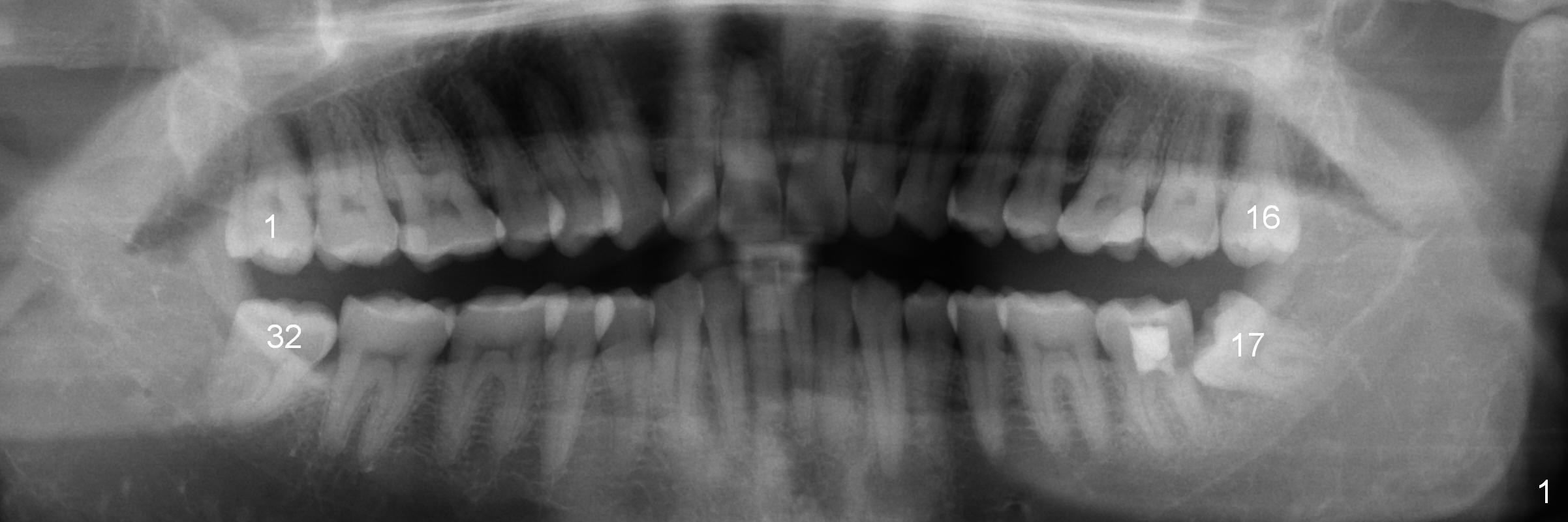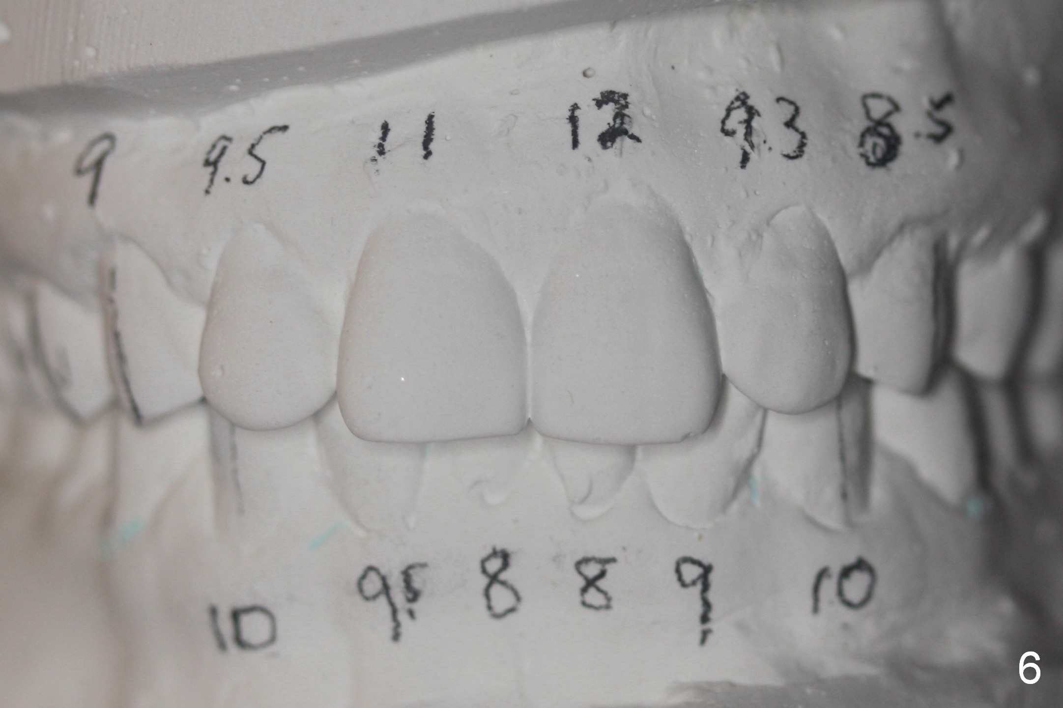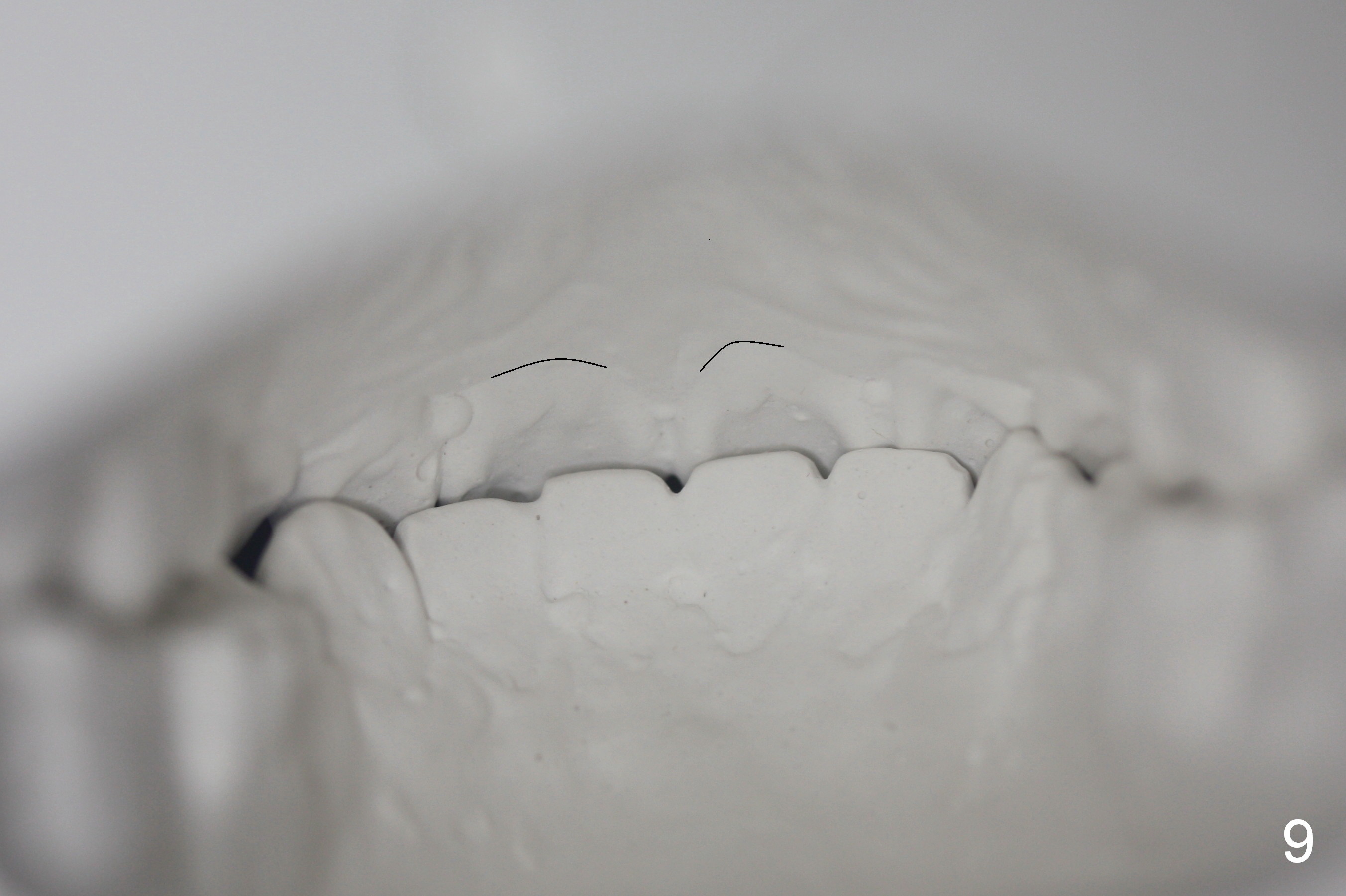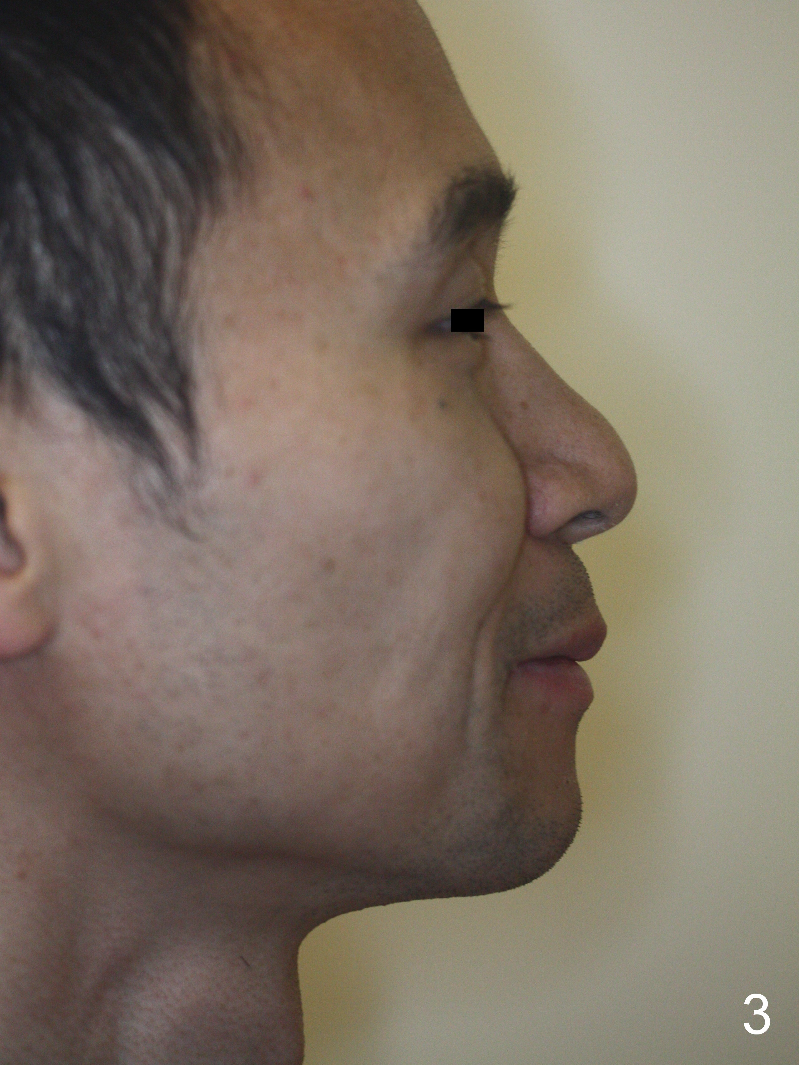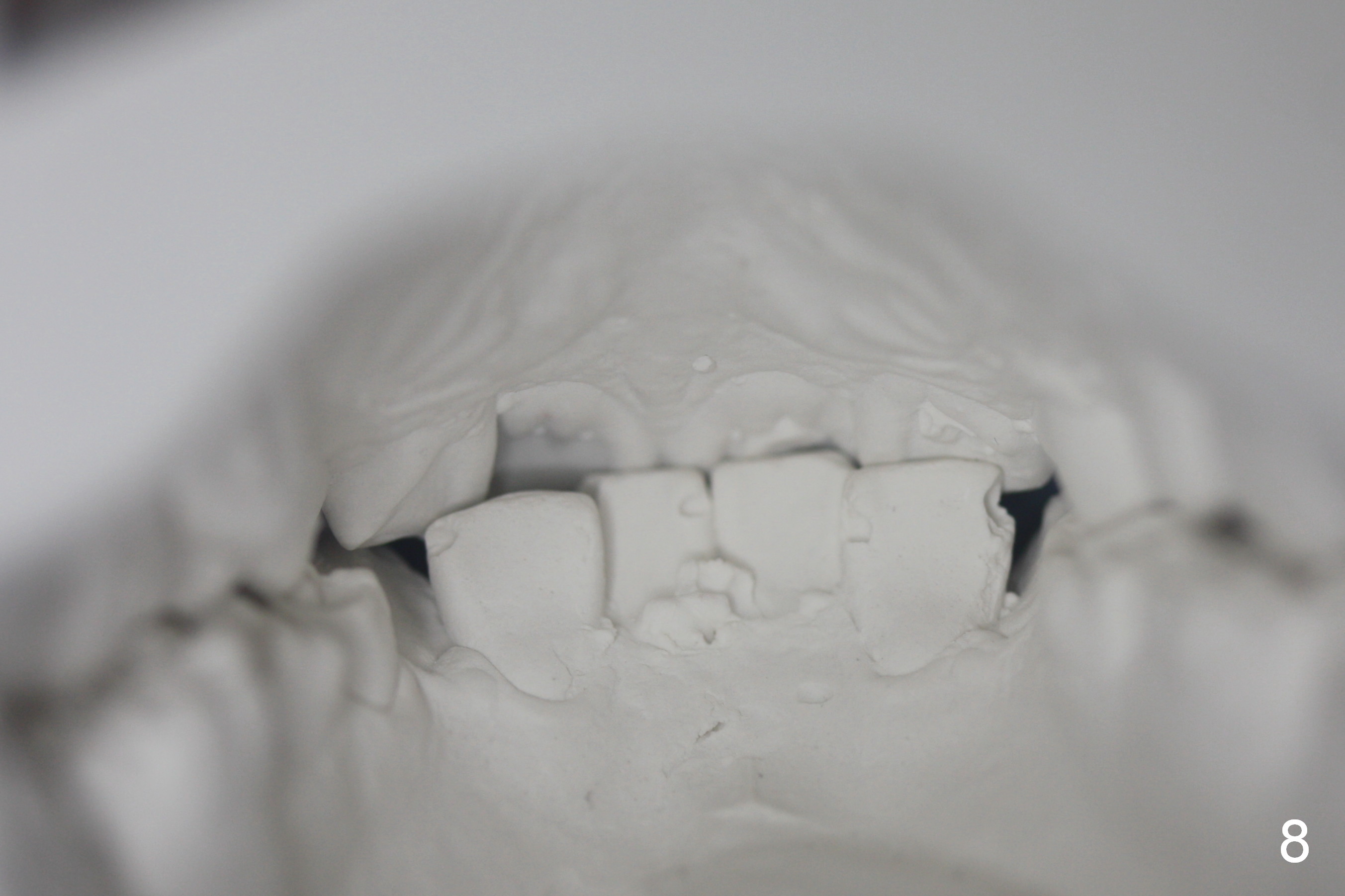 A 42-year-old man requests orthodontic treatment after extraction of the teeth #1, 16, 17, and 32, because it is easier for him to maintain oral hygiene post extraction. He thinks that orthodontic treatment will do the same. He appears to care about his dental alignment: not showing his teeth while smiling (Fig.2). The facial profile is within normal limit (Fig.3). His lower anterior teeth are moderately crowded (Fig.4) with anterior deep overbite and overjet (Fig.5,6). The deep overbite is more appreciated when the model is viewed posteriorly (Fig.7), approximately 90% of the upper incisors are covered by the lower anterior ones. More lingual surfaces are shown in another case before (Fig.8) and after (Fig.9) orthodontic treatment. With differential placement of brackets on the canines vs. incisors (Fig.6), the deep bite should be able to be corrected. Proximal reduction may be necessary.