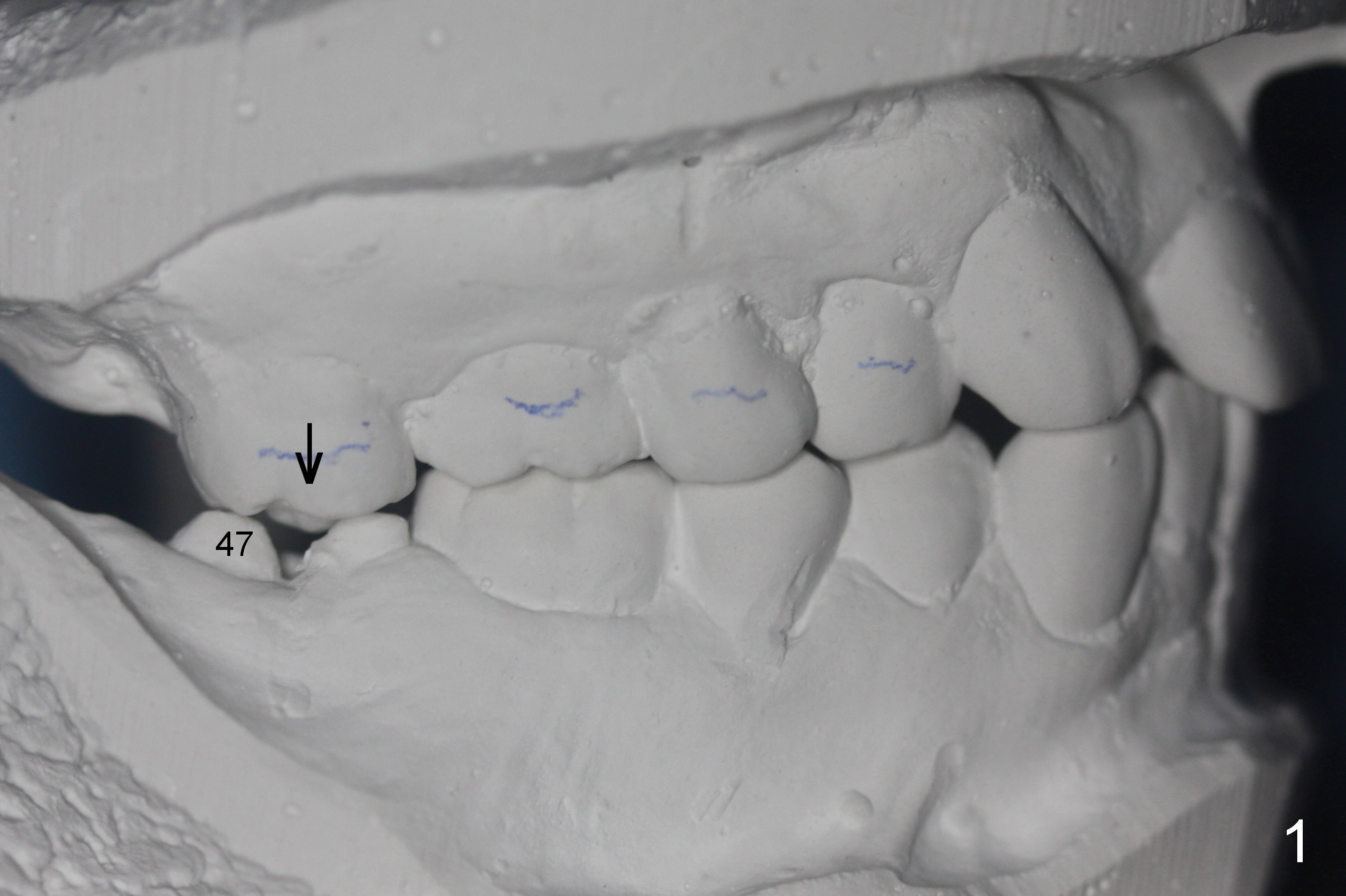 His profile is convex with lip strain. After alignment of the anterior teeth, check the facial profile to determine whether it is necessary to distalize the anterior teeth or not. If it is, the distalization will be done with the aid of an implant at 47 (Fig.1,5 (residual roots)) and 3 mini-implants at the 3 other quadrants. An extra mini-implant will be placed at the upper right quadrant to intrude 17 (Fig.1 arrow).