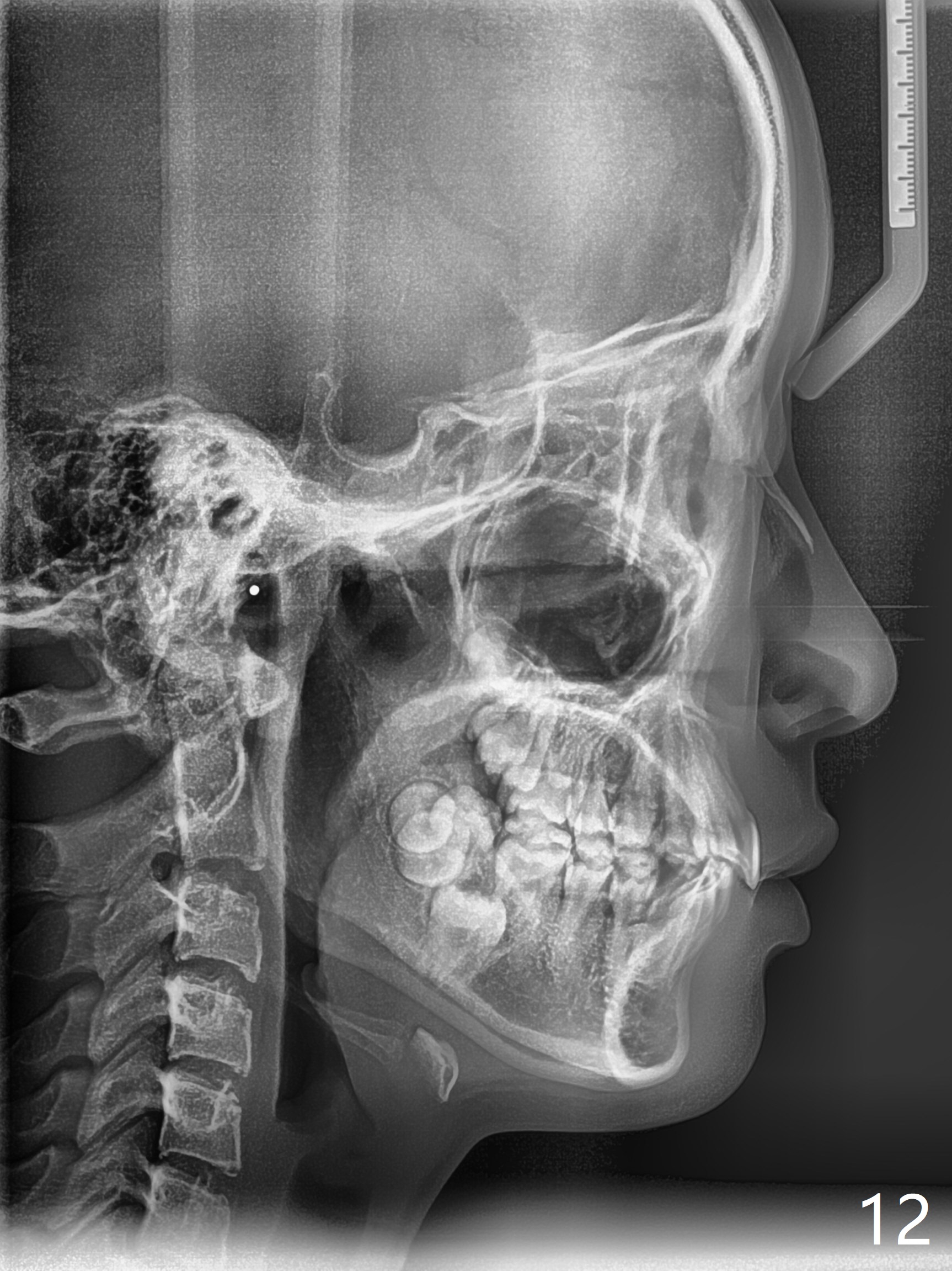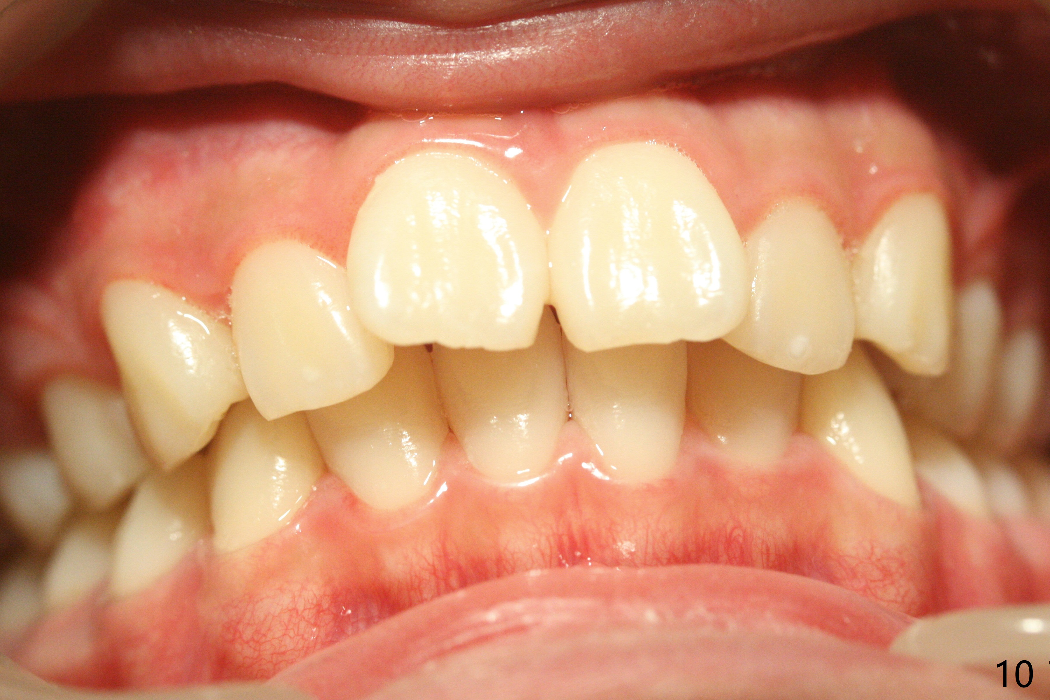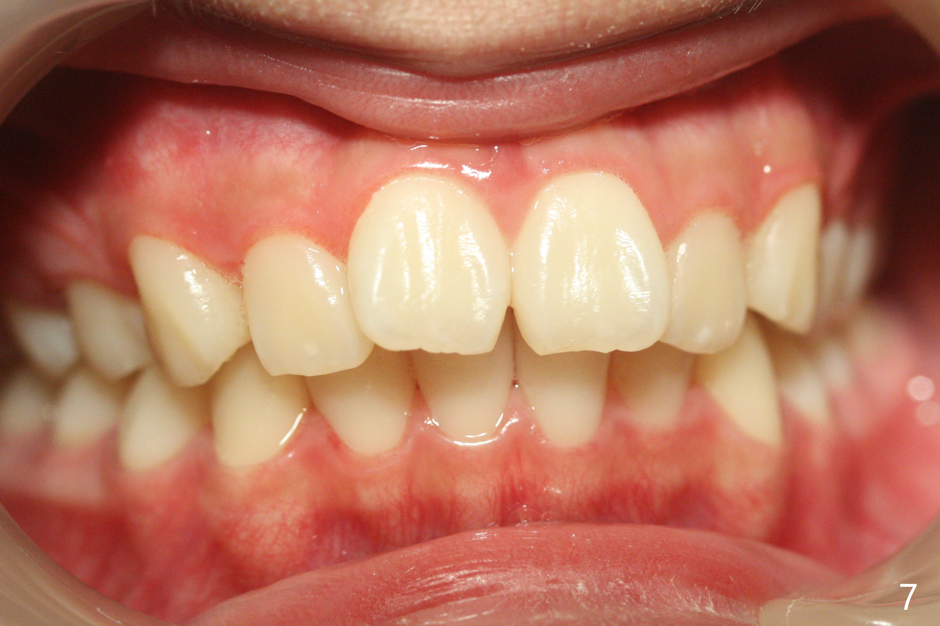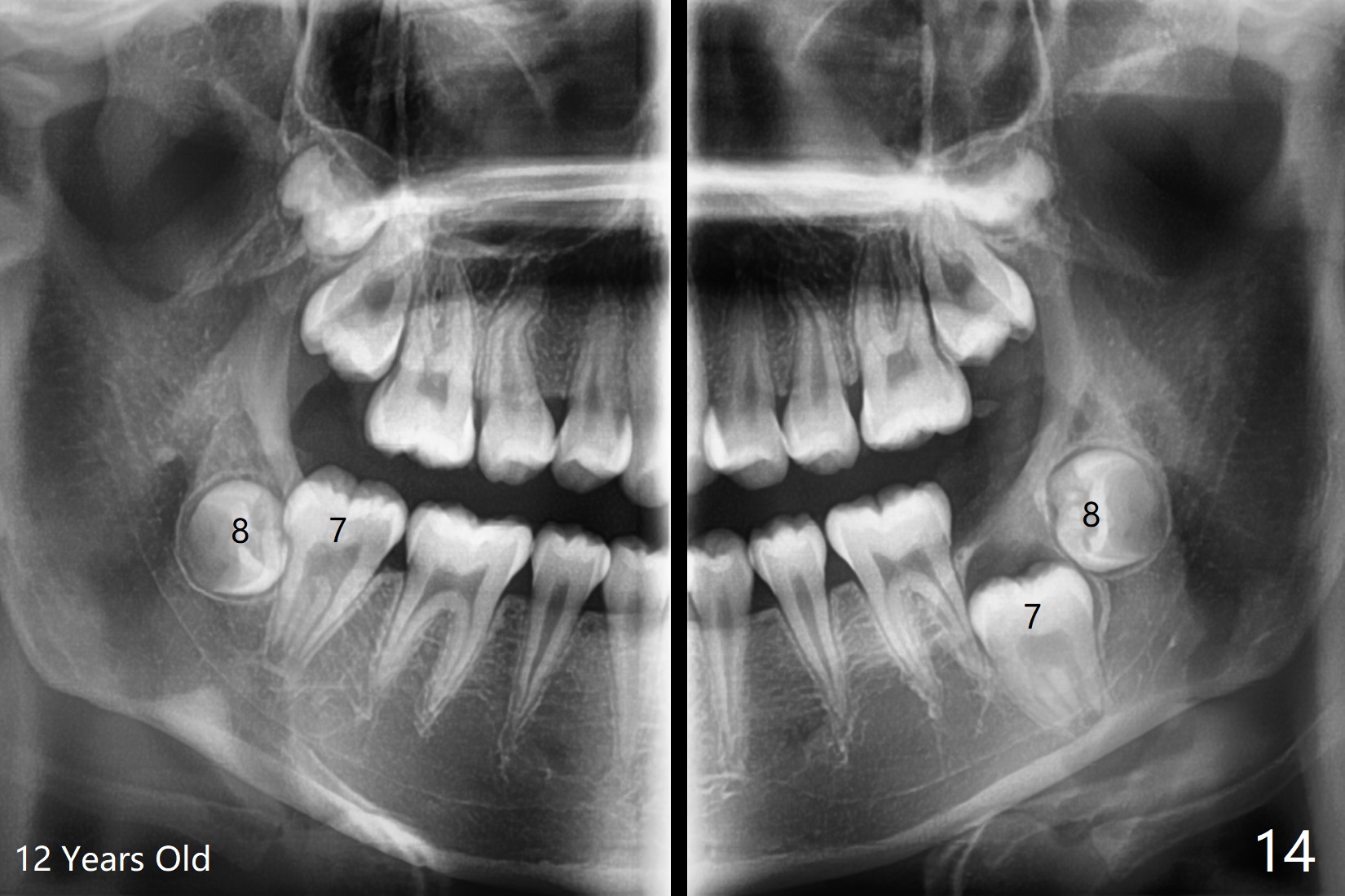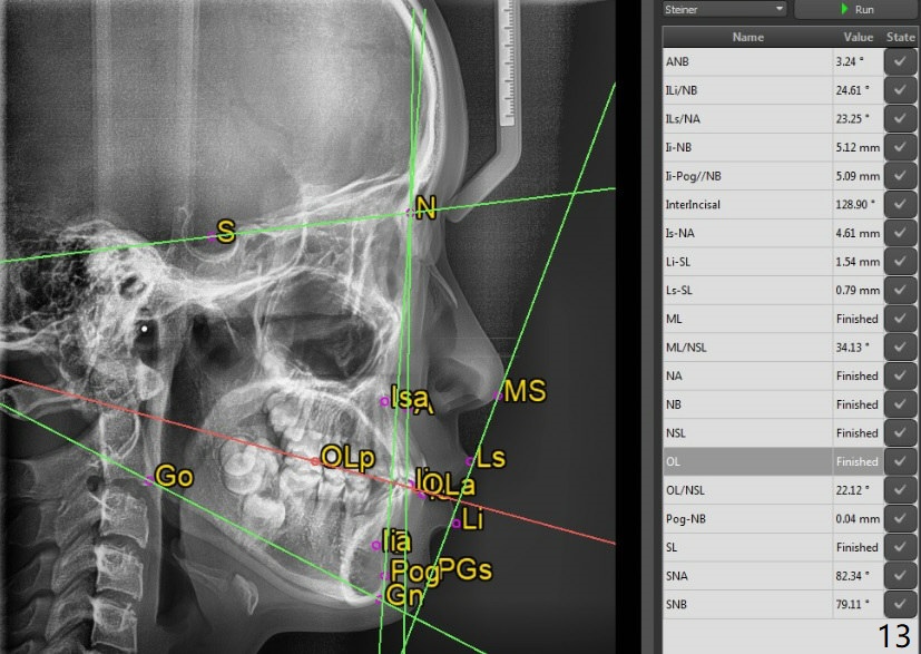 A 12-year-old woman has Class I facial profile (Fig.1-4,12,13) and apparently Class II Division I malocclusion (Fig.6-11). Start Class II retraction as early as possible to take advantage of the upper and lower posterior diastemata (Fig.9,11 (in fact there is no diastema)). LL7 impaction is noted immediately prebanding (Fig.14). Surgical access is pending.