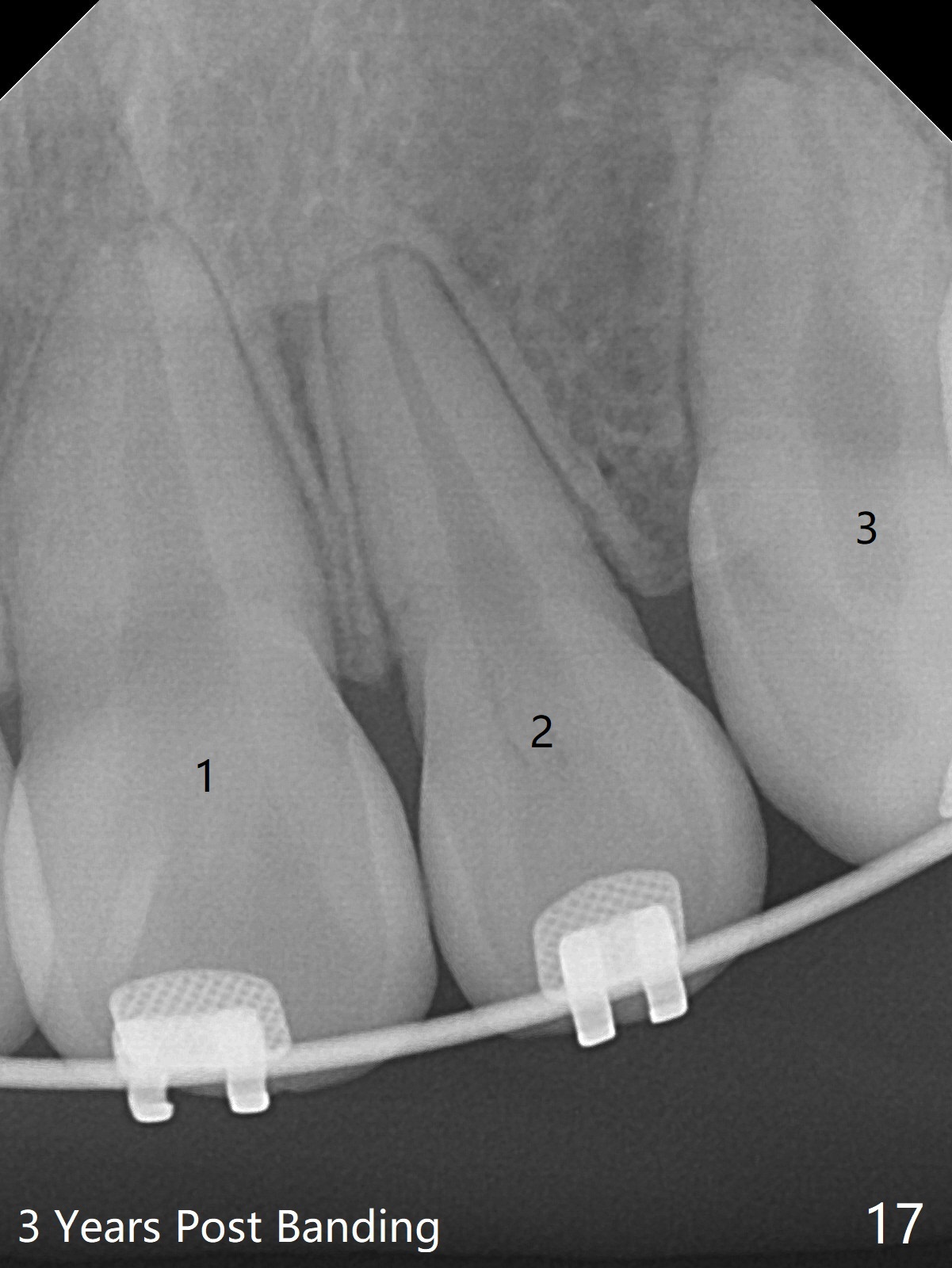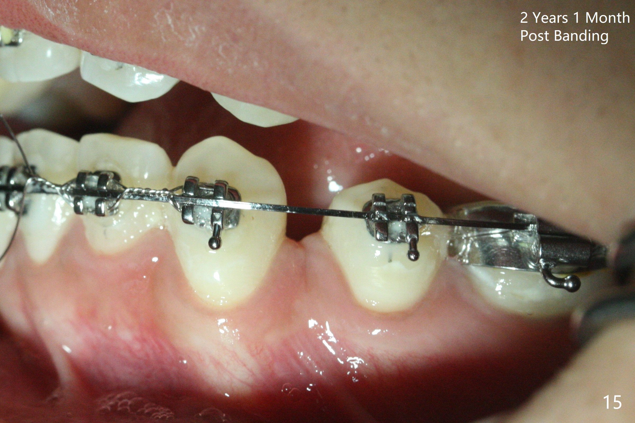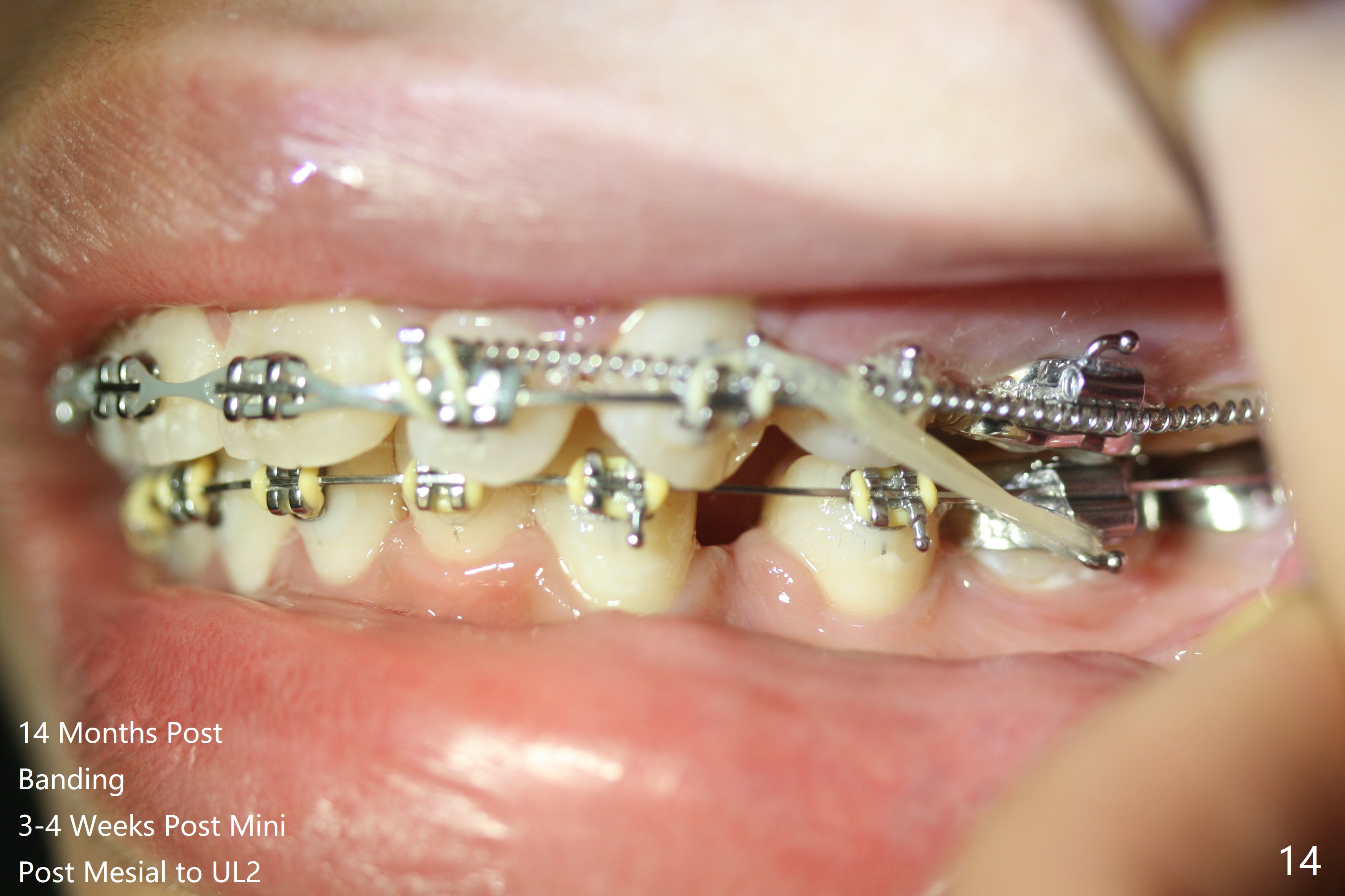 Thirteen months post banding, U dental midline apparently coincides with facial one, diastemata: UL2/3, UL6/7, L3-3, UL post detached, placed crimpable mini post mesial to UL2, closed spring UL2-7. Three-4 weeks later, diastema appears between UL1/2, while that of UL6/7 closes. Continue closed spring between UL2/7, while adding power chains U2-2 (Fig.12). To correct anterior overjet (Fig.13), Class II retraction is introduced bilaterally (Fig.14). After mesialization of LL3 (with Class I canine occlusion), L3-3 are being ligated as an anchor to mesialize LL5 (Fig.15). Occlusion appears to be Class II nearly 3 years post banding. Miniimplants are planned to distalize the upper dentition. Upper anterior PAs are taken to determine whether the roots of the upper anterior teeth have been resorbed. In fact, they are (Fig.16,17). Fortunately the anterior overjet does not look so severe. Orthodontic treatment should be terminated soon. Next case PAs should be taken prior to distalization.