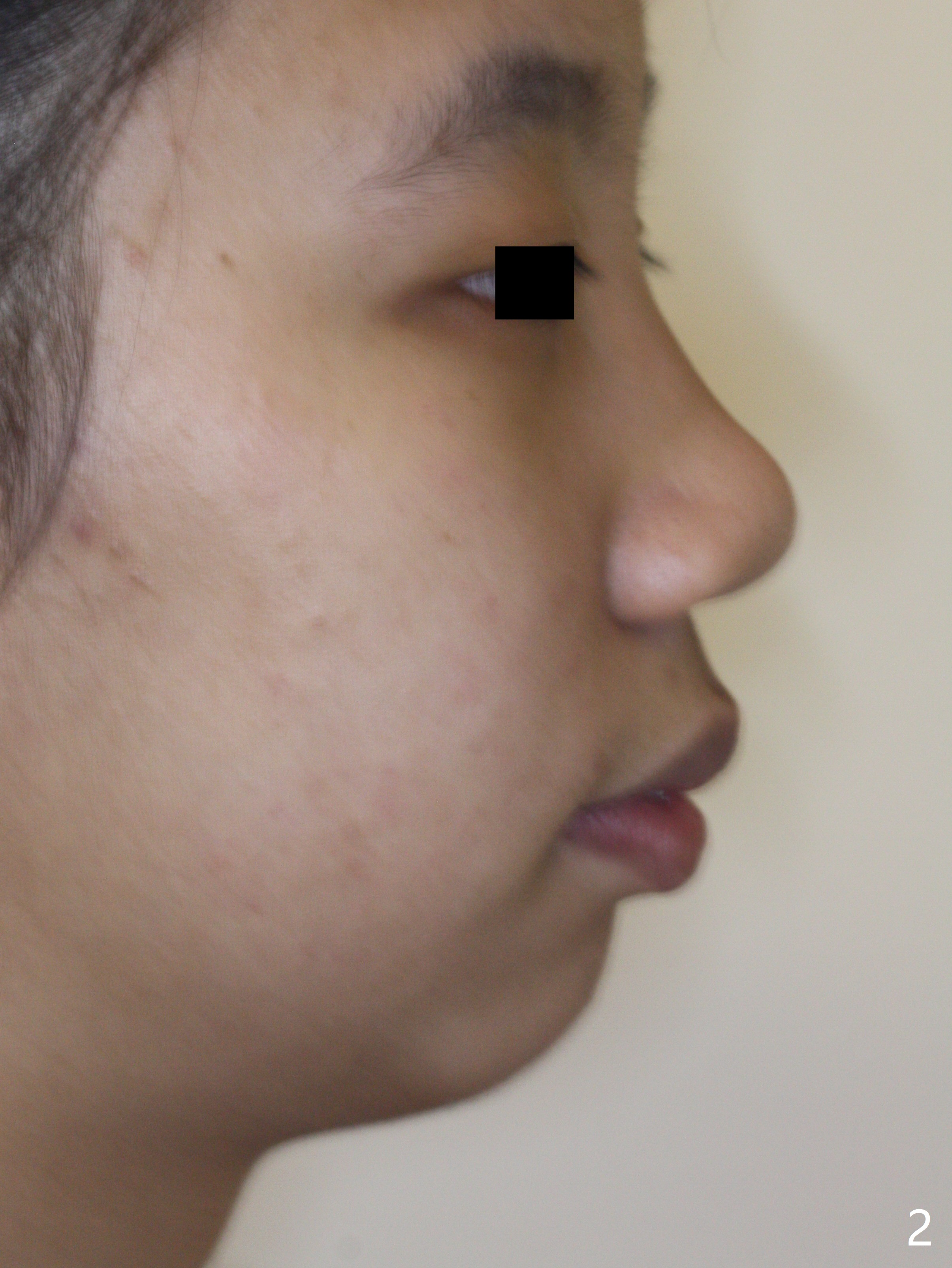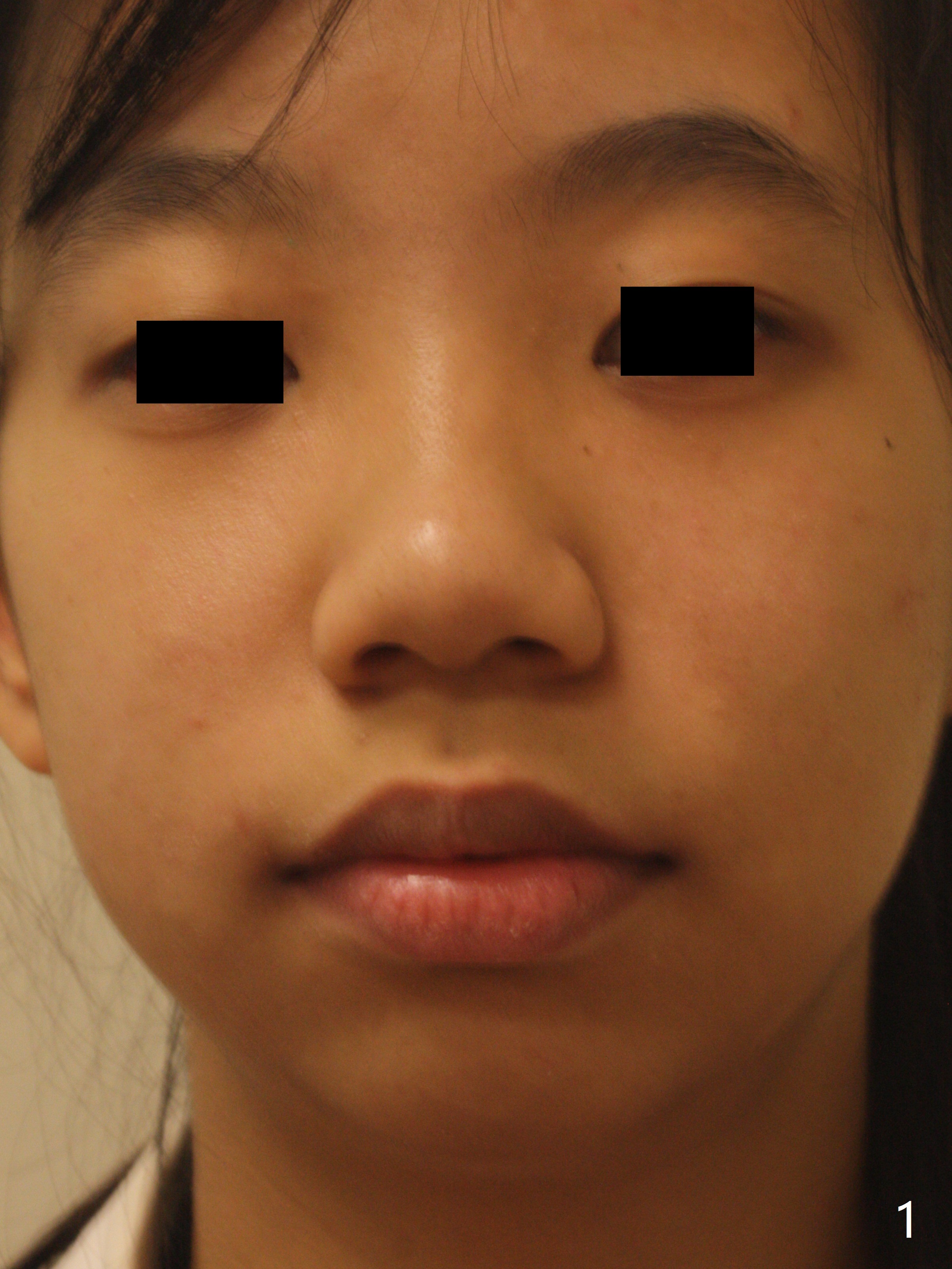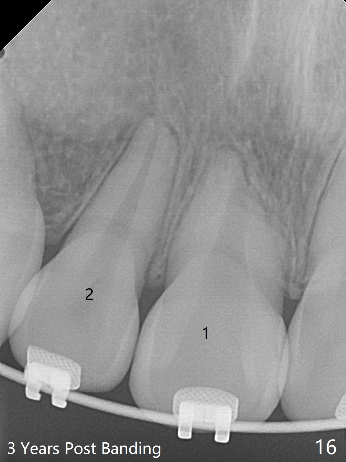 Thirteen months post banding, U dental midline apparently coincides with facial one, diastemata: UL2/3, UL6/7, L3-3, UL post detached, placed crimpable mini post mesial to UL2, closed spring UL2-7. Three-4 weeks later, diastema appears between UL1/2, while that of UL6/7 closes. Continue closed spring between UL2/7, while adding power chains U2-2 (Fig.12). To correct anterior overjet (Fig.13), Class II retraction is introduced bilaterally (Fig.14). After mesialization of LL3 (with Class I canine occlusion), L3-3 are being ligated as an anchor to mesialize LL5 (Fig.15). Occlusion appears to be Class II nearly 3 years post banding. Miniimplants are planned to distalize the upper dentition. Upper anterior PAs are taken to determine whether the roots of the upper anterior teeth have been resorbed. In fact, they are (Fig.16,17). Fortunately the anterior overjet does not look so severe. Orthodontic treatment should be terminated soon. Next case PAs should be taken prior to distalization.