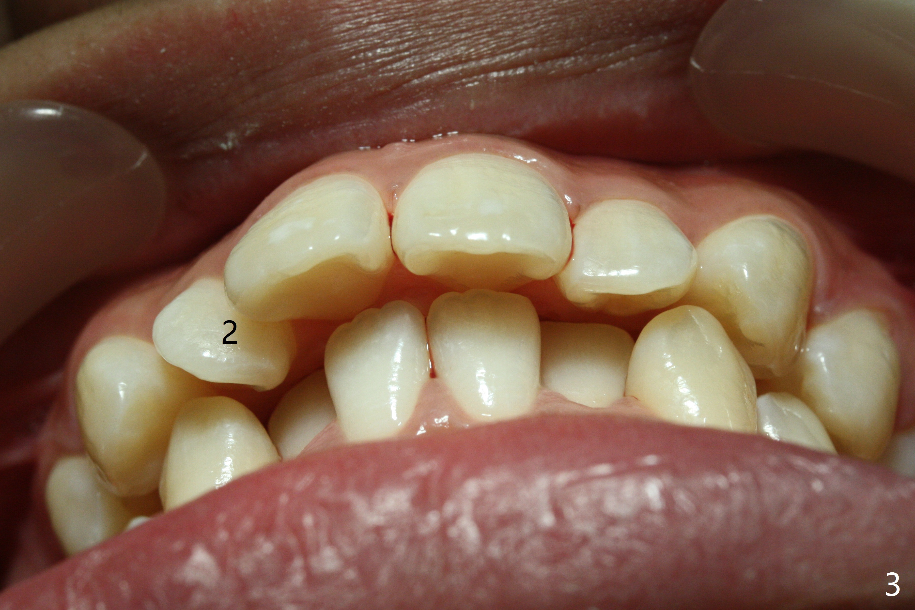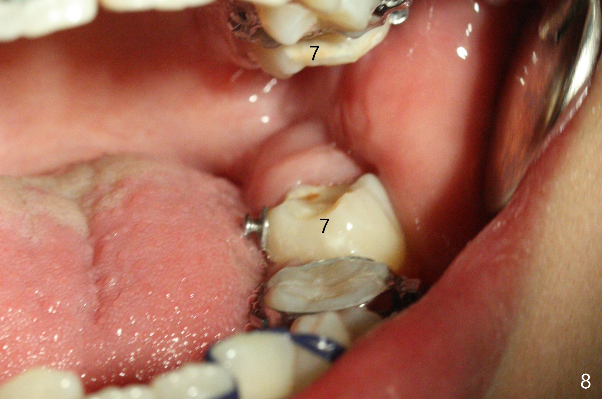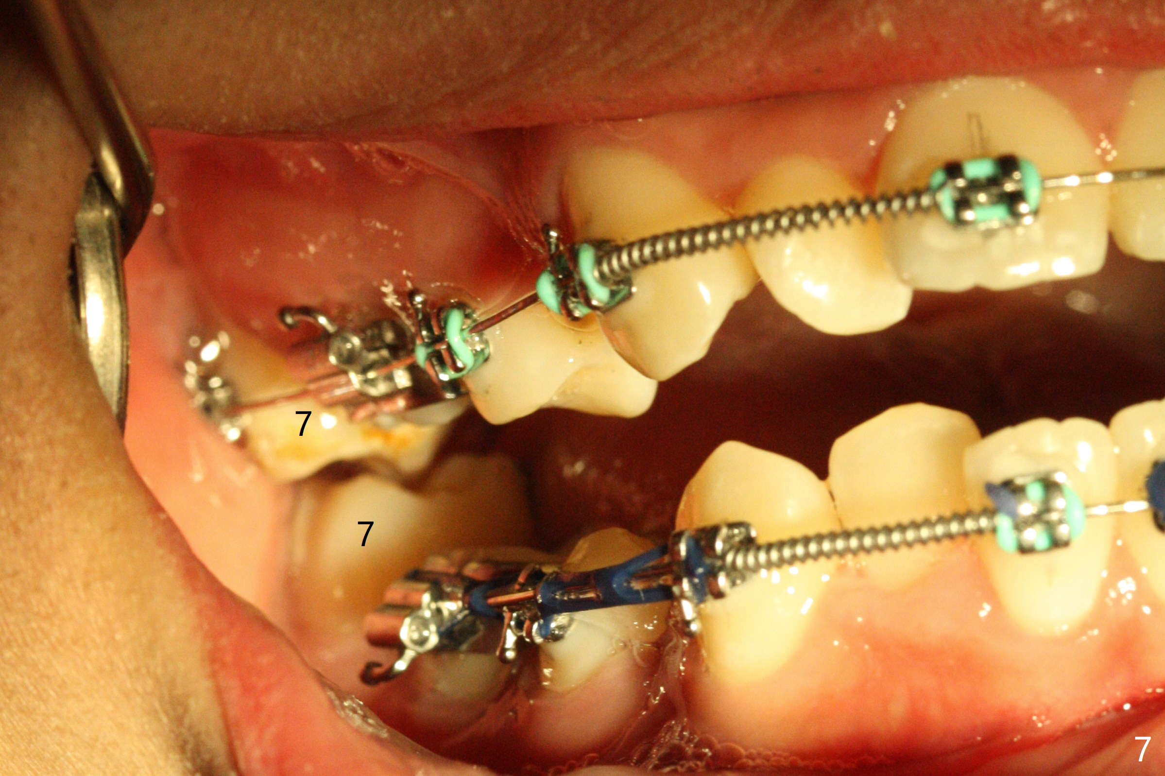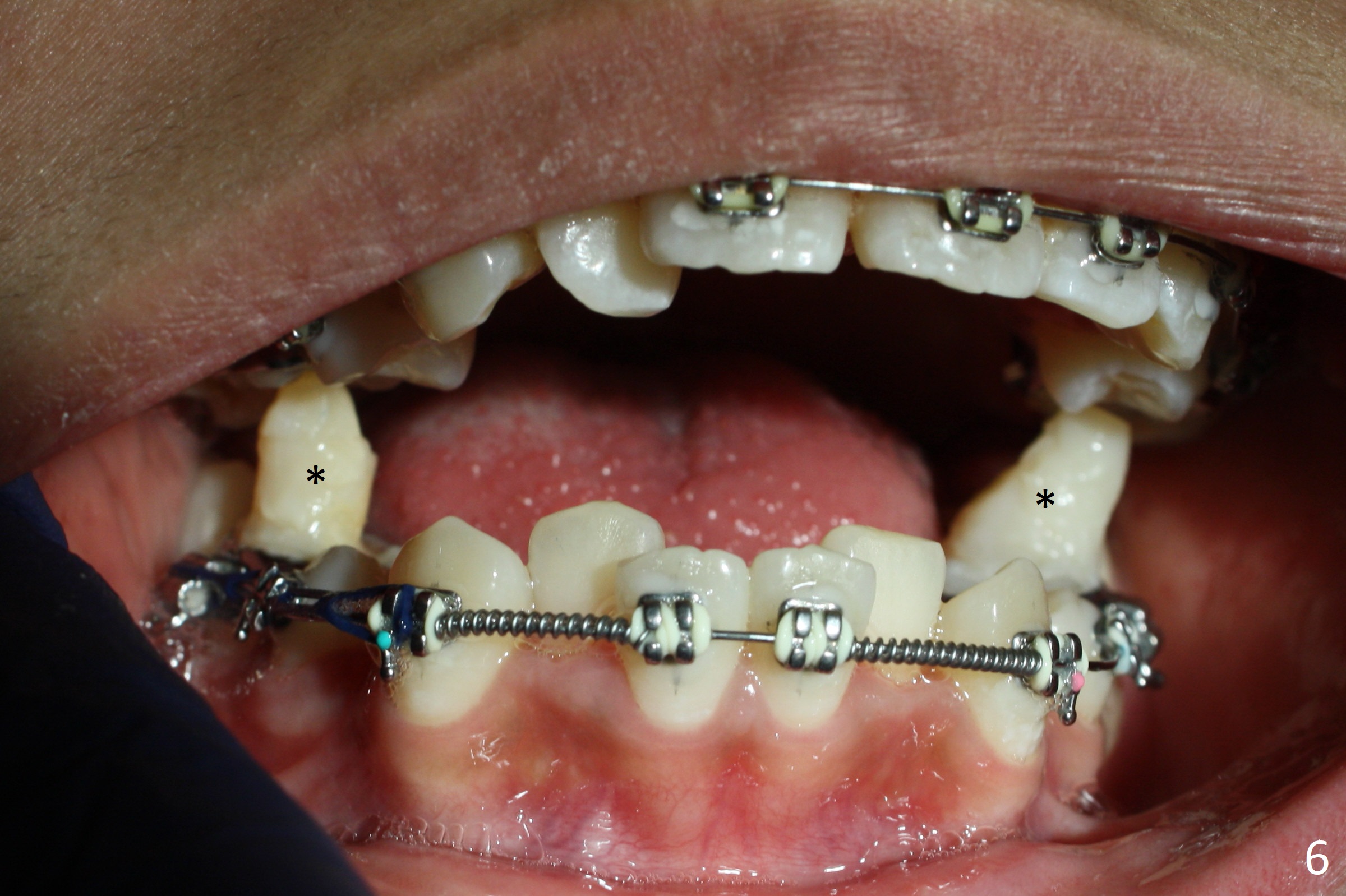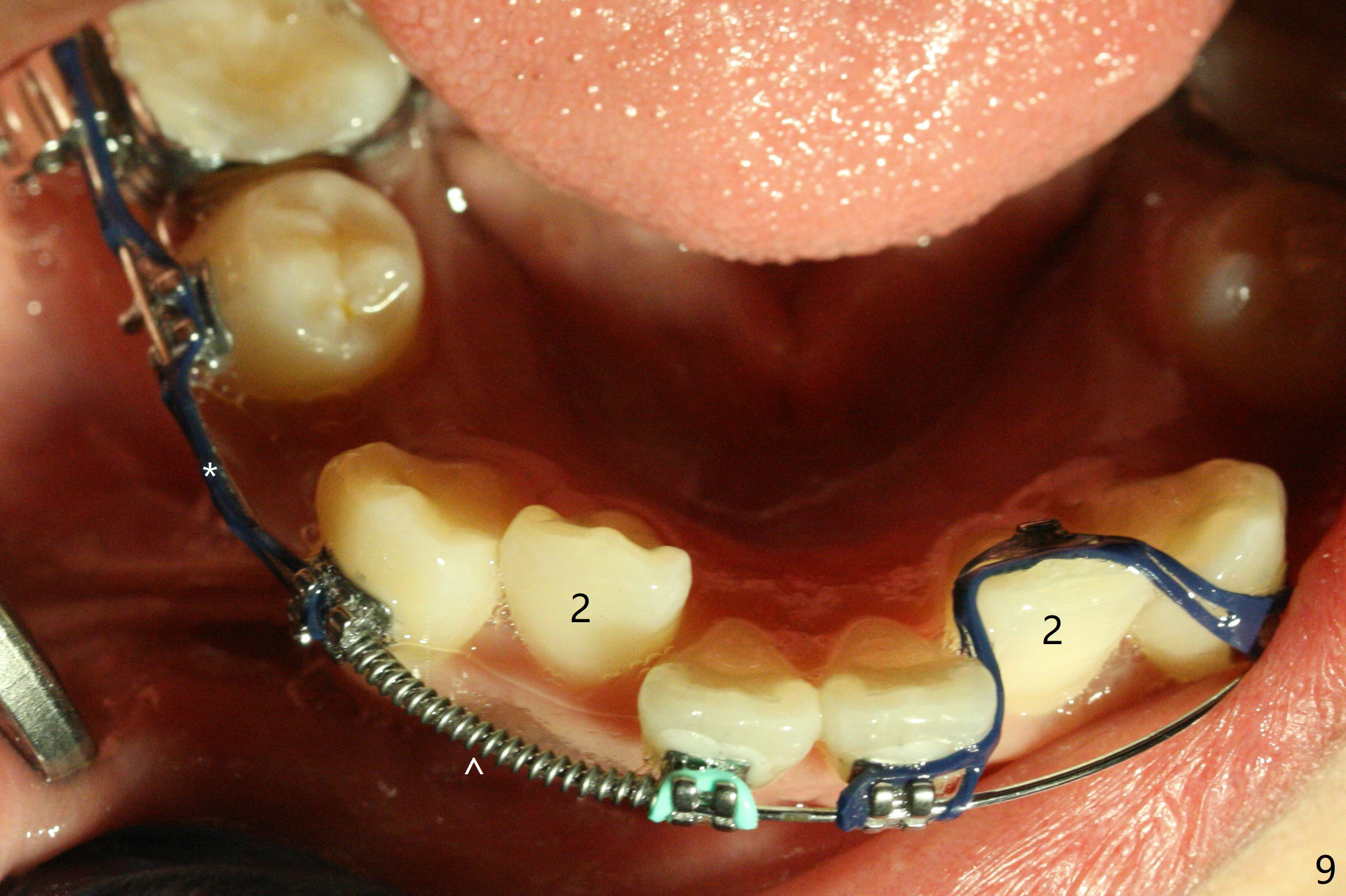 Three months post banding, the cross bite at 7s is corrected; with 7s' supraeruption and 6s' infraocclusion (because of occlusal composite (just removed), Fig.7,8), anterior open bite occur. Next visit place brackets in L7s with flexible wire. While 2 mechanisms are applied to gain more space for LR2 (Fig.9 *, ^), a special mechanism is utilized to correct LL2 cross bite (space gained). If the space for UR2 (Fig.10) is insufficient next appointment, what should we do? Otherwise, what should be done?