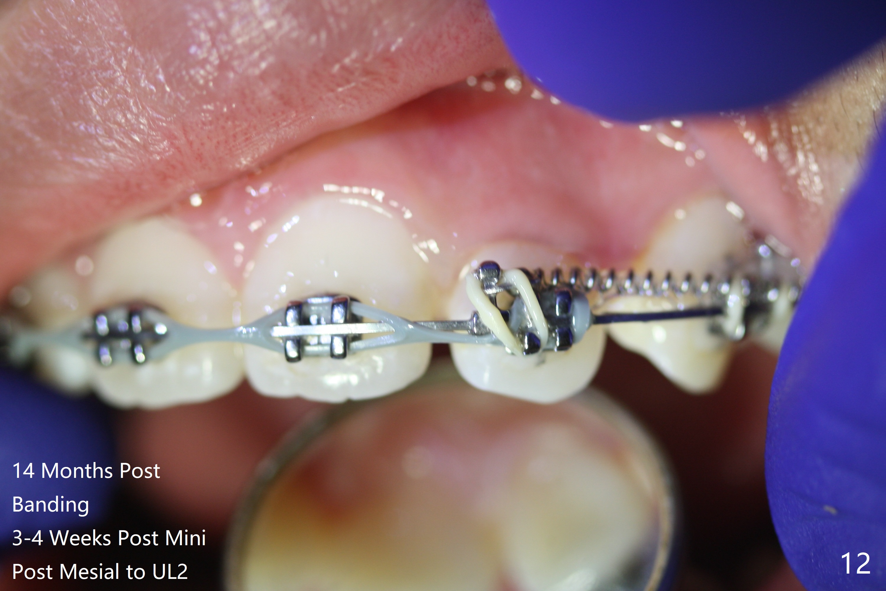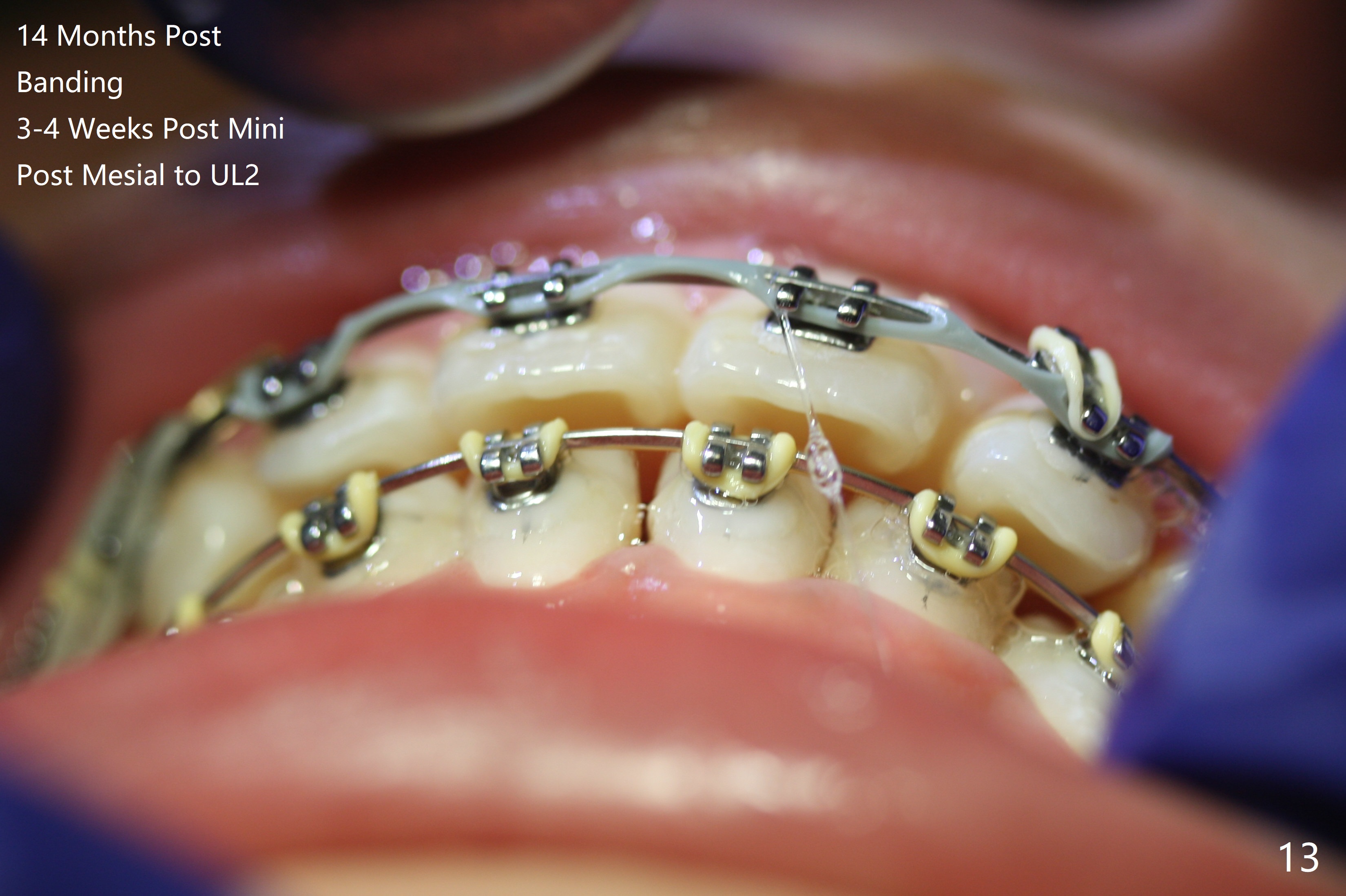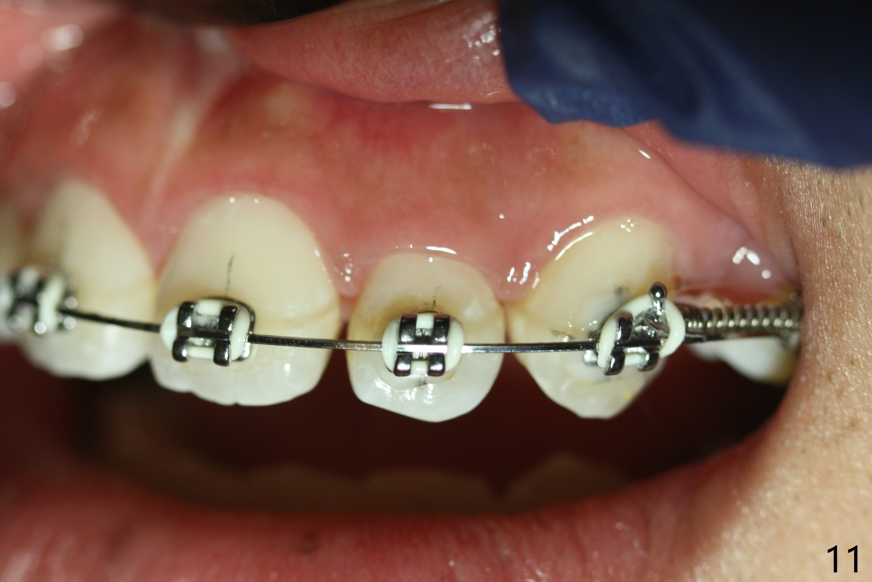 Anterior open bite is corrected with composite in L7s with elastic box bilaterally. UR3 is fully distalized after a closed spring is placed between UR3-7. Sling shot is applied for UR2 cross bite correction with UR3-6 ligature wire and U3-7 closed spring (latter 2 to keep position of UR3). Three weeks of closed spring between UL3 and 6, UL2 is also distalized because of periodontal ligament between the neighboring teeth (Fig.11 (10.5 months post banding; 16x22 wire placed for further retraction (overjet))).