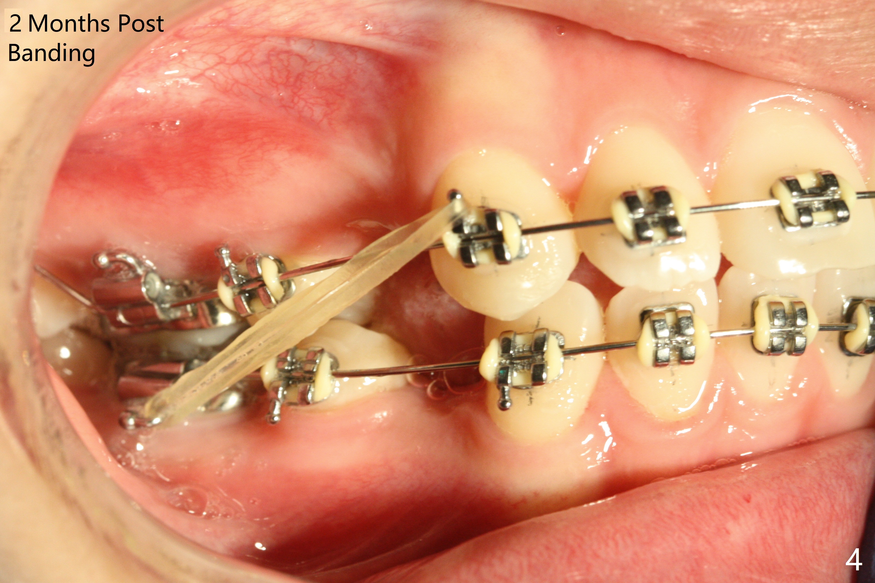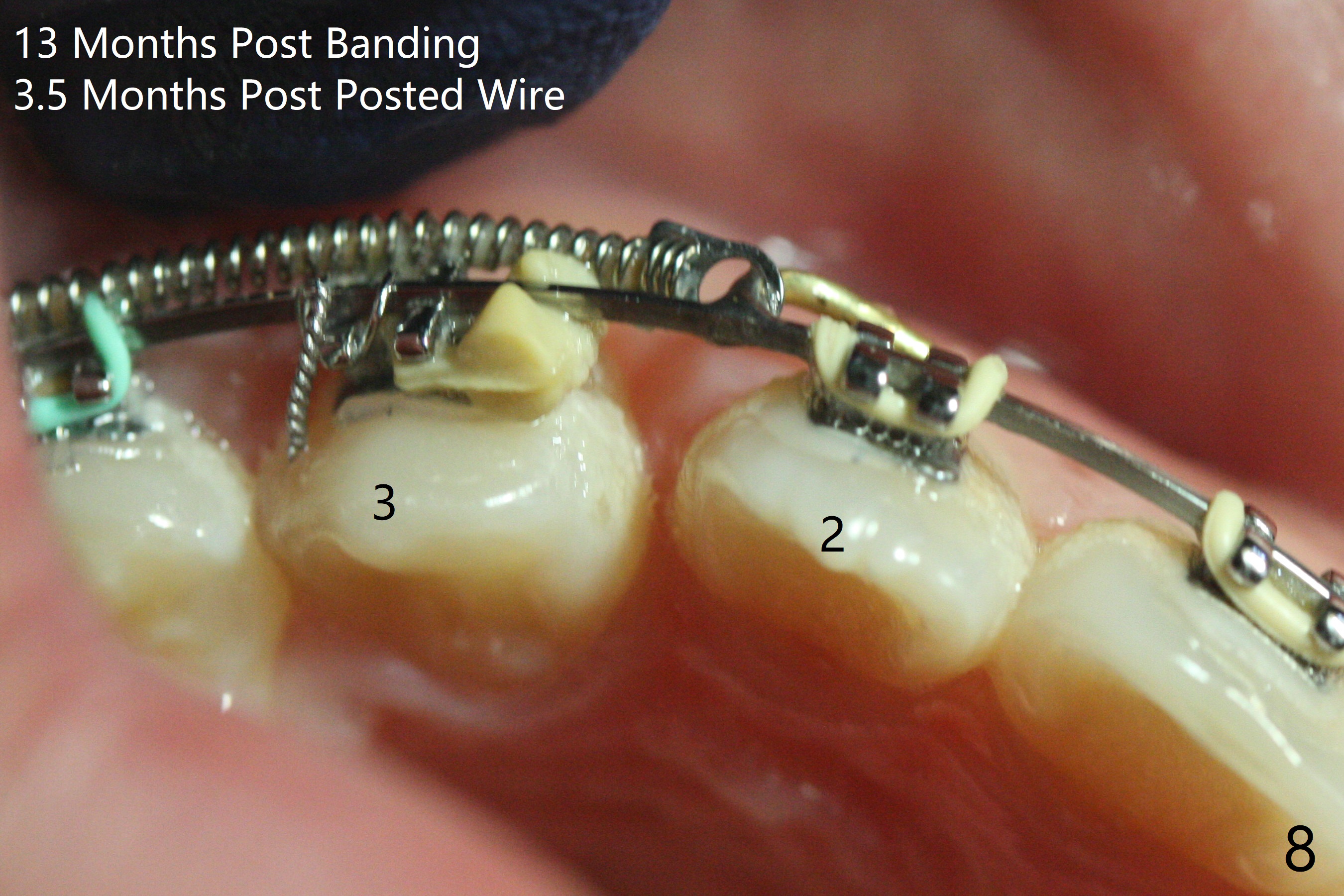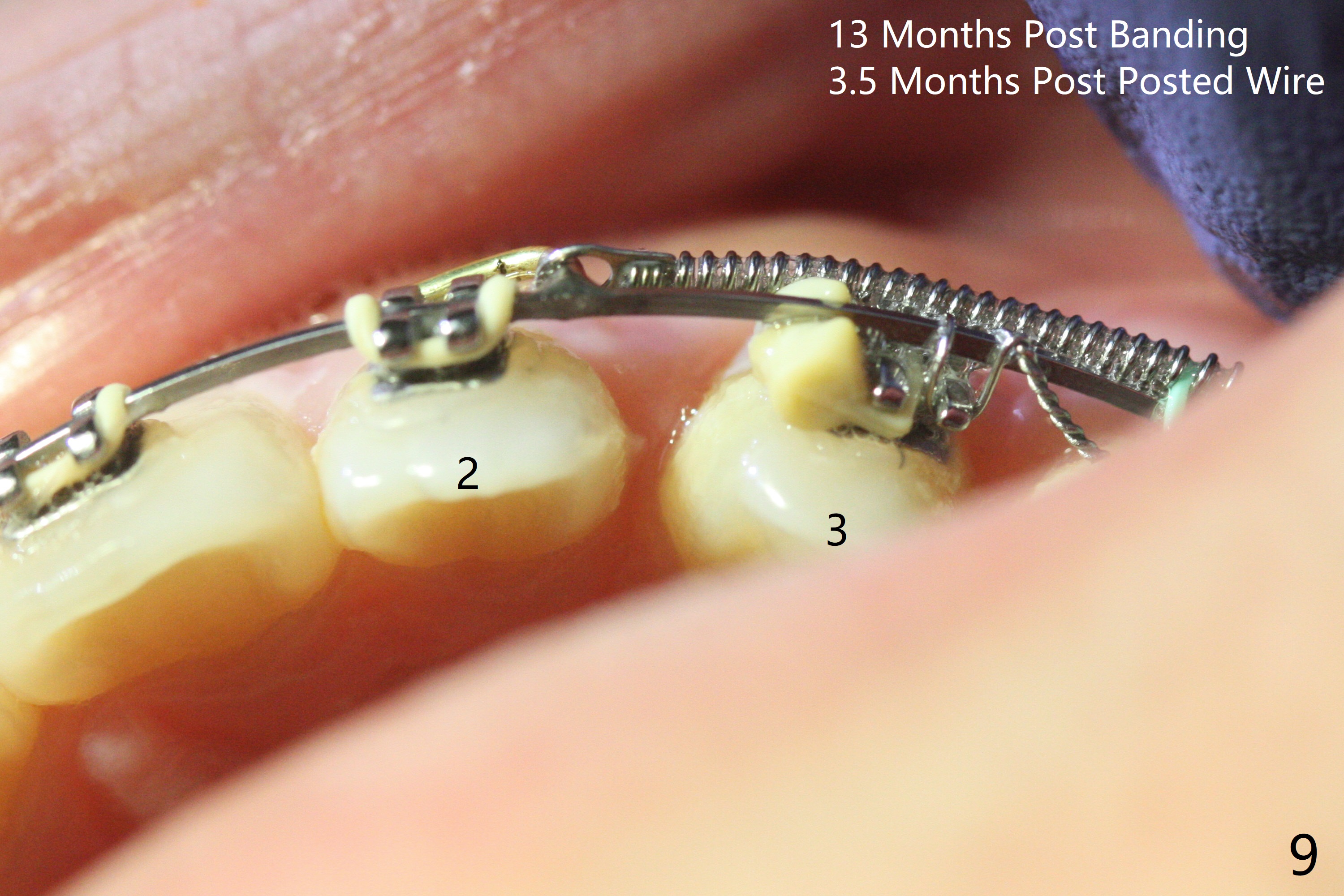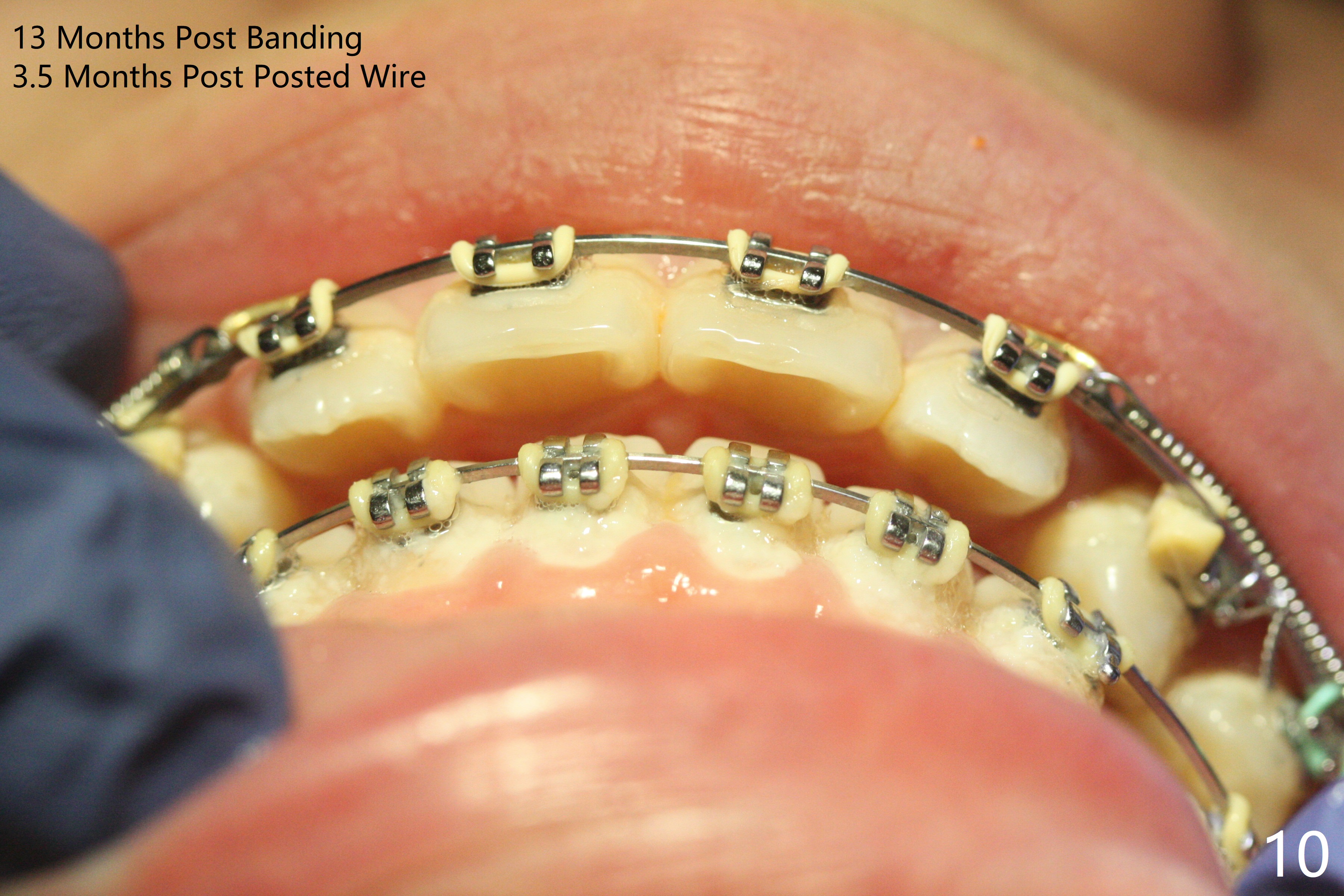 Two weeks post extraction of 4 bicuspids, brackets and bands are placed in 20 teeth (Fig.1-3, 14 niti). No bands are placed at 7s because of short crowns and tight contacts. When 16x16 wires are used, start Class II retraction. The latter is initiated with elastics when 18 ss wires are placed (Fig.4,5). U3s have been distalized with closed springs for 3 months (Fig.6,7). U2s are close to distalization 13 months post banding, 3.5 months post posted wire (Fig,8,9) with overjet (Fig.10). Class II retraction is re-initiated. When the upper incisors are retracted, the anterior overjet remains large. It appears that U6s have been retracted anterior, as indicated by the space between U6/7 (Fig.11), because of no use of U7s as anchors. Brackets are just placed with 18 niti arch wire. They will be retracted distal using the rest of the upper teeth and lower teeth (using Class II retraction) as anchor. There is root resorption of the upper anteriors 2 years 1 month post banding (Fig.12,13).