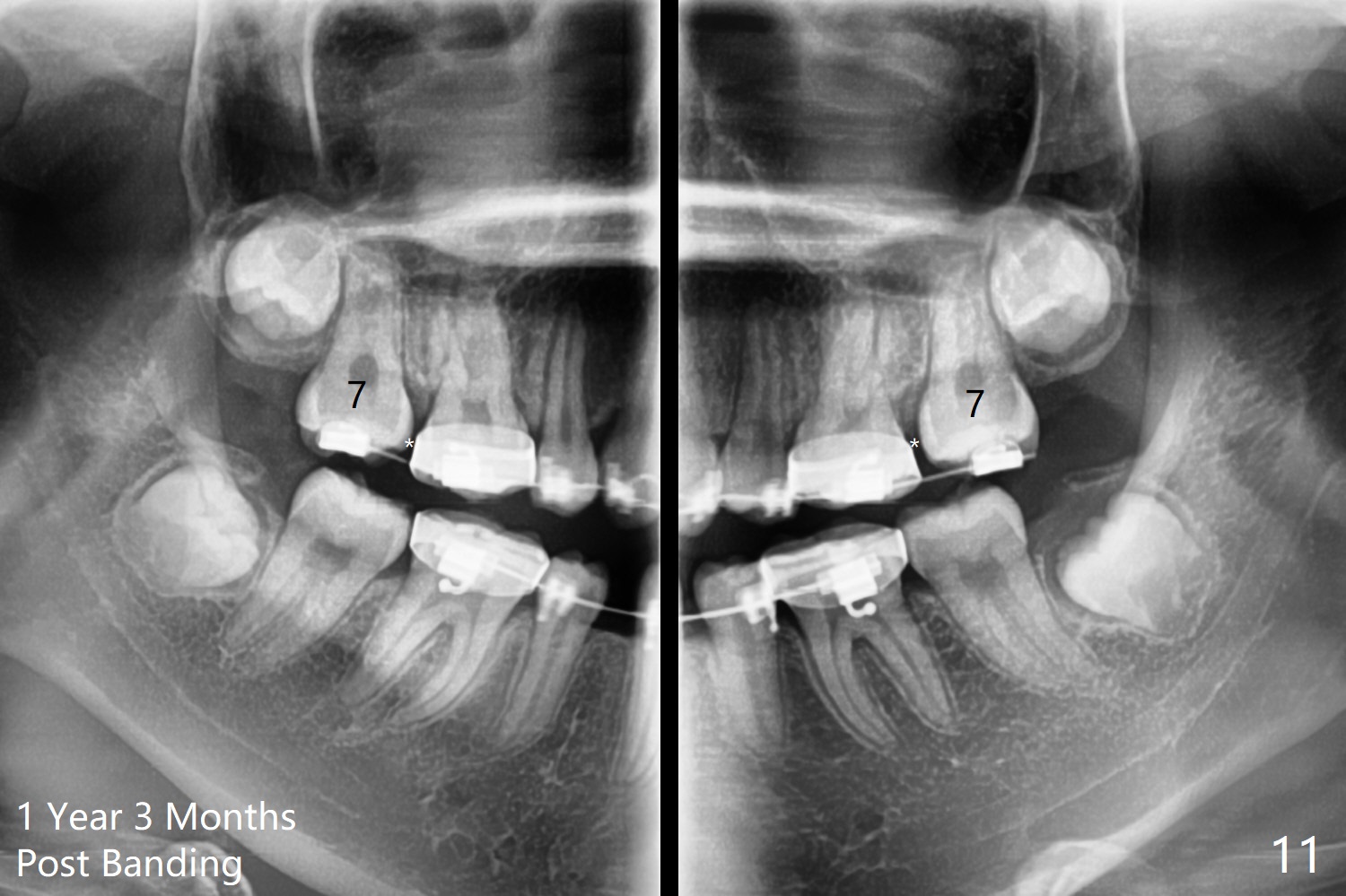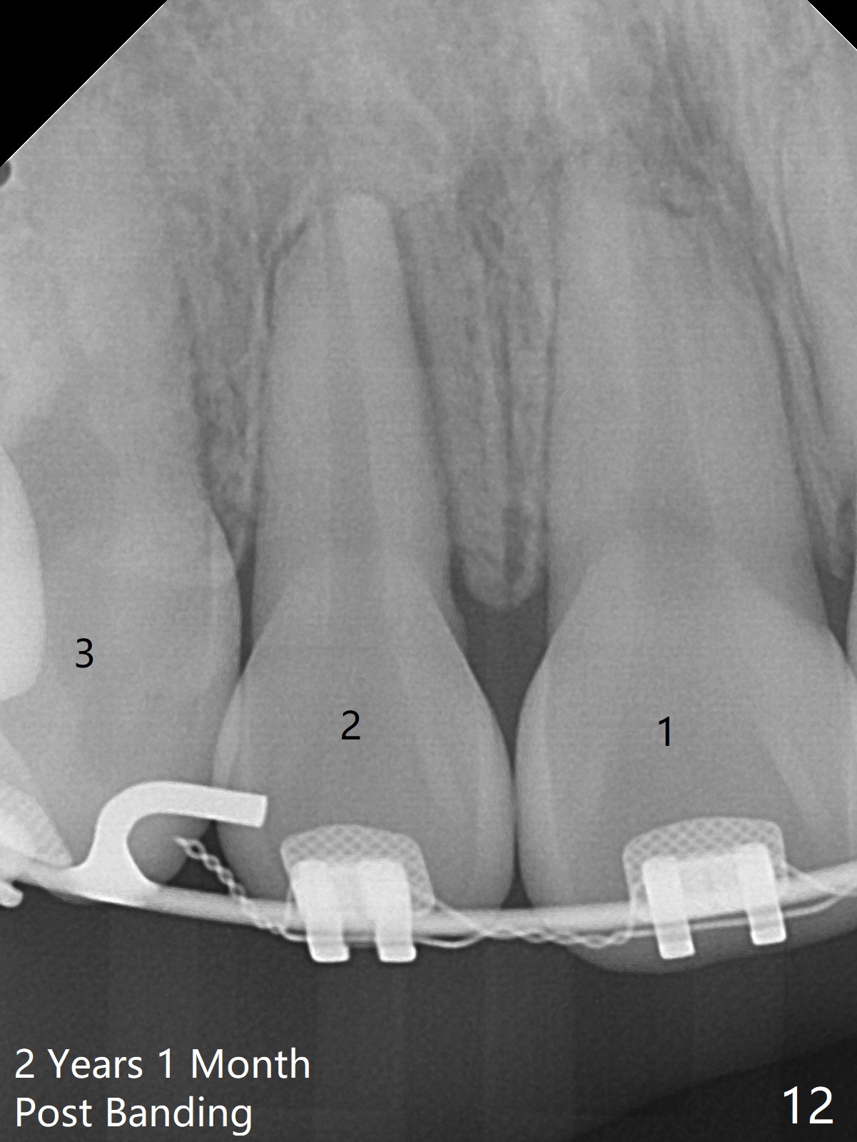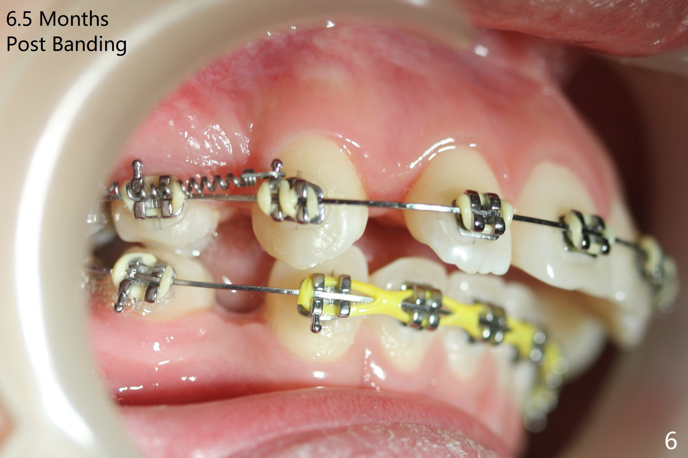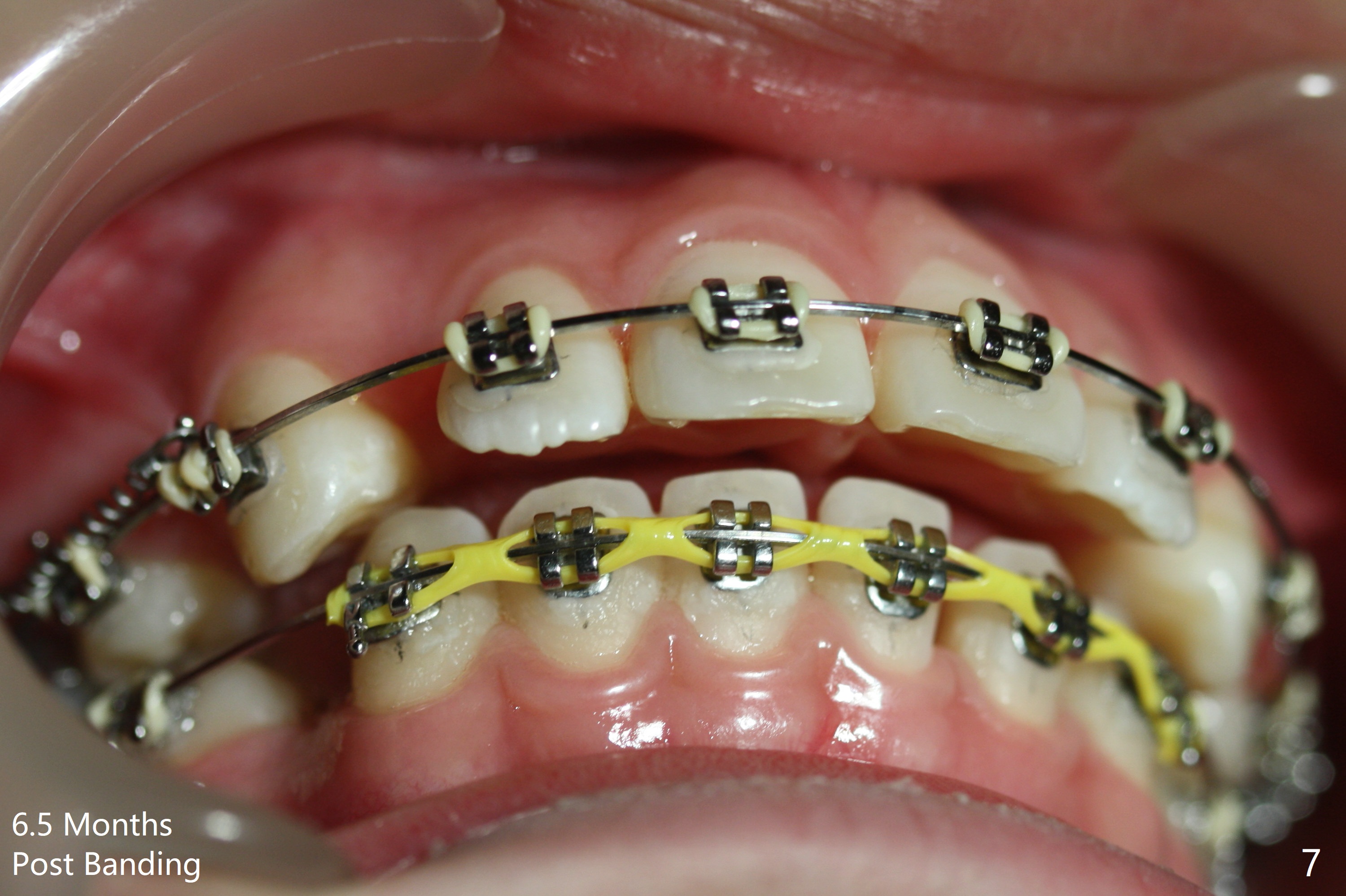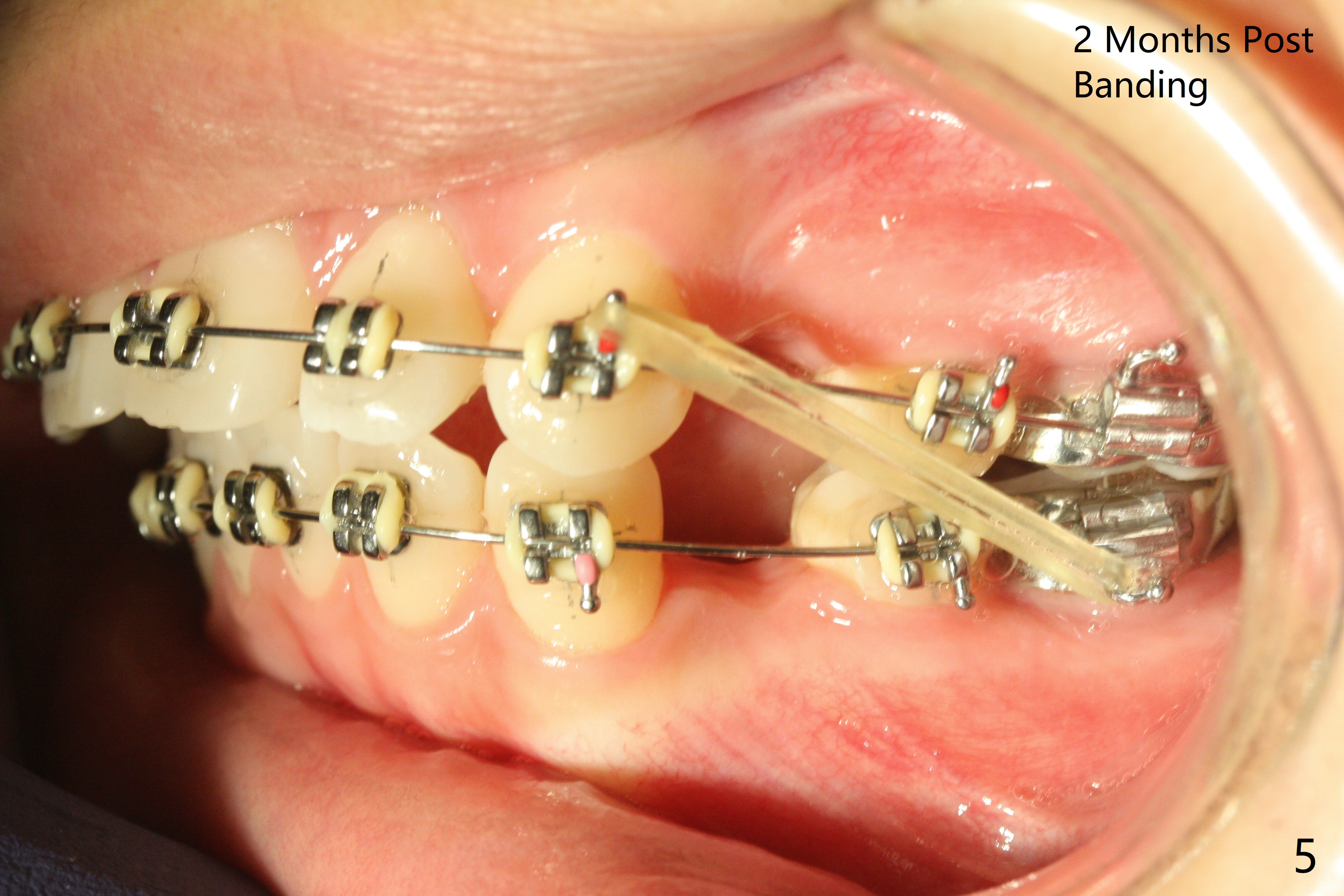 Two weeks post extraction of 4 bicuspids, brackets and bands are placed in 20 teeth (Fig.1-3, 14 niti). No bands are placed at 7s because of short crowns and tight contacts. When 16x16 wires are used, start Class II retraction. The latter is initiated with elastics when 18 ss wires are placed (Fig.4,5). U3s have been distalized with closed springs for 3 months (Fig.6,7). U2s are close to distalization 13 months post banding, 3.5 months post posted wire (Fig,8,9) with overjet (Fig.10). Class II retraction is re-initiated. When the upper incisors are retracted, the anterior overjet remains large. It appears that U6s have been retracted anterior, as indicated by the space between U6/7 (Fig.11), because of no use of U7s as anchors. Brackets are just placed with 18 niti arch wire. They will be retracted distal using the rest of the upper teeth and lower teeth (using Class II retraction) as anchor. There is root resorption of the upper anteriors 2 years 1 month post banding (Fig.12,13).