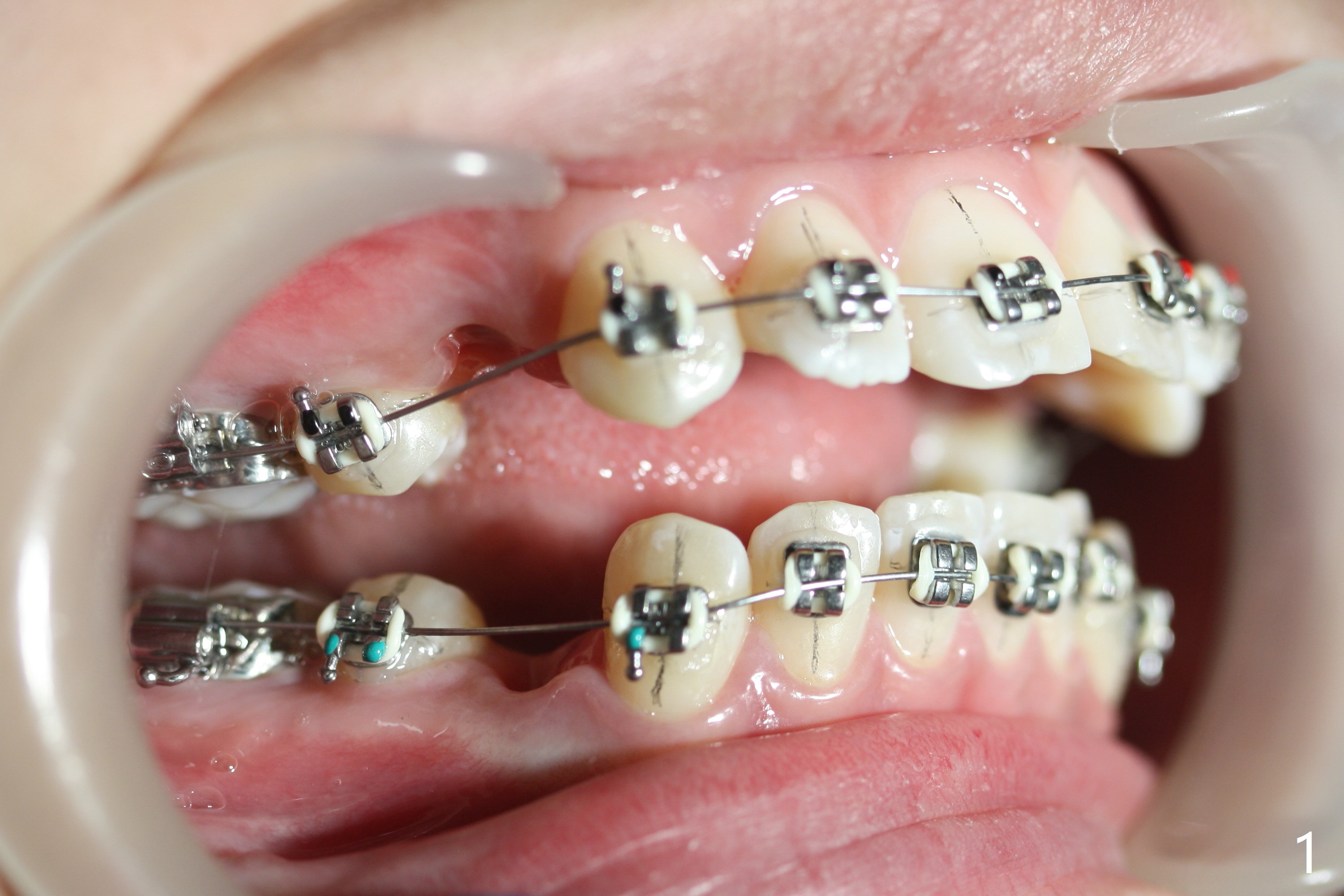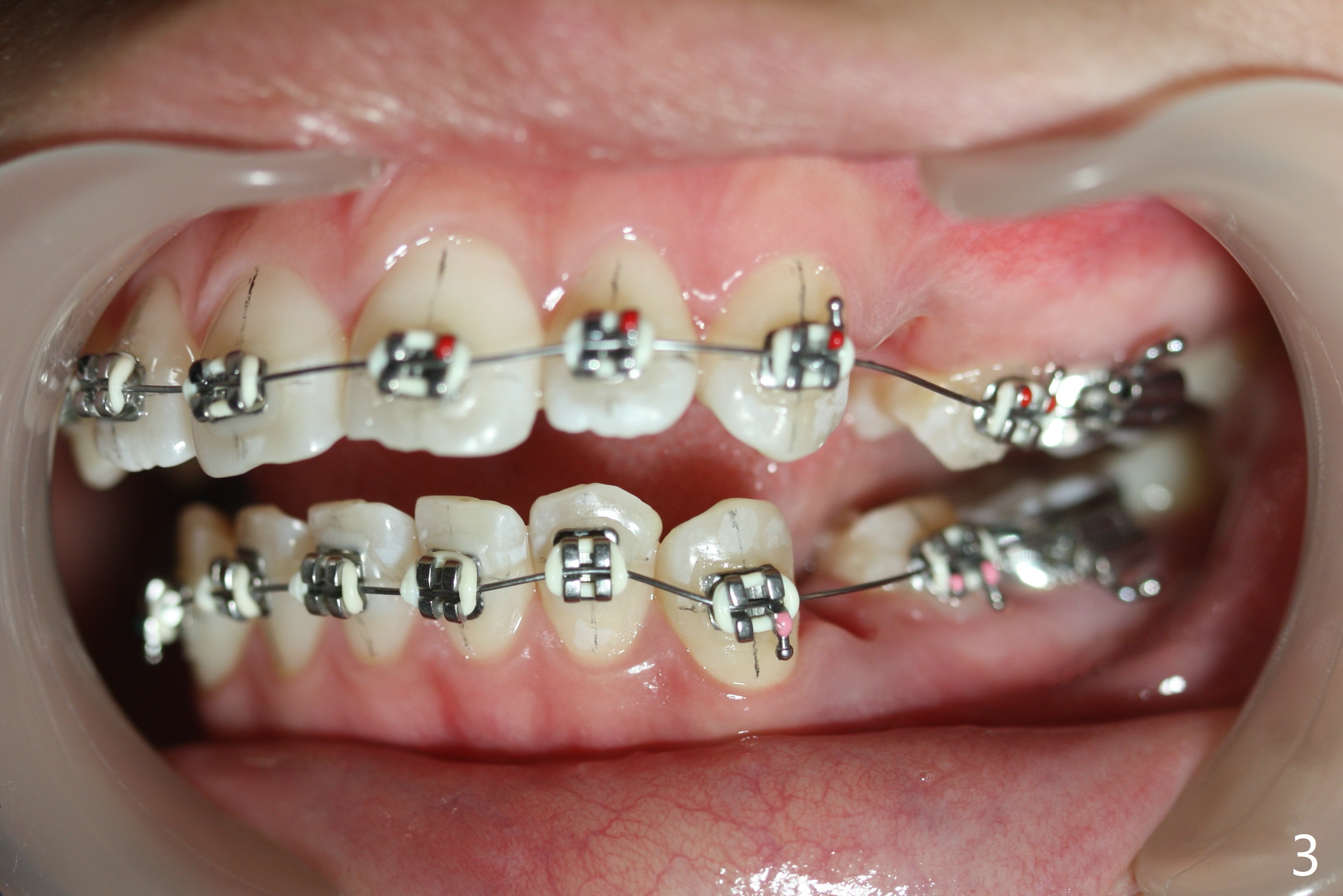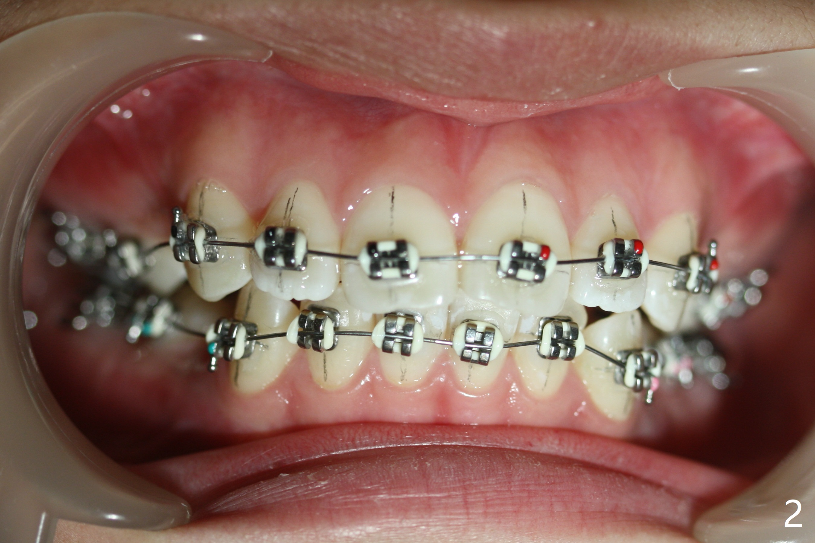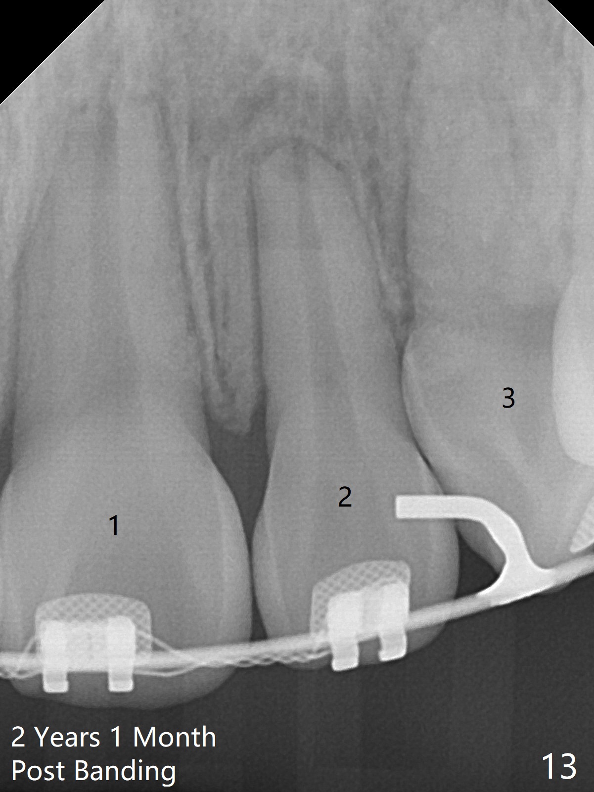 Two weeks post extraction of 4 bicuspids, brackets and bands are placed in 20 teeth (Fig.1-3, 14 niti). No bands are placed at 7s because of short crowns and tight contacts. When 16x16 wires are used, start Class II retraction. The latter is initiated with elastics when 18 ss wires are placed (Fig.4,5). U3s have been distalized with closed springs for 3 months (Fig.6,7). U2s are close to distalization 13 months post banding, 3.5 months post posted wire (Fig,8,9) with overjet (Fig.10). Class II retraction is re-initiated. When the upper incisors are retracted, the anterior overjet remains large. It appears that U6s have been retracted anterior, as indicated by the space between U6/7 (Fig.11), because of no use of U7s as anchors. Brackets are just placed with 18 niti arch wire. They will be retracted distal using the rest of the upper teeth and lower teeth (using Class II retraction) as anchor. There is root resorption of the upper anteriors 2 years 1 month post banding (Fig.12,13).