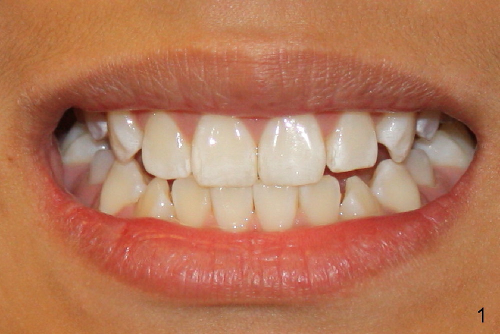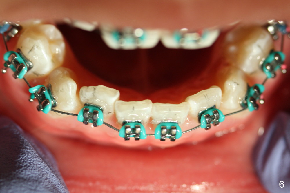 Joshua, 11 years old, has dental crowding (Fig.1), particularly in the lower arch (Fig.3) with molar Class I relationship (Fig.2). The lower 5s rotate (Fig.2 black lines), which are corrected with power chains (Fig.4,5) after bracketing and placing .012" niti wires (Fig.6).