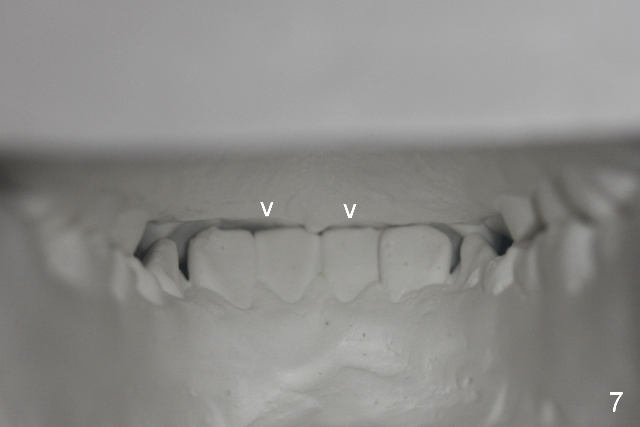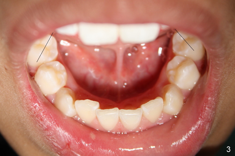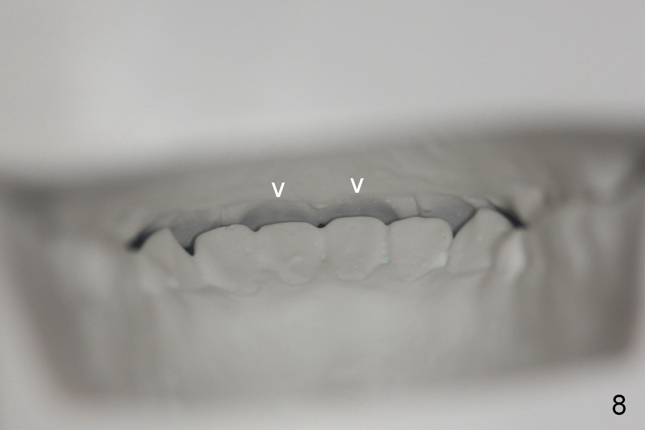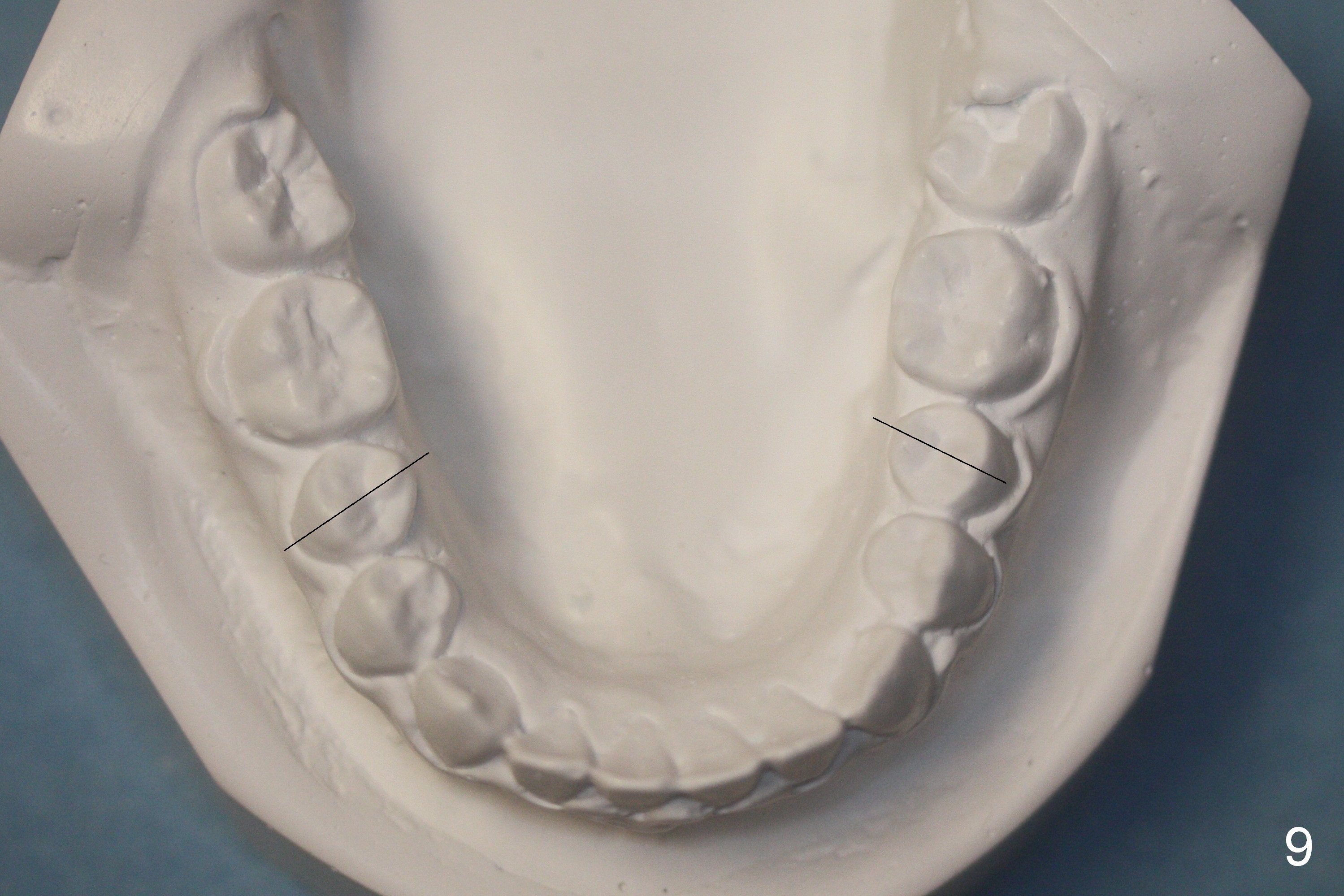 The orthodontic treatment finishes in 9 months. Incisor overbite improves (compare Fig.7,8 (lingual view of the anterior arches; arrowheads: upper palatal gingival margin)). The rotation of the lower 2nd bicuspids (Fig.9 black lines, as compared to those in Fig.3) and the crowding of the lower anterior teeth (Fig.9) also improves. Two years later, the latter relapses.