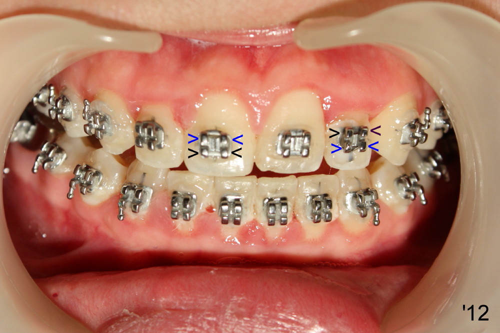 Normally the lower wings of upper anterior bracket (Fig.'12: UR1 black arrowheads) are wider than the lower wings (blue arrowheads).