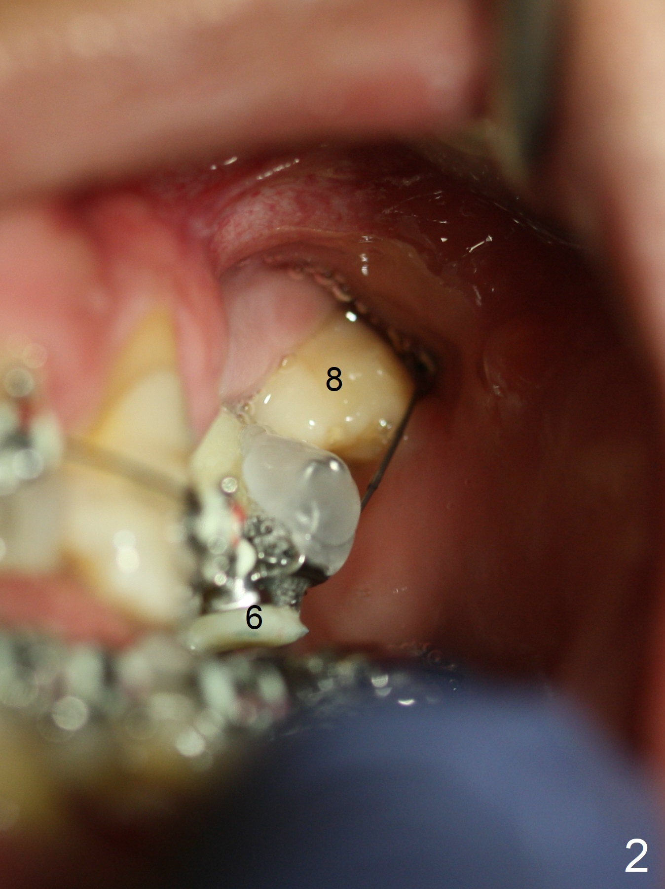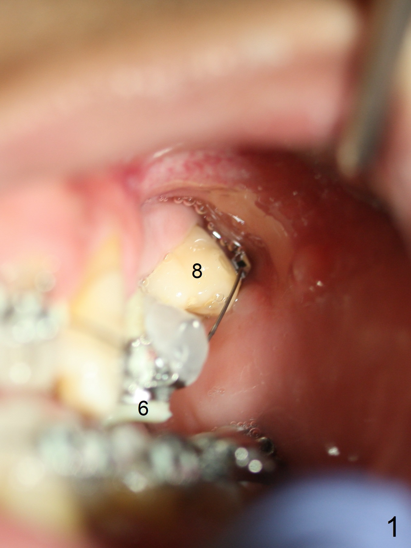 The provisional at UL6 (implant, as an anchor) is refabricated with normal overjet with LL6 prior to bracketing and banding for comprehensive orthodontics. There is discrepancy of bracketing/banding between UL 6 and 8 (Fig.1,2 (12, 14 niti wires (upper and lower arches)). The upper wire is also roller-coaster between UL3 and 6 (Fig.3).
