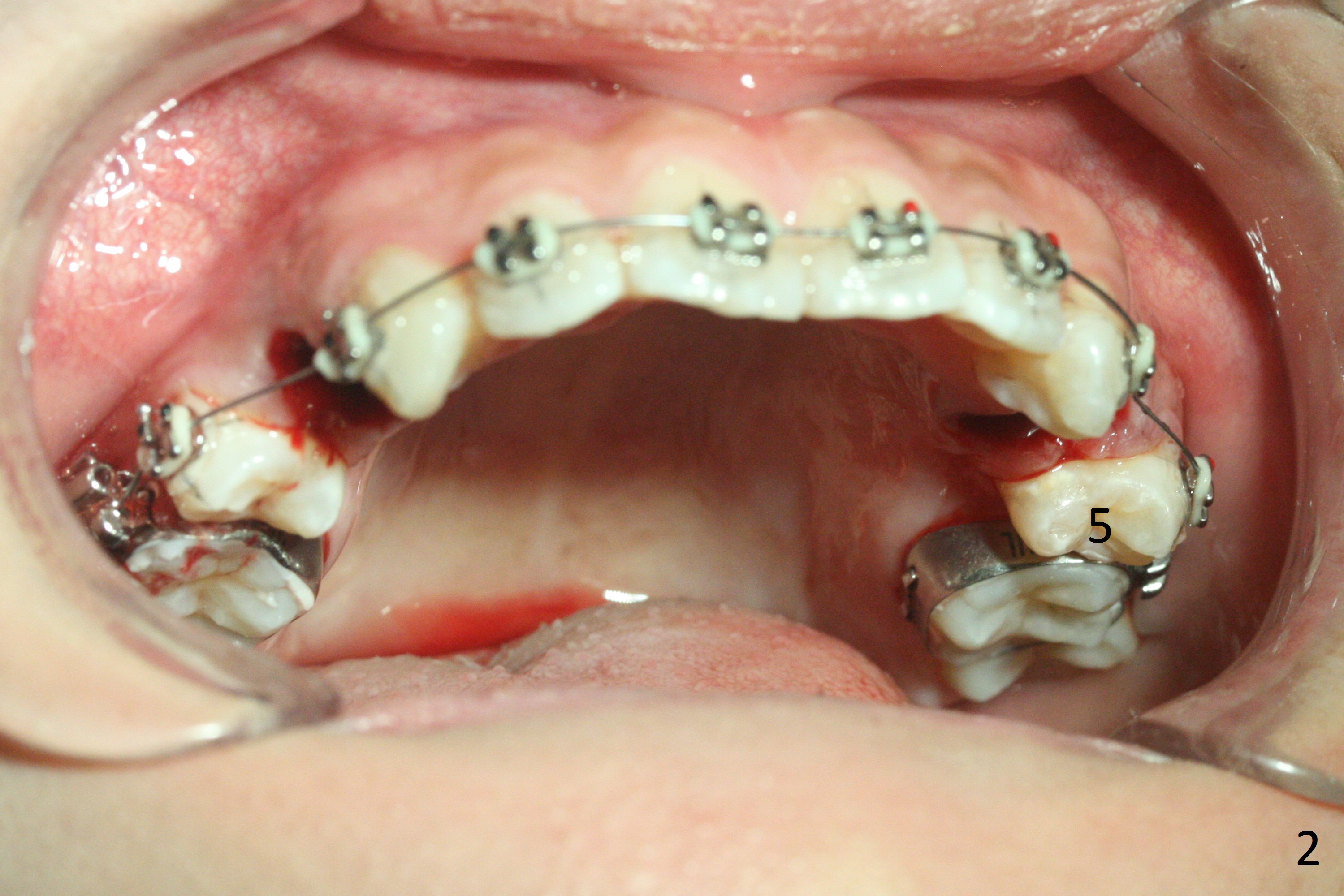 When the 17-year-old woman returns for banding, she has no problem with extraction (Fig.1). Since UL5 is buccally displaced, it is extremely difficult to insert .012 niti wire into the 1st molar band when the lower tube slot is smaller (apparently .018 instead of .022, Fig.2). Do not remove the thin niti wire before the bicuspid is linguolized.