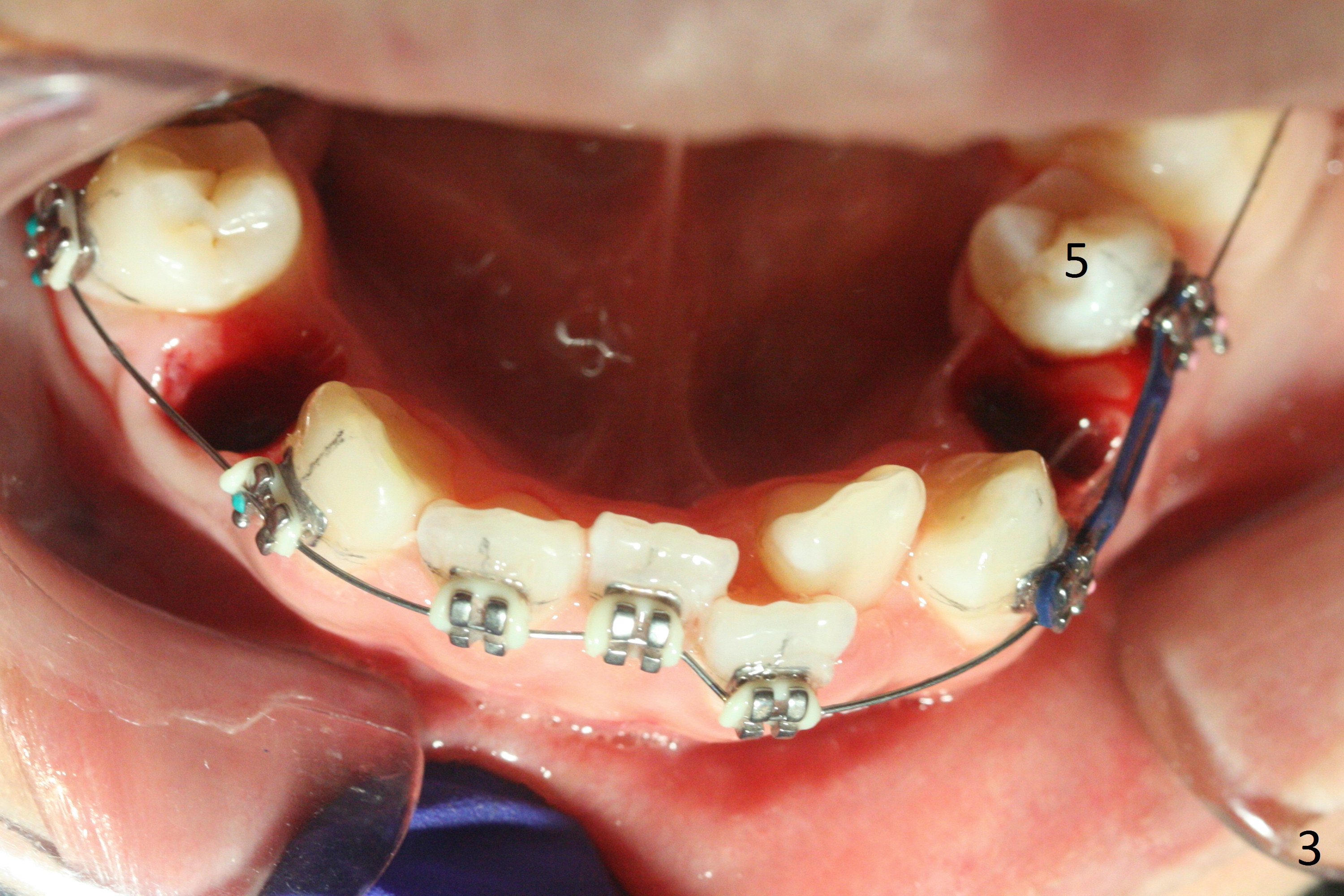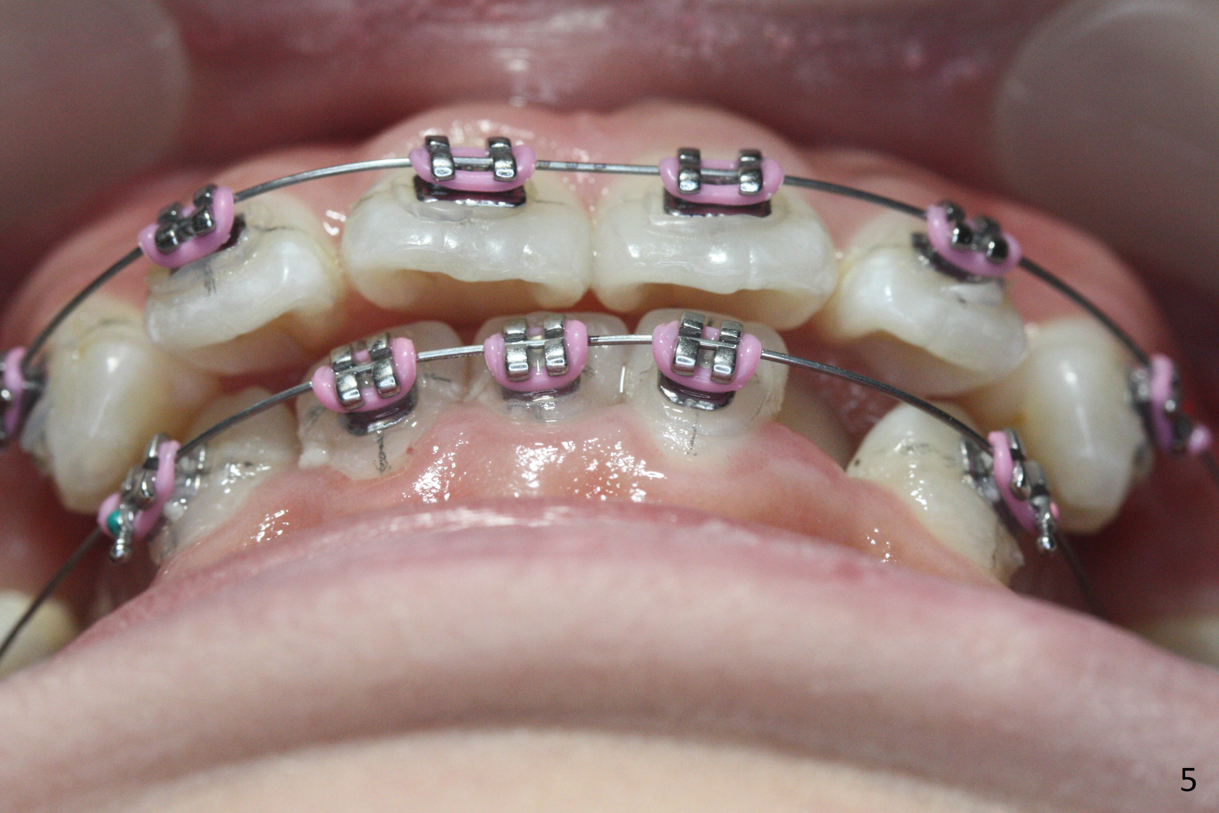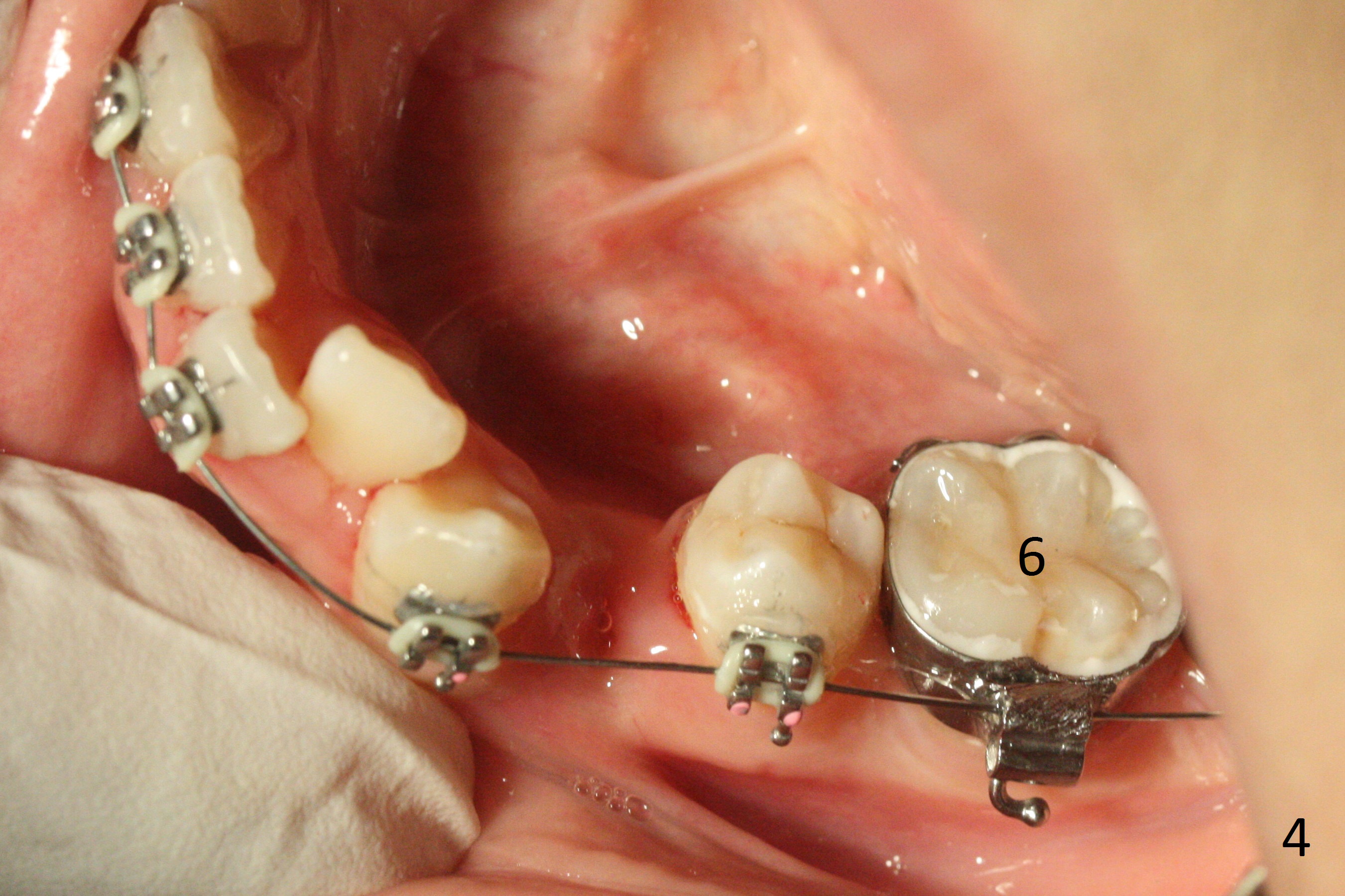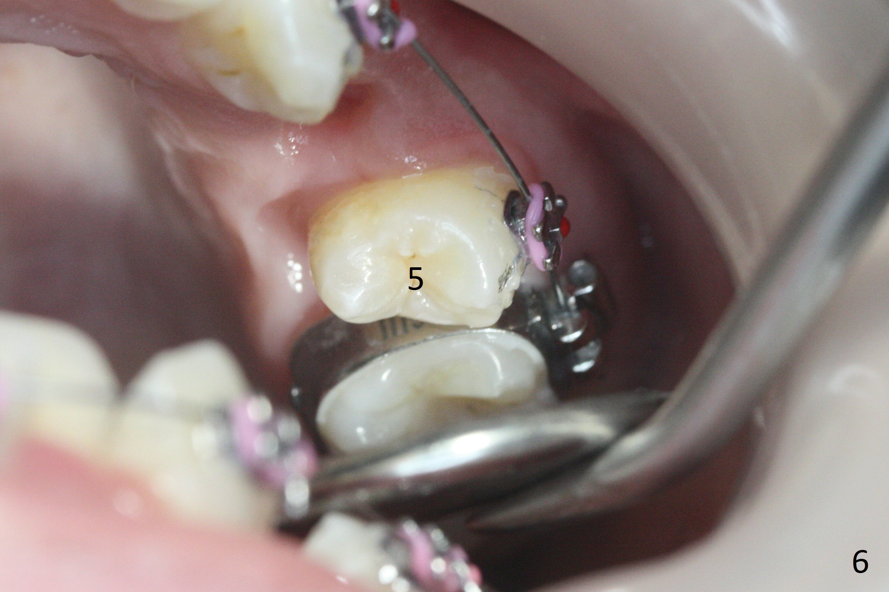In fact there is enough space for banding at LL6 with reuse of 12 niti (Fig.4). Anterior crowding improves 1 month post banding (Fig.5, as compared to Fig.1-3); there is no difficulty in place 14 niti wire between UL 5 and 6 (Fig.6, as compared to Fig.3), since UL5 has been lingualzied.
