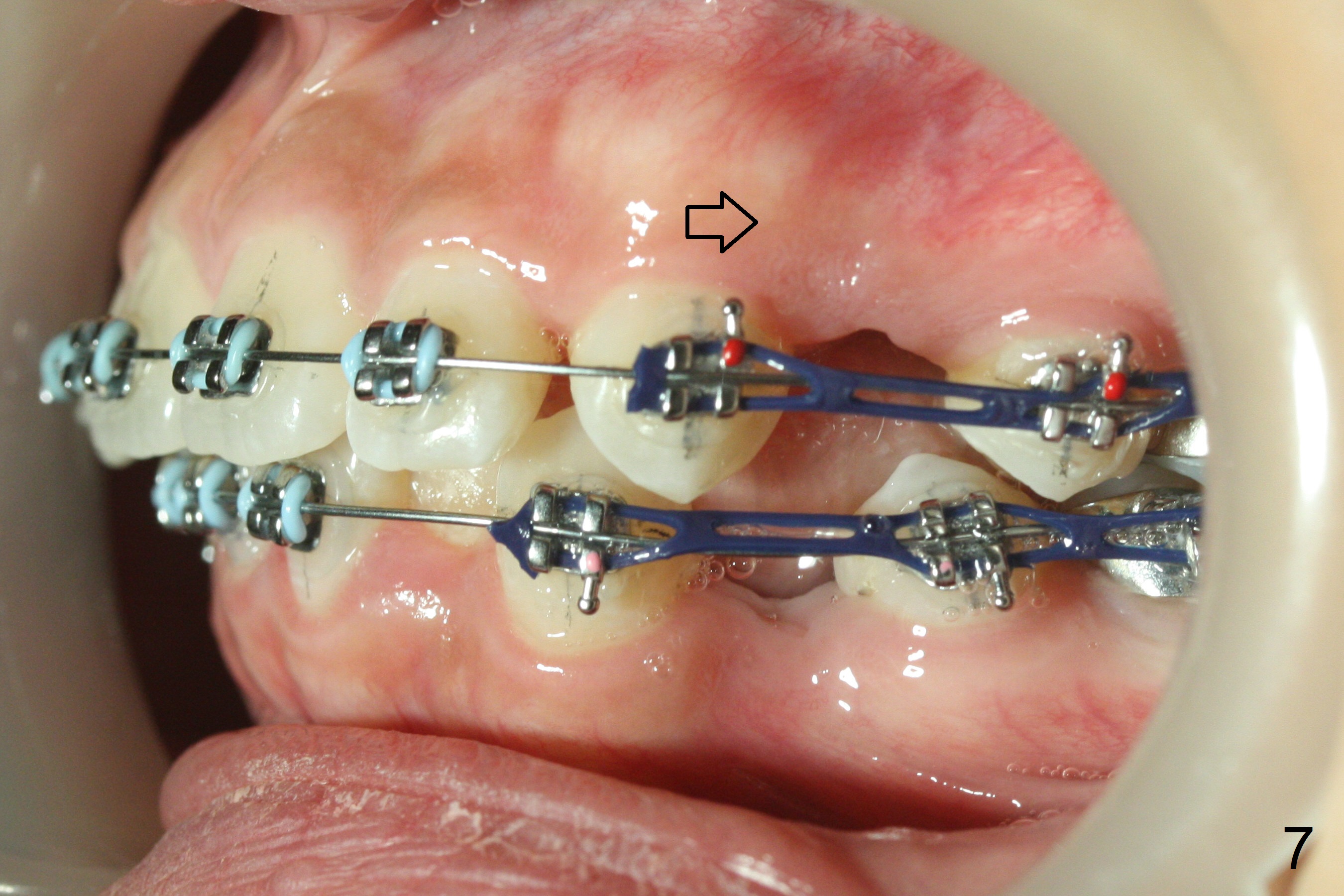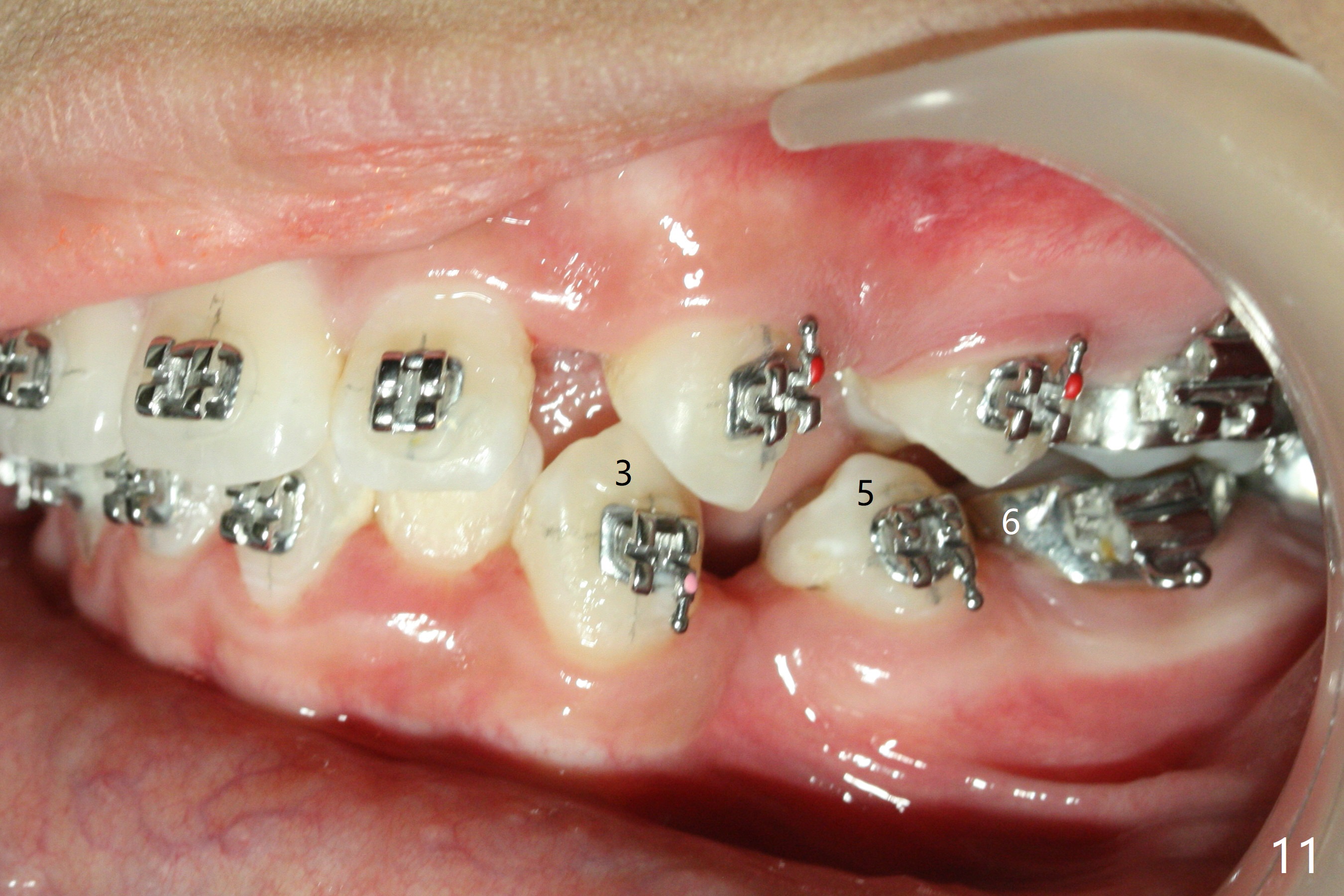 To tackle the 1st issue, there are 3 options. First, extract the 1st bicuspid in advance and let the 2nd bicuspid lingualize by itself. Second, simply extract the displaced 2nd bicuspid. Third, also place power chains between 3 and 5 after extraction of the 1st bicuspid.