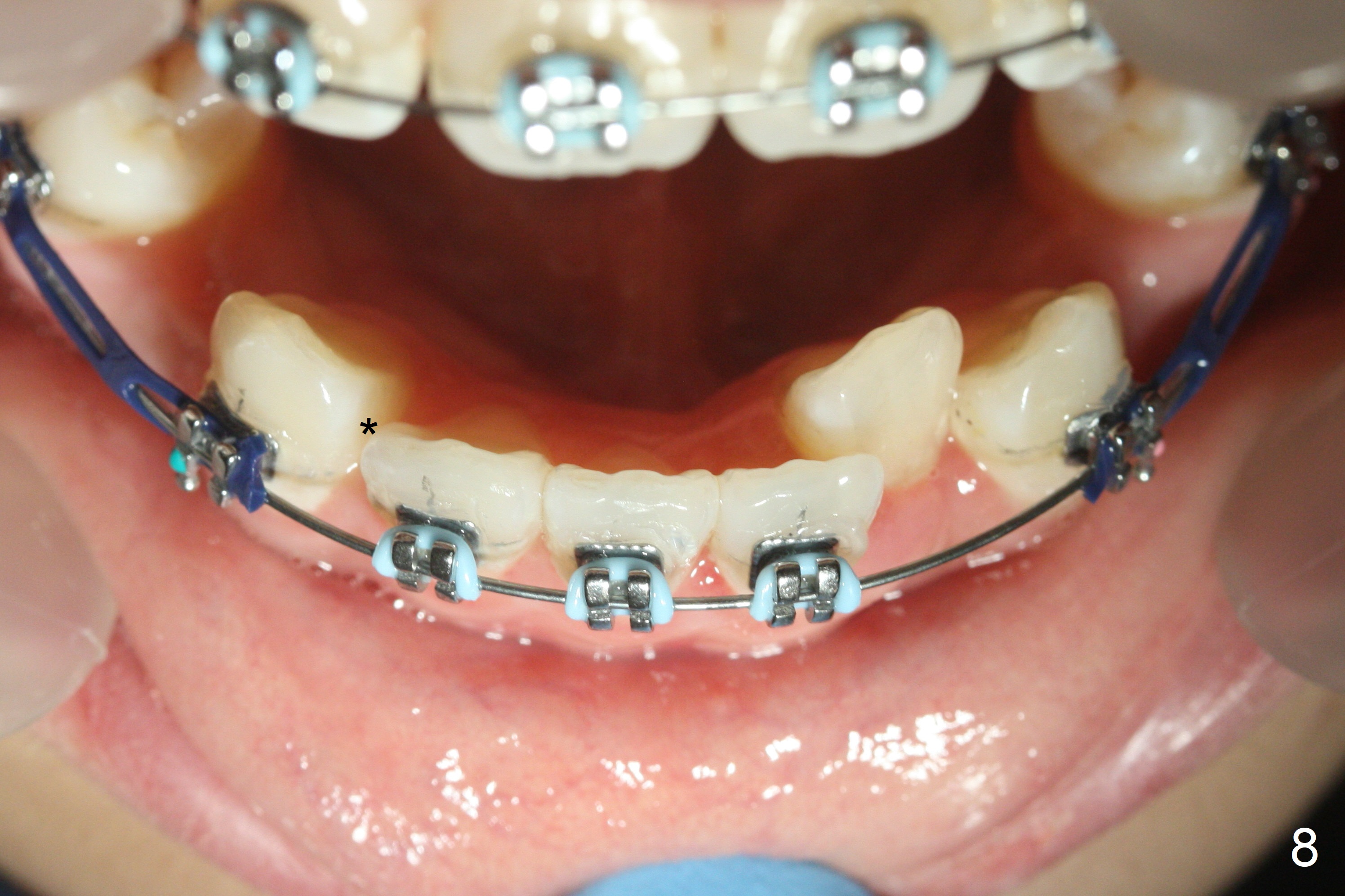 Nearly 3 months post extraction, UL 3 (Fig.7 arrow), LR 3 (Fig.8 *) and UR 3 have distalized by themselves. After changing 16 niti wires, power chains x 4 are placed between 3 and 6 (Fig.7,8) to lay foundation to reduce upper anterior overjet and lower crowding (including LL2 linguoversion). When the space between LR 2 and 3 increases (Fig. 8 *), it will be easy to shift the lower midline (Fig.5) to the right as an open coil spring will be placed between LL 1 and 3. Check the facial and dental midlines next visit before removing the wires.