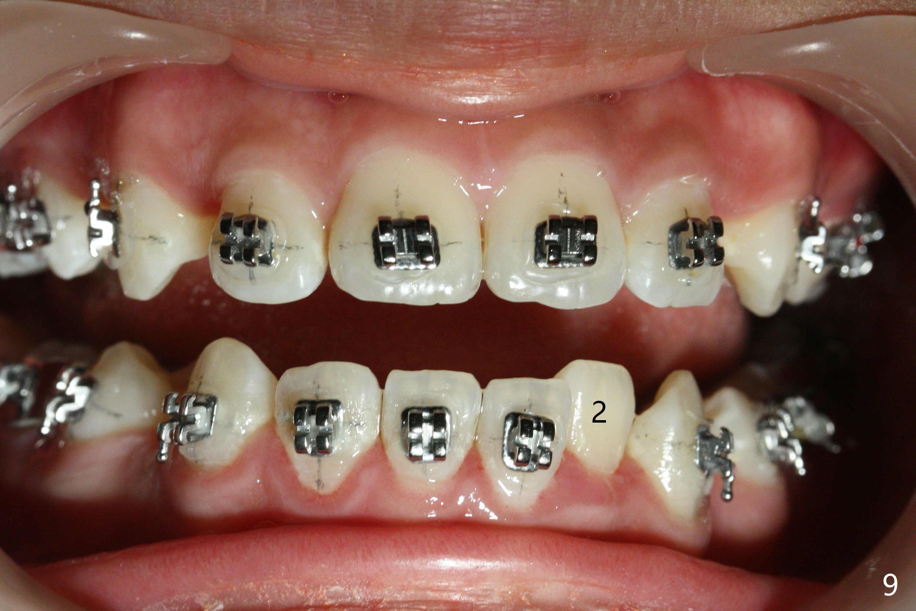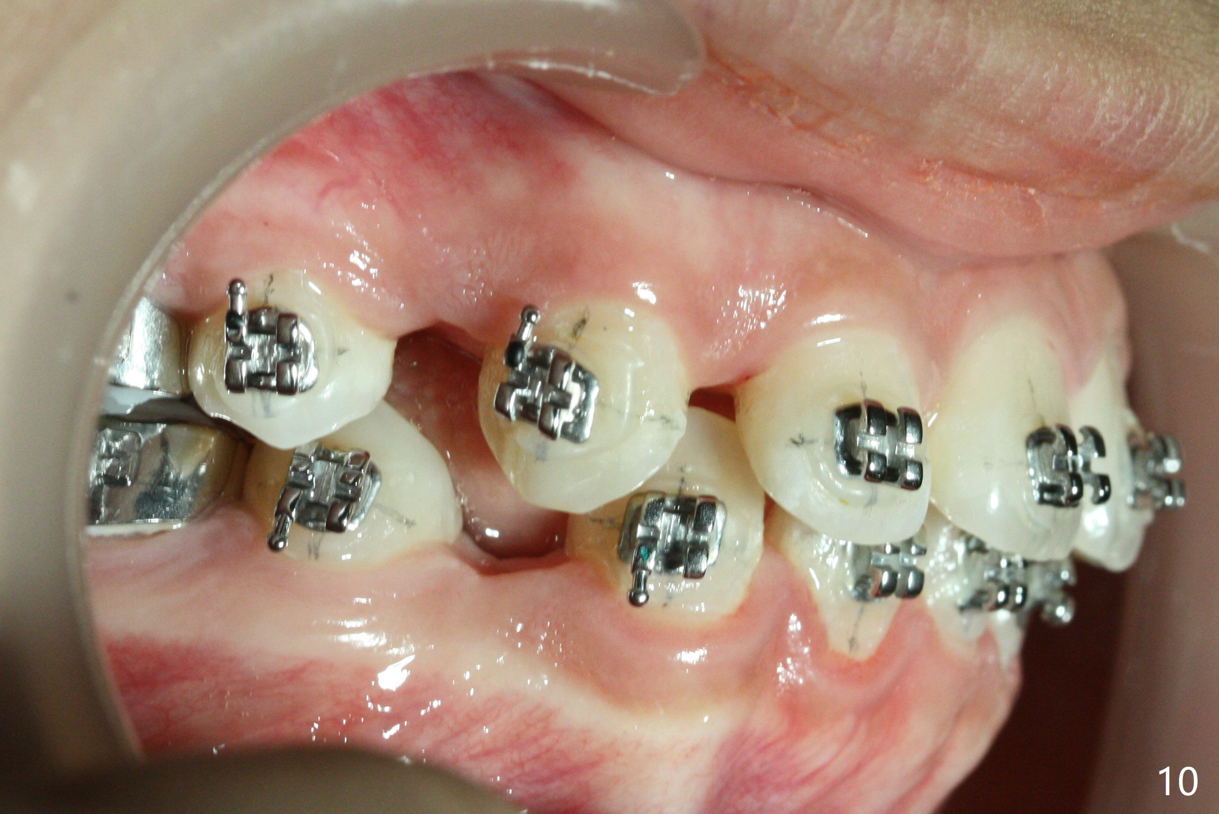 Due to moving out of state, the patient returns 2.5 months post last visit (5 months post banding). No sufficient space has been created for LL2 (Fig.9), while U3s have been distalized (quicker than the lower counterparts (because of soft bone)). The upper wire is changed to 18 niti without power chains, while the lower one remains 16 niti. Ligature wire is applied to LL5 and 6 as an anchor, while power chains of two are placed between LL3 and 5. Next visit add open coil spring between LL 1 and 3 for the lower midline correction as described above.