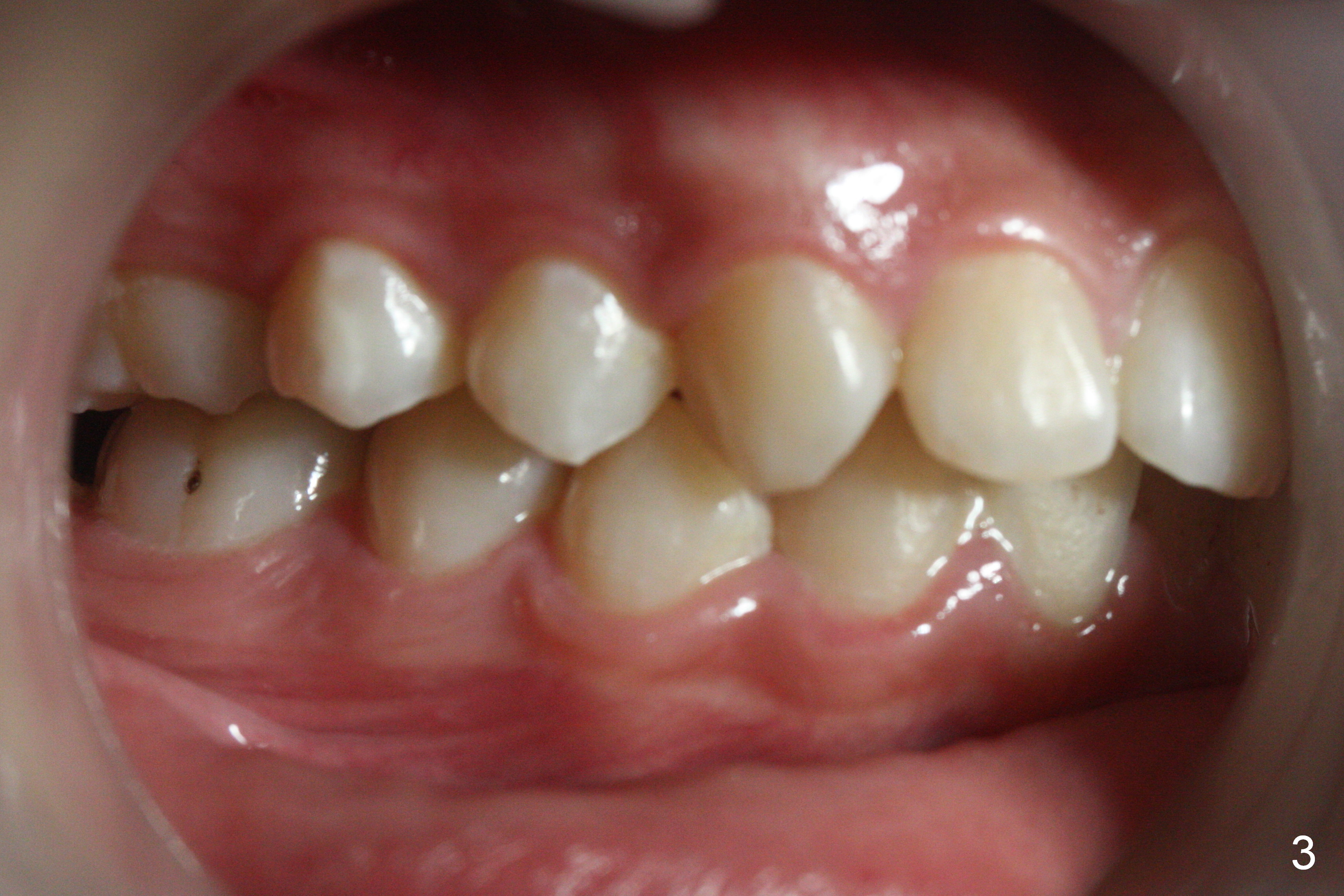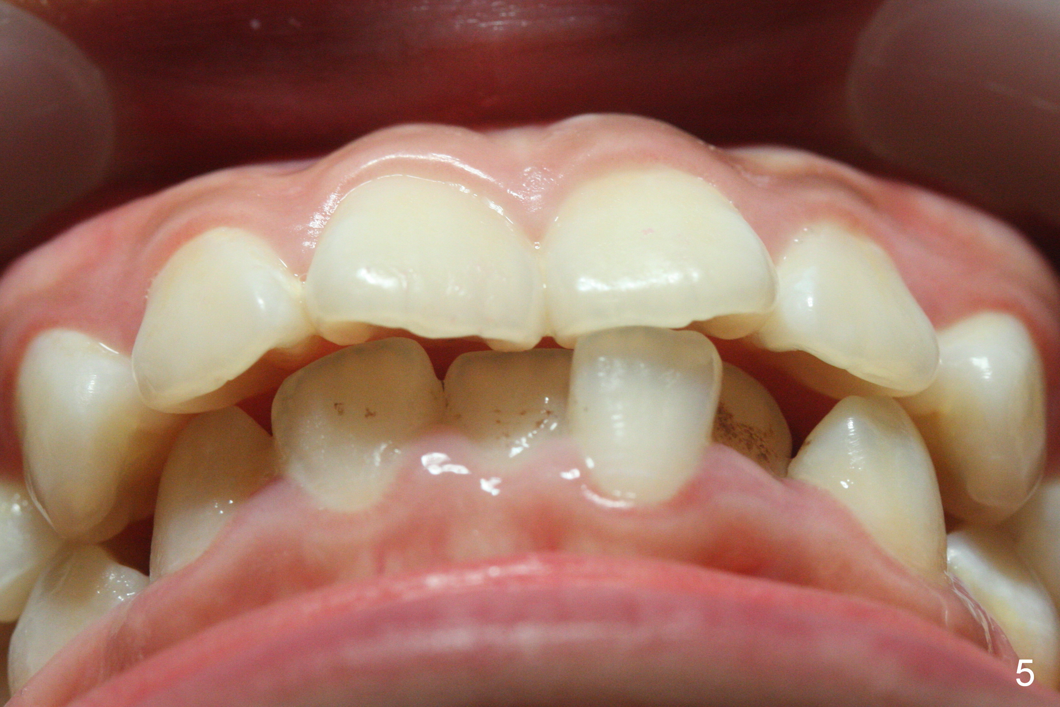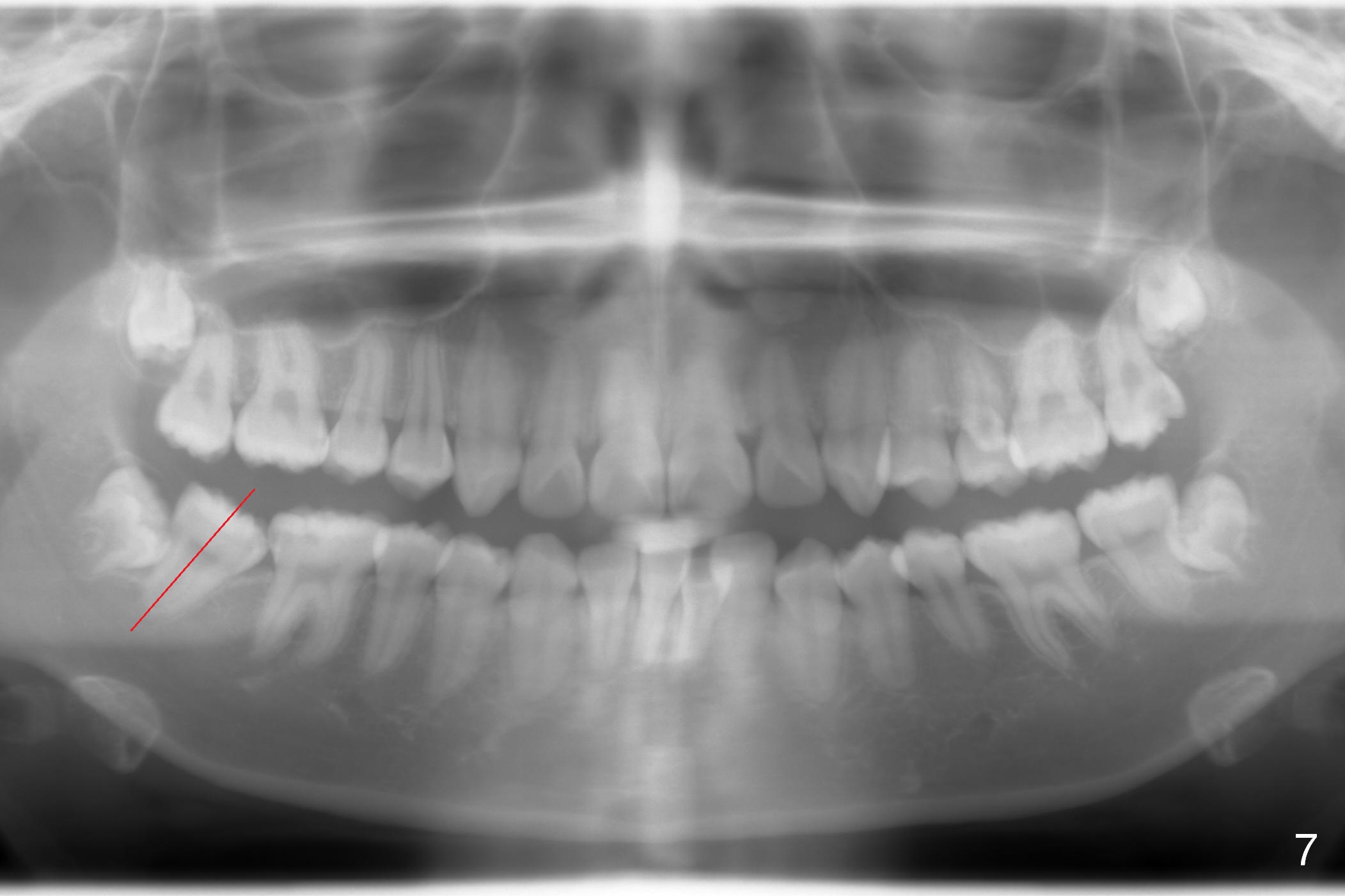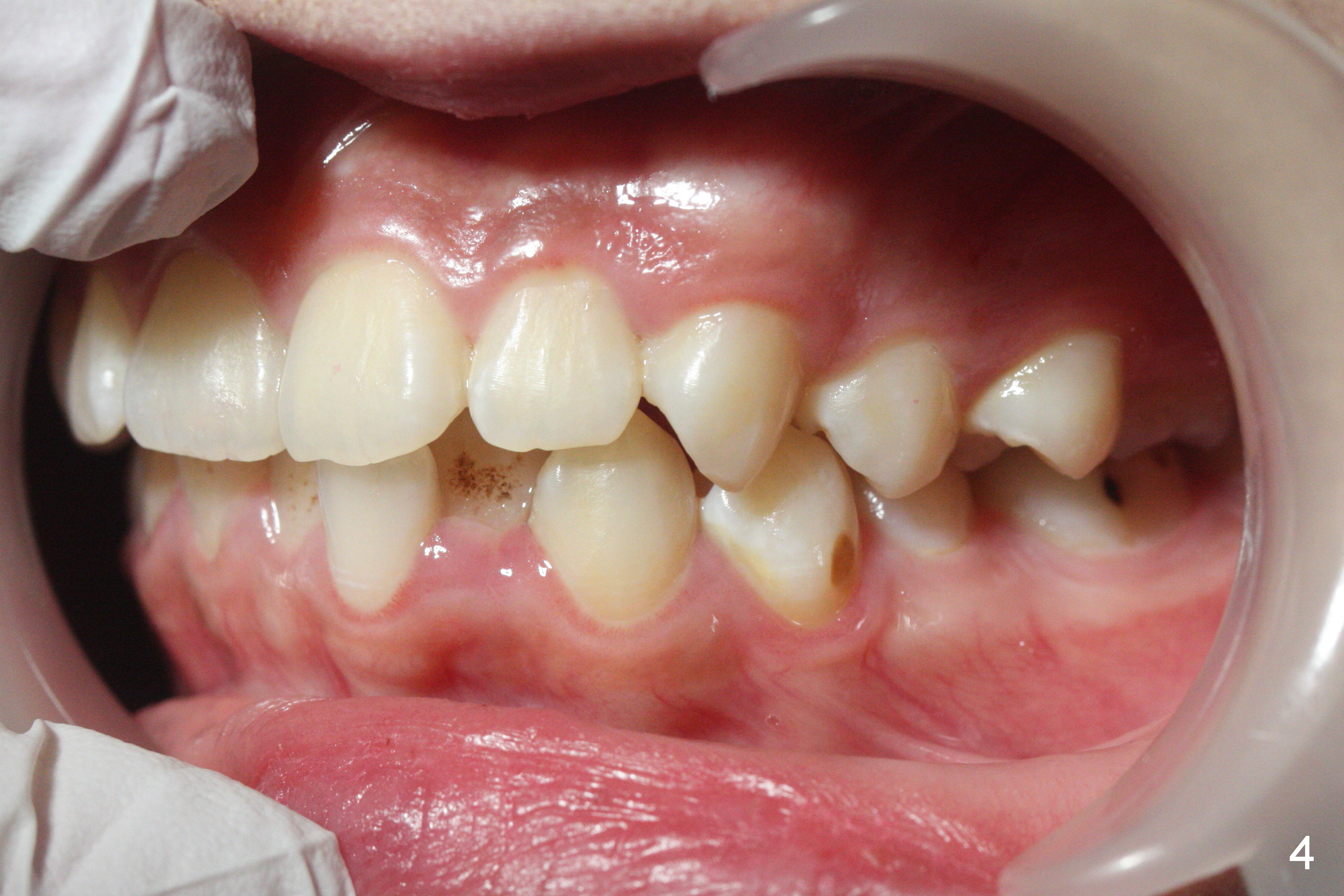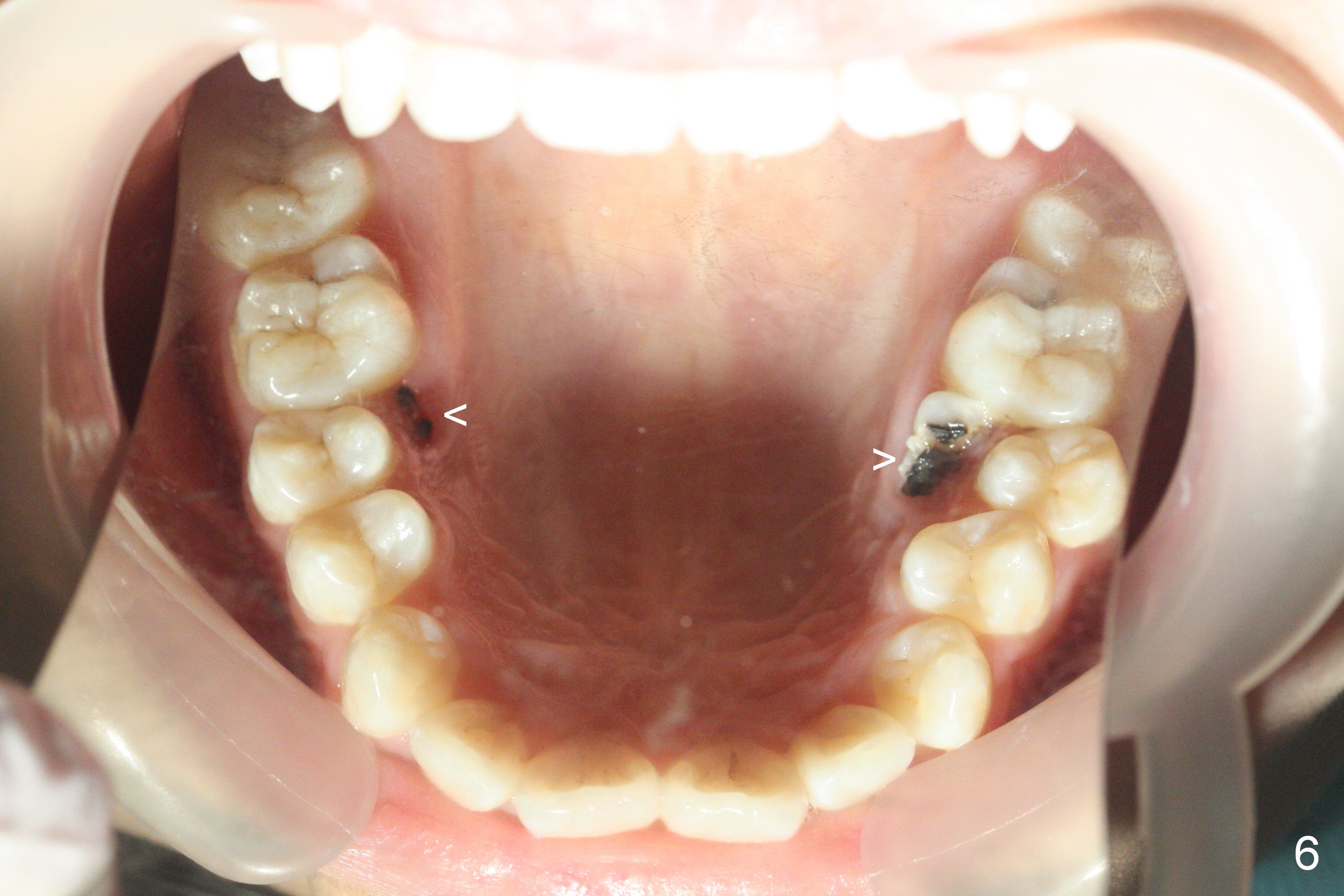 A 17-year-old woman will return for bracketing after caries control and deciduous tooth (Fig.6 arrowheads) extraction. Her profile is slightly protrusive (Fig.1,2). Crowding is more severe in the left posterior region (Fig.4) than the right one (Fig.3). The anterior crowding is also severe (Fig.5). Proximal reduction and use of power chain for constriction will be used instead of extraction of 4 bicuspids. Third molar extraction may have to be done prior to banding, especially for the lower right 2nd molar (Fig.7).
