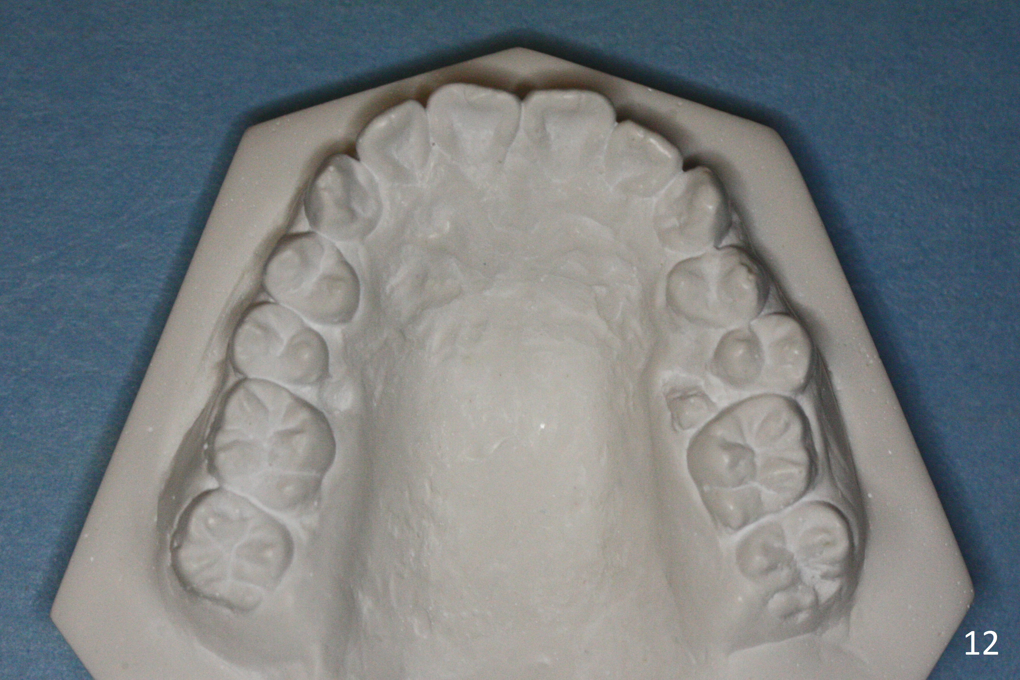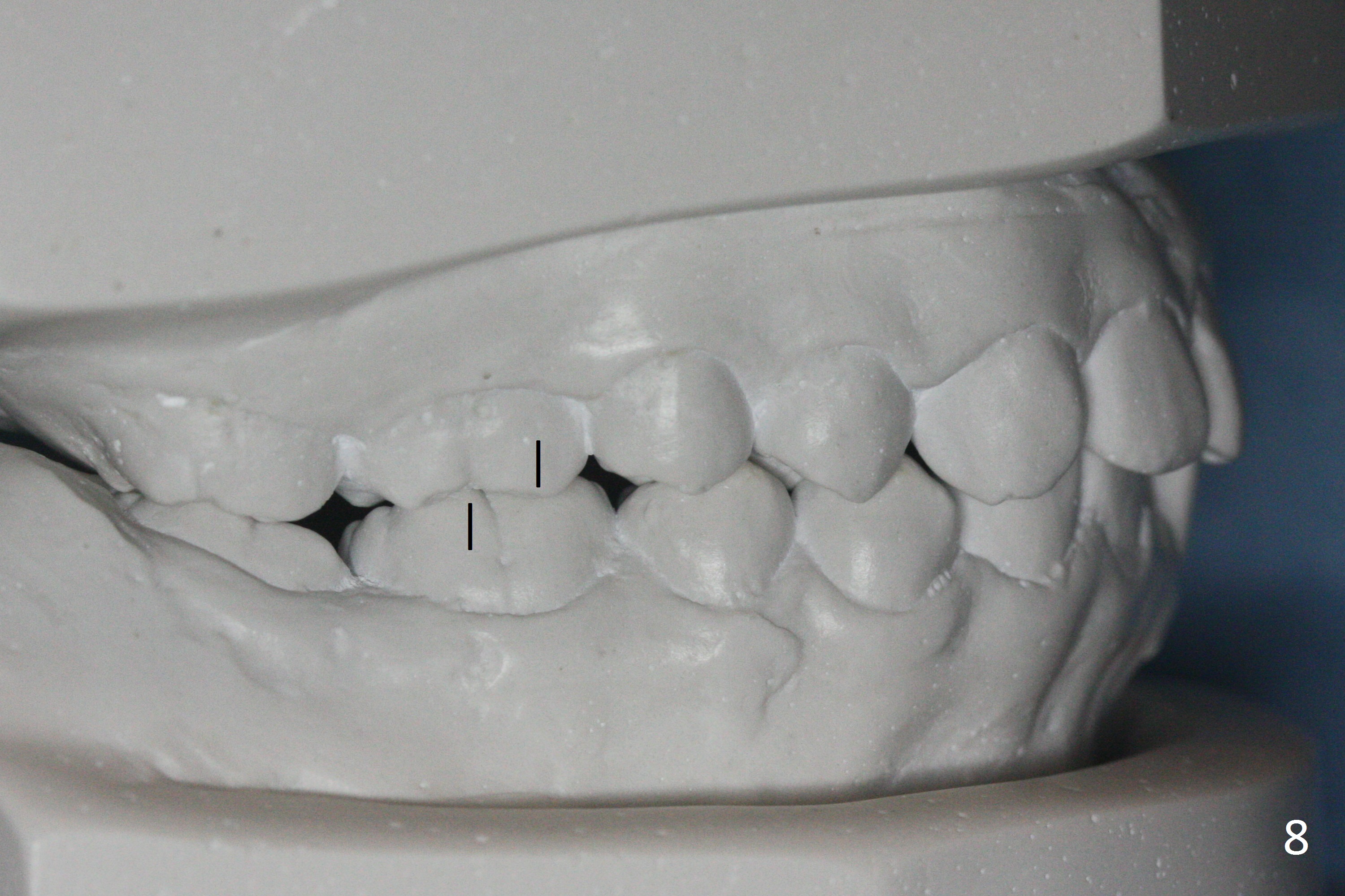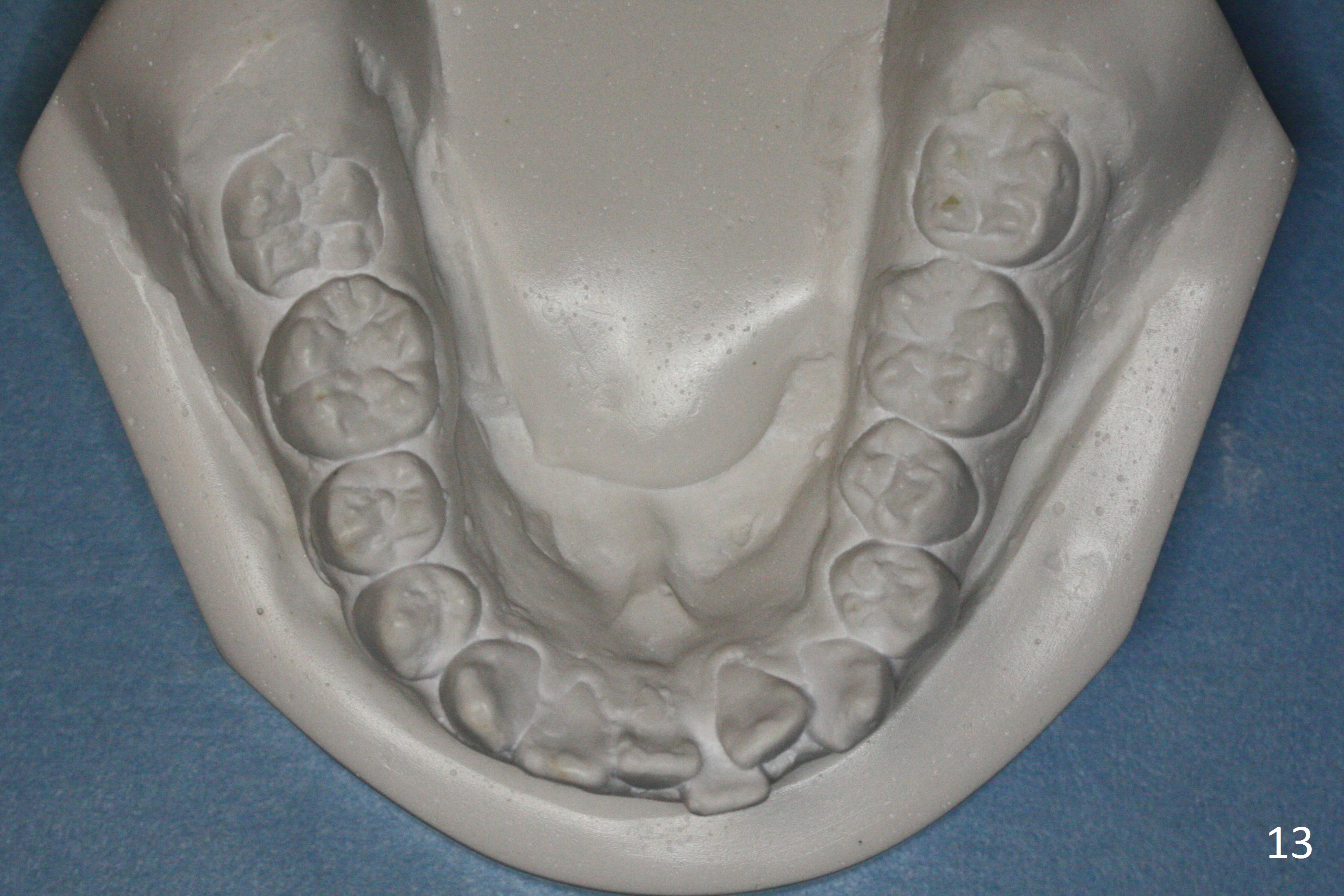 By looking at preop models (Fig.8-13), do you think whether extraction is a better option than non-extraction? Class II occlusion on the right (Fig.8), Class I on the left (Fig.10). With extraction of the 1st bicuspids, the posterior occlusion could be normal with further anterior protrusion (Fig.11). The upper arch is rounded (Fig.12); without extraction, the arch may turn out to be U-shaped. The lower arch is more crowded (Fig.13). Without space, the lower right 2nd molar may not be uprighted (Fig.7).