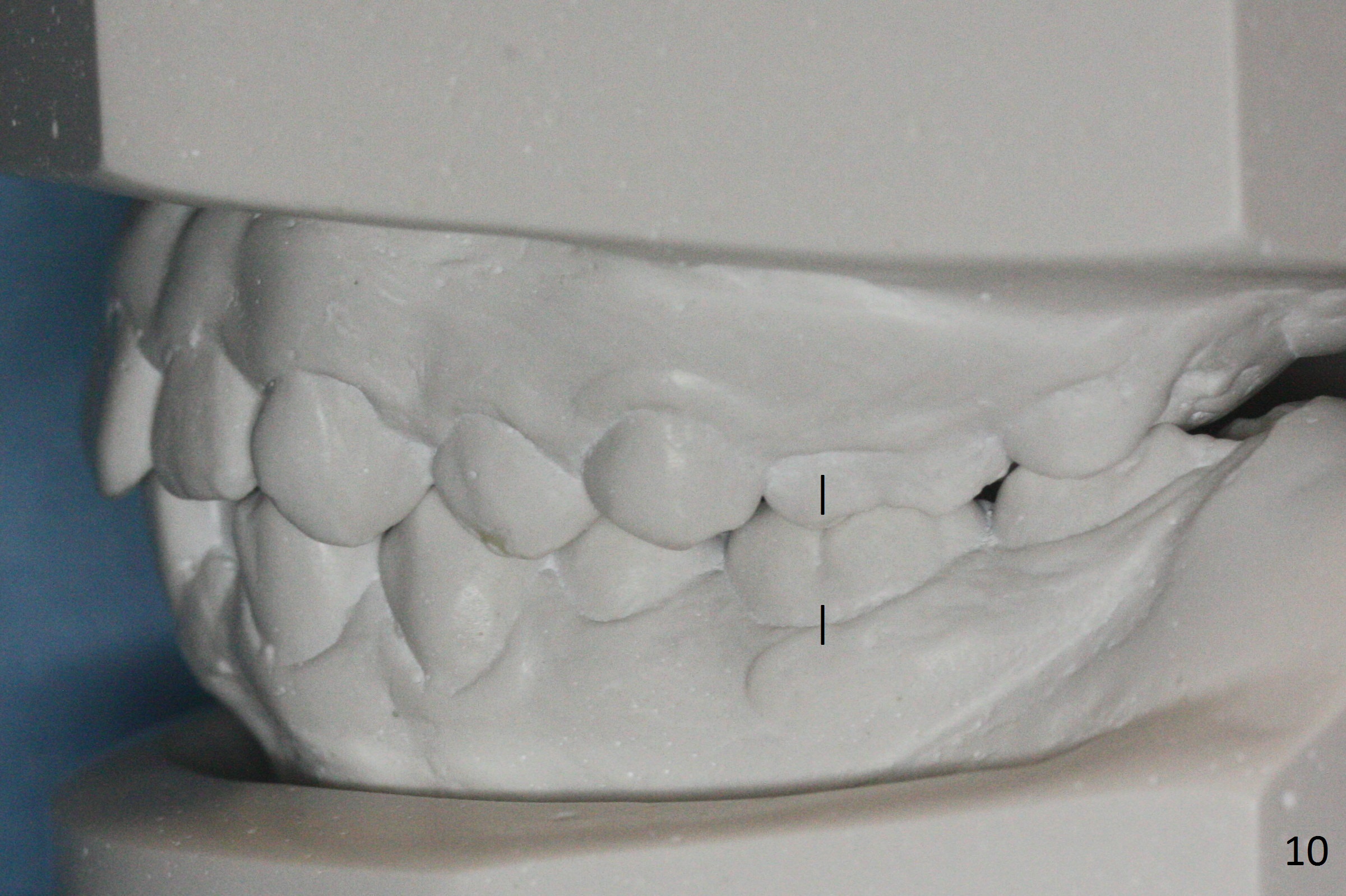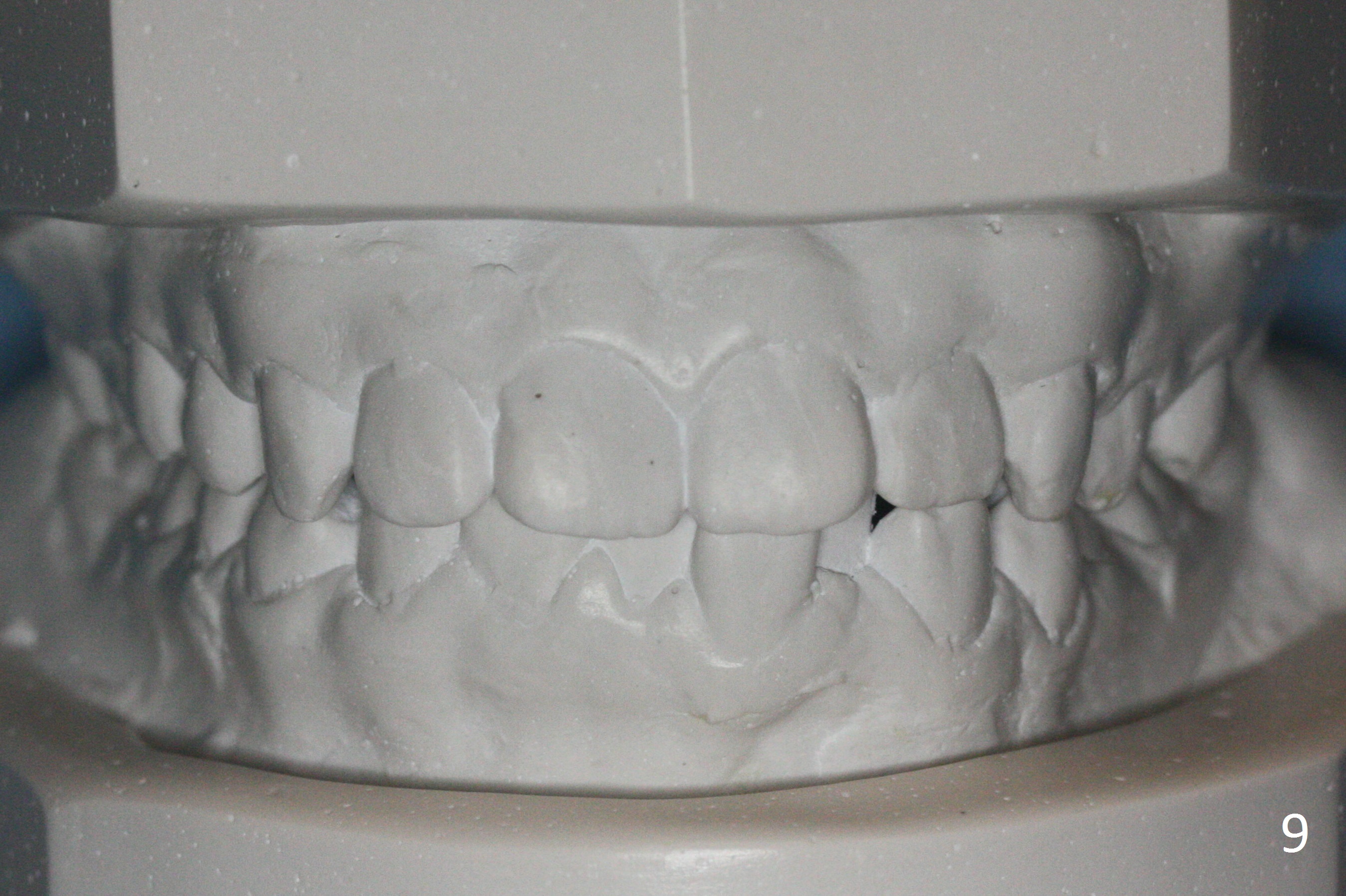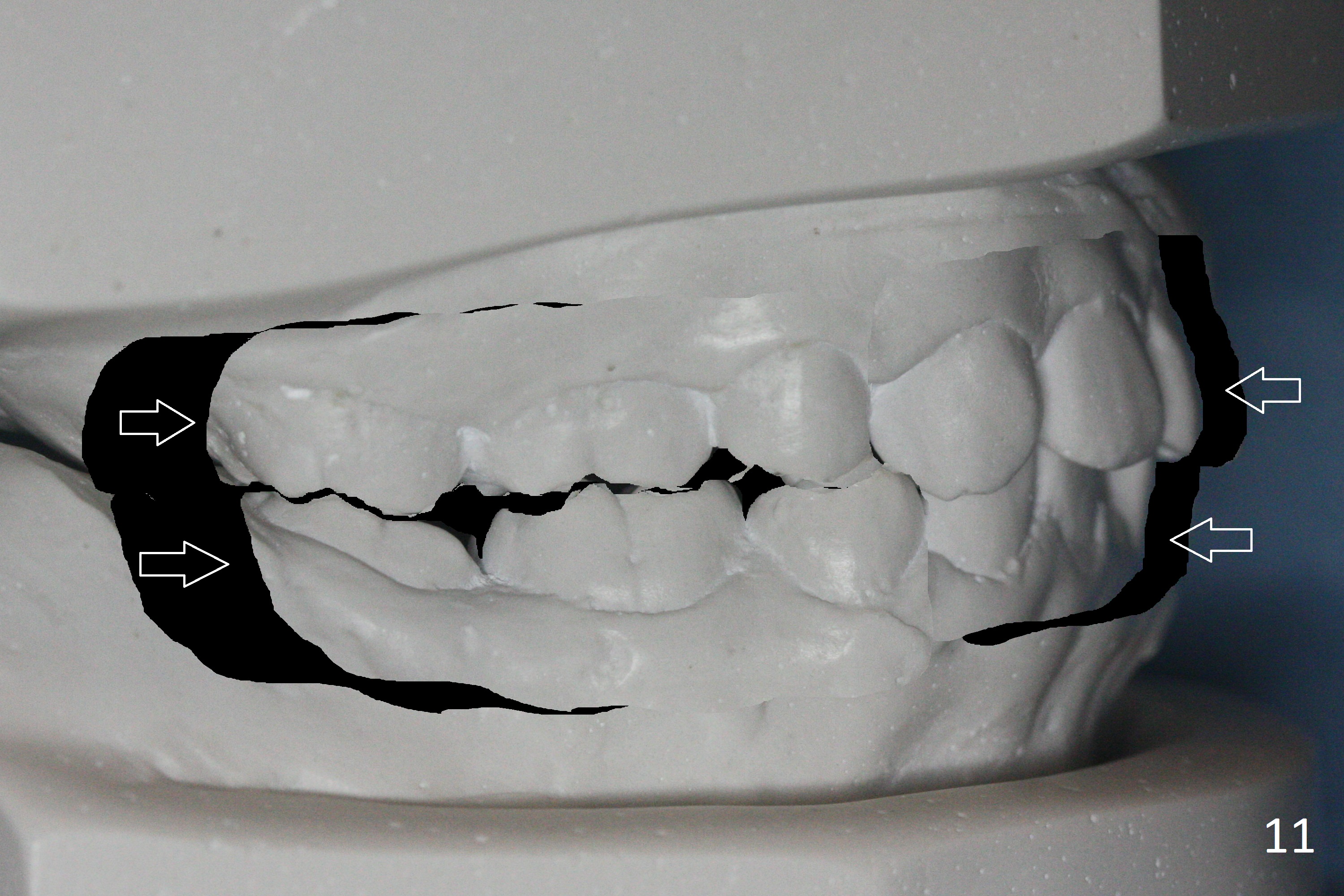 By looking at preop models (Fig.8-13), do you think whether extraction is a better option than non-extraction? Class II occlusion on the right (Fig.8), Class I on the left (Fig.10). With extraction of the 1st bicuspids, the posterior occlusion could be normal with further anterior protrusion (Fig.11). The upper arch is rounded (Fig.12); without extraction, the arch may turn out to be U-shaped. The lower arch is more crowded (Fig.13). Without space, the lower right 2nd molar may not be uprighted (Fig.7).