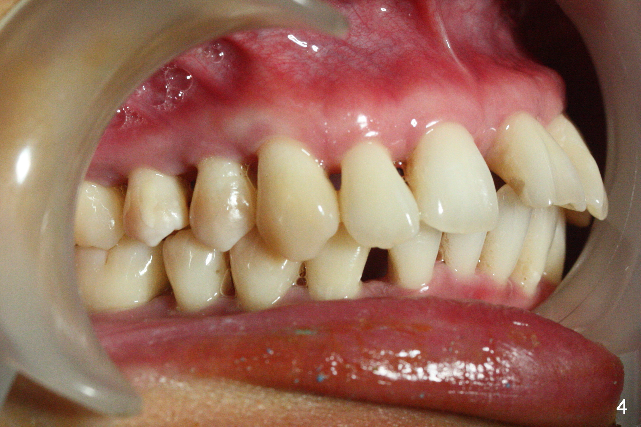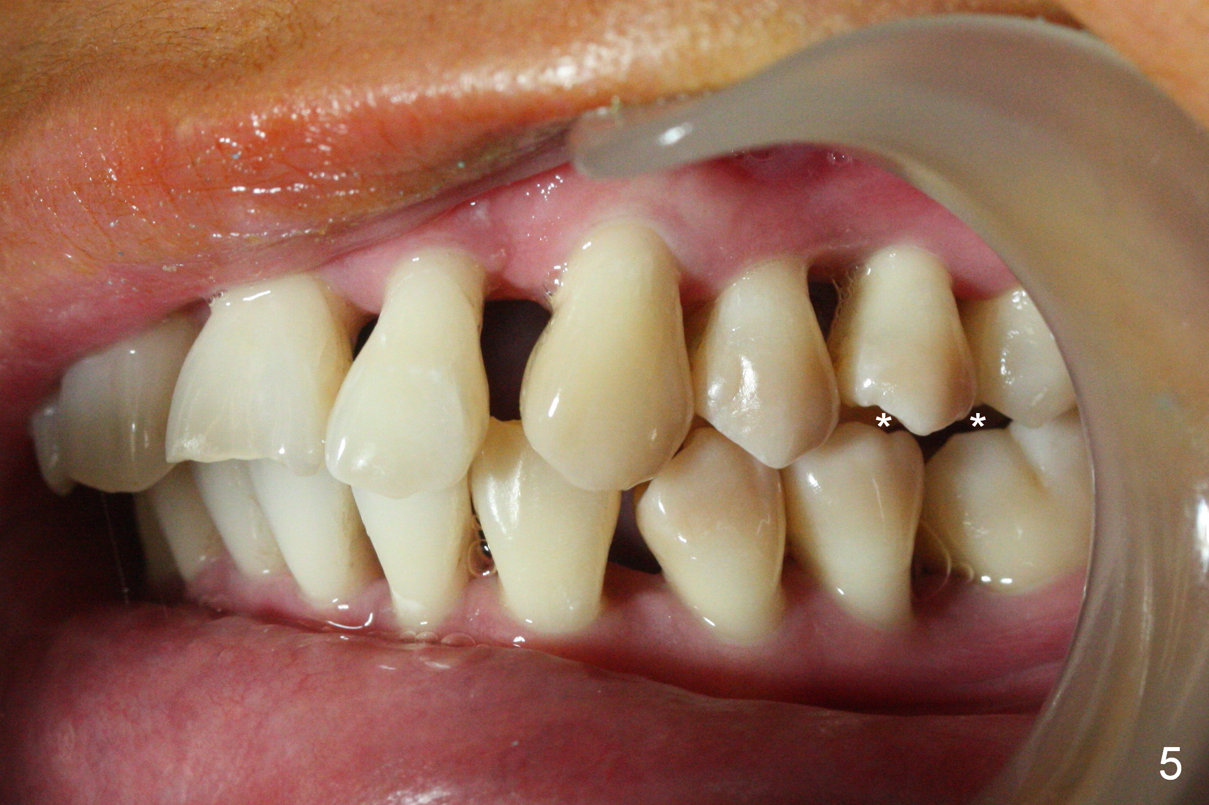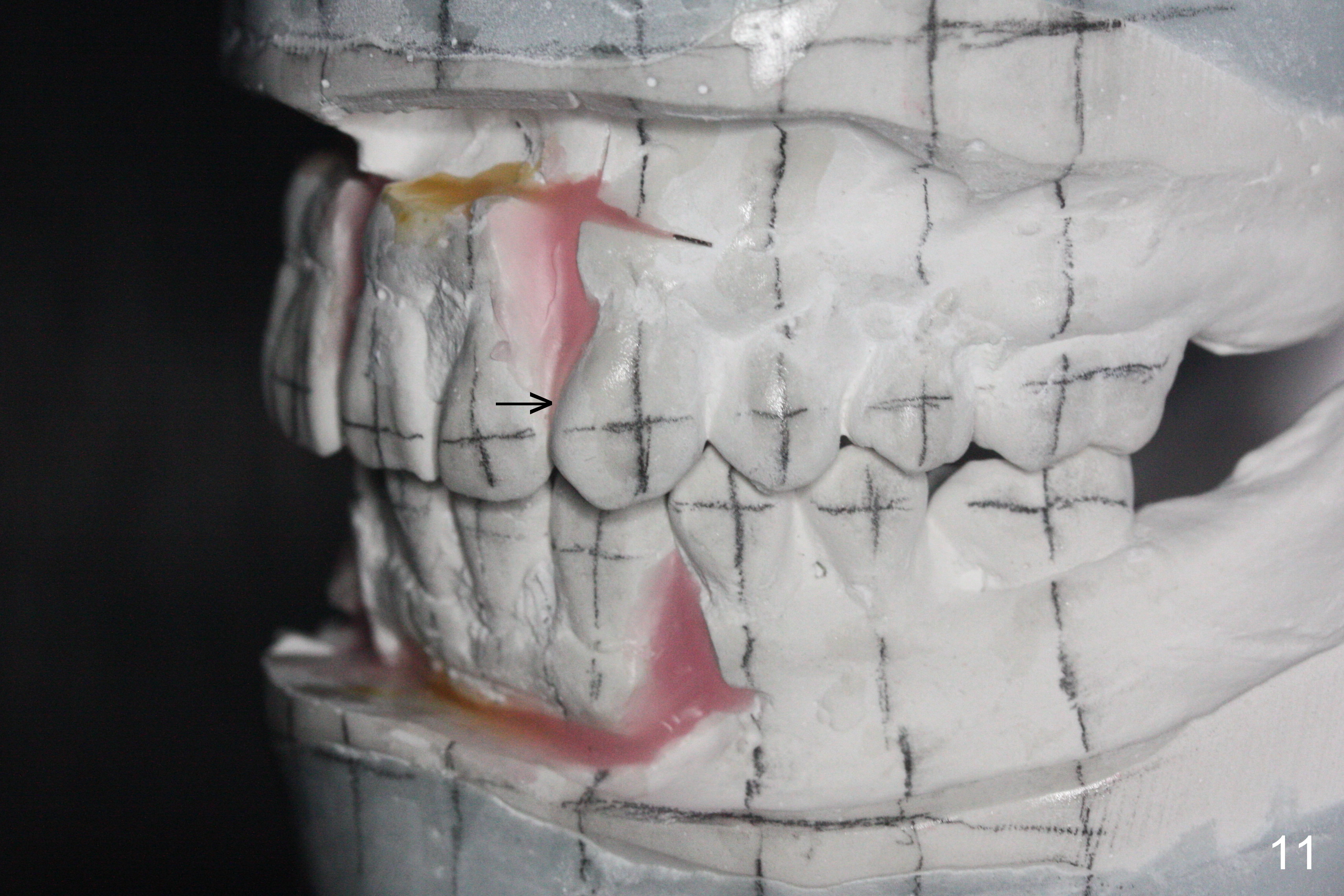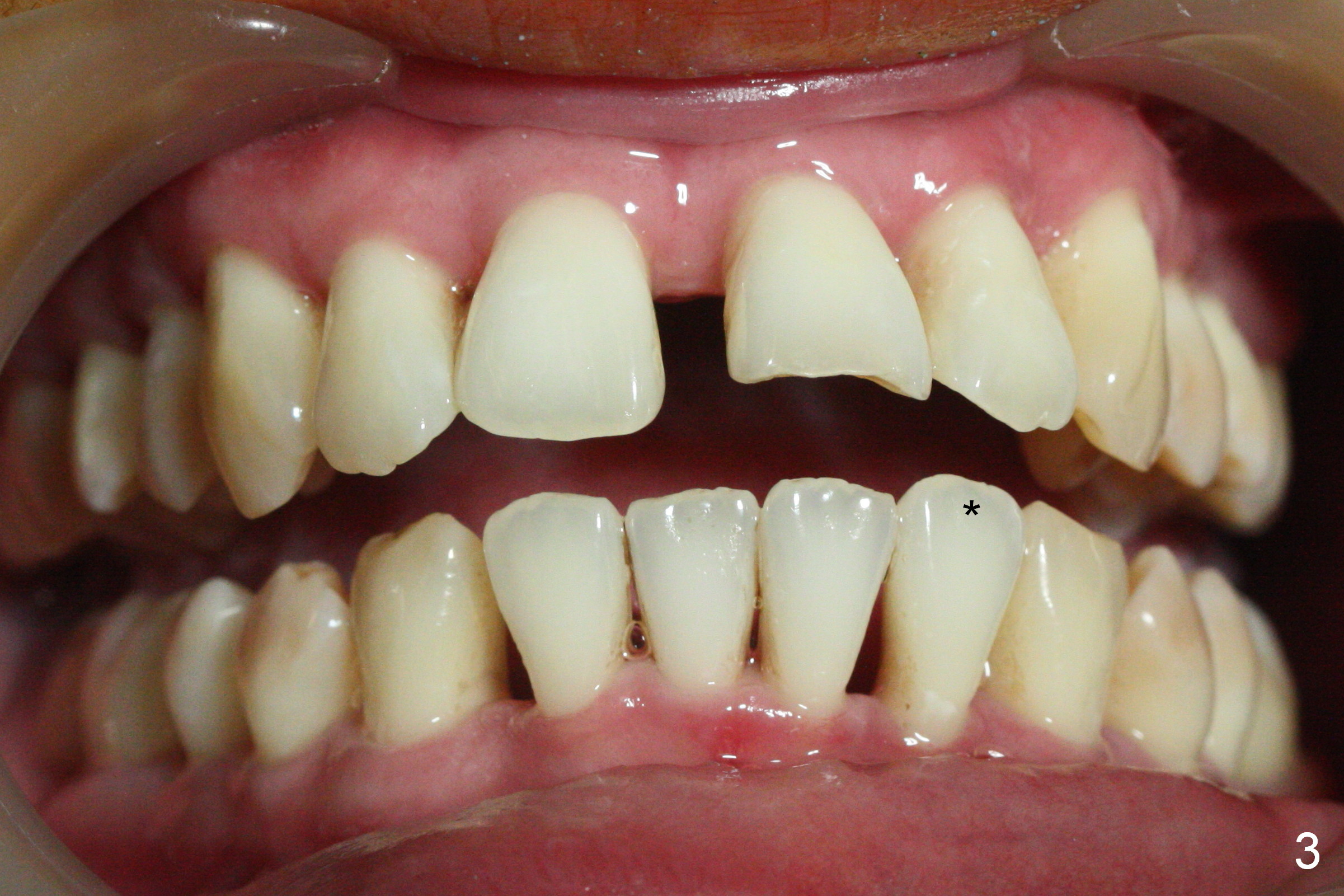 Orthodontic treatment is usually contraindicated for chronic periodontitis. Anterior tooth flaring of the 32-year-old lady (Fig.1) is also associated with excessive over bite and over jet (Fig.2) and supraeruption of the lower incisors, particularly LL2 (Fig.3 *). Differential bracketing should resolve the occlusal trauma (Fig.2 arrowheads). The oral hygiene of this patient is pristine. Even though orthodontic treatment may worsen the bone loss, normal alignment of the dentition will make implant placement easier and more cosmetic. The poor interdigitation on the left (Fig.5 *) should improve as well as that on the right (Fig.4). Model surgery will demonstrate the feasibility of the orthodontic treatment (Fig.6,7 (preop)). Intrusion of the lower anterior teeth (Fig.8 arrows) creates room (Fig.9) to lingualize the upper anteriors (Fig.10-12).