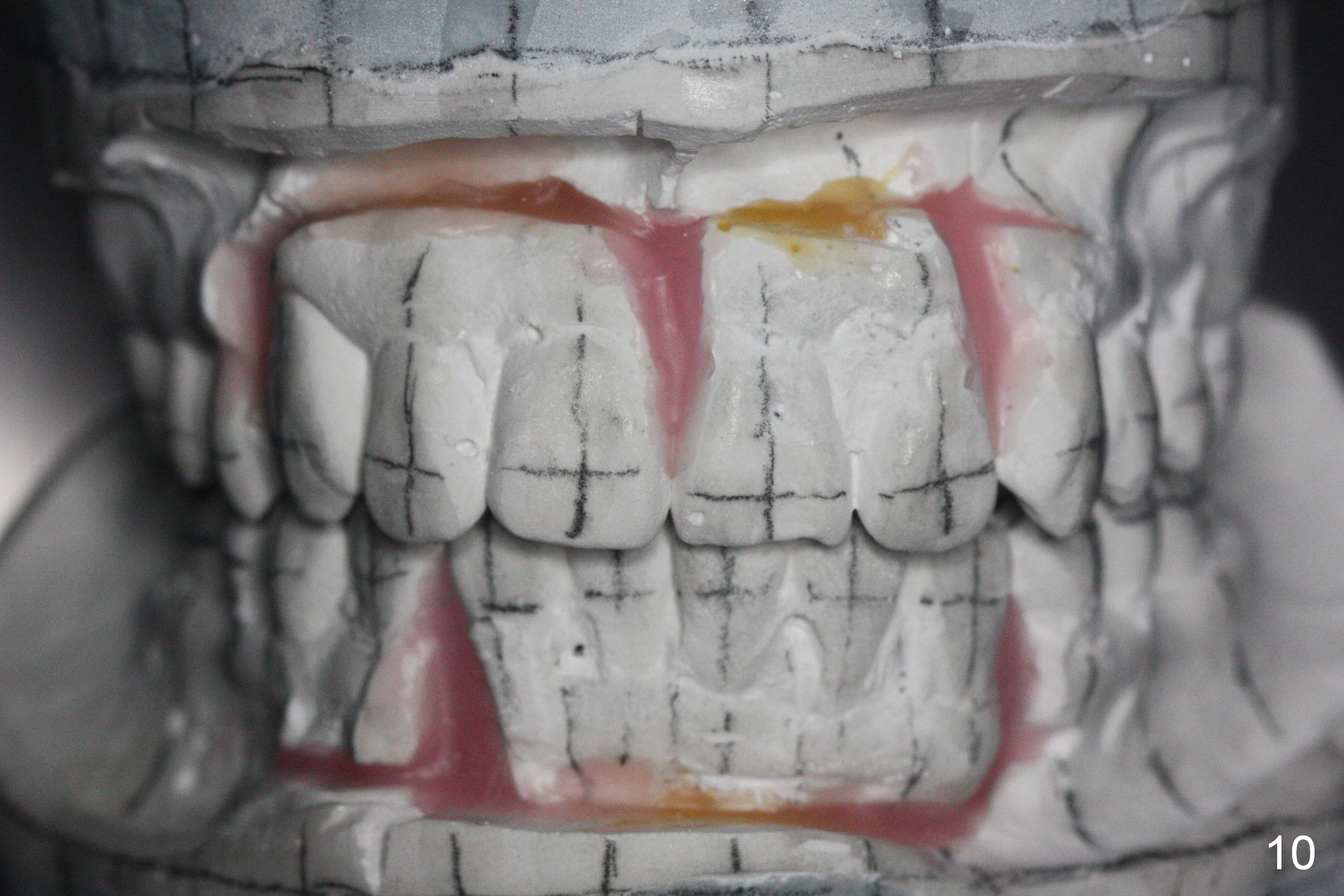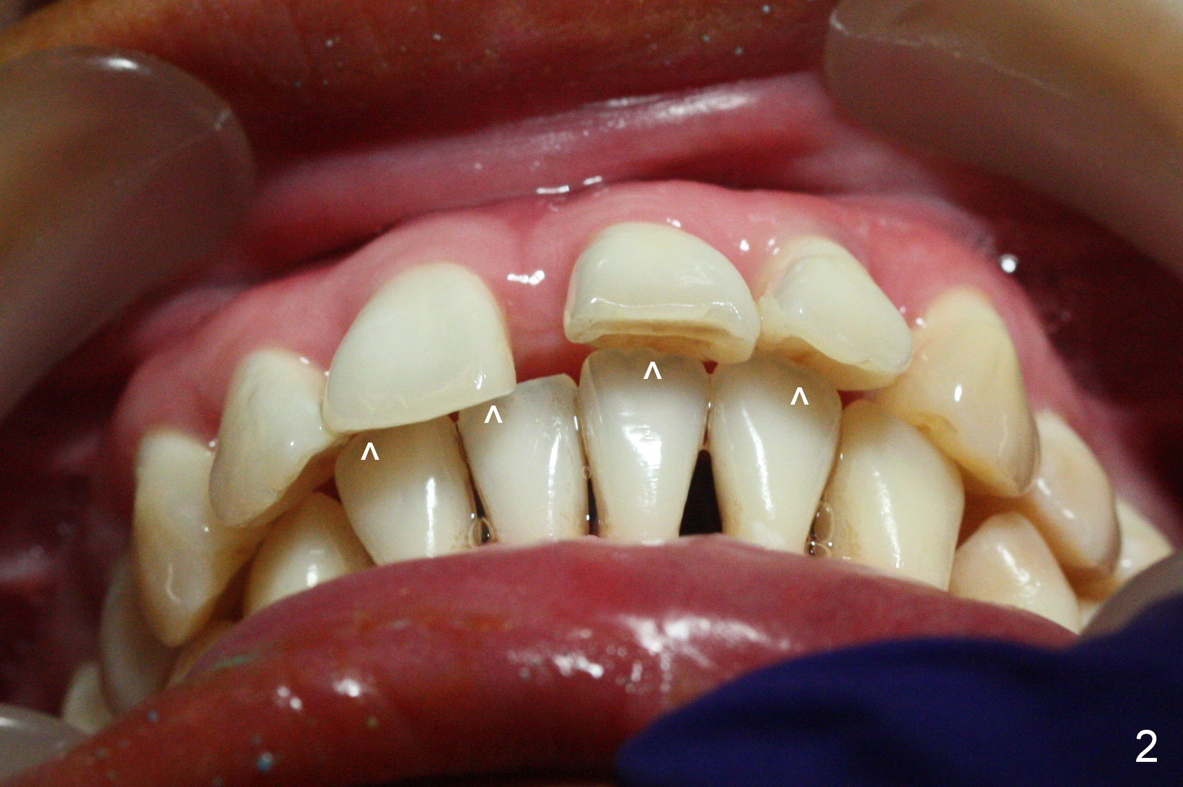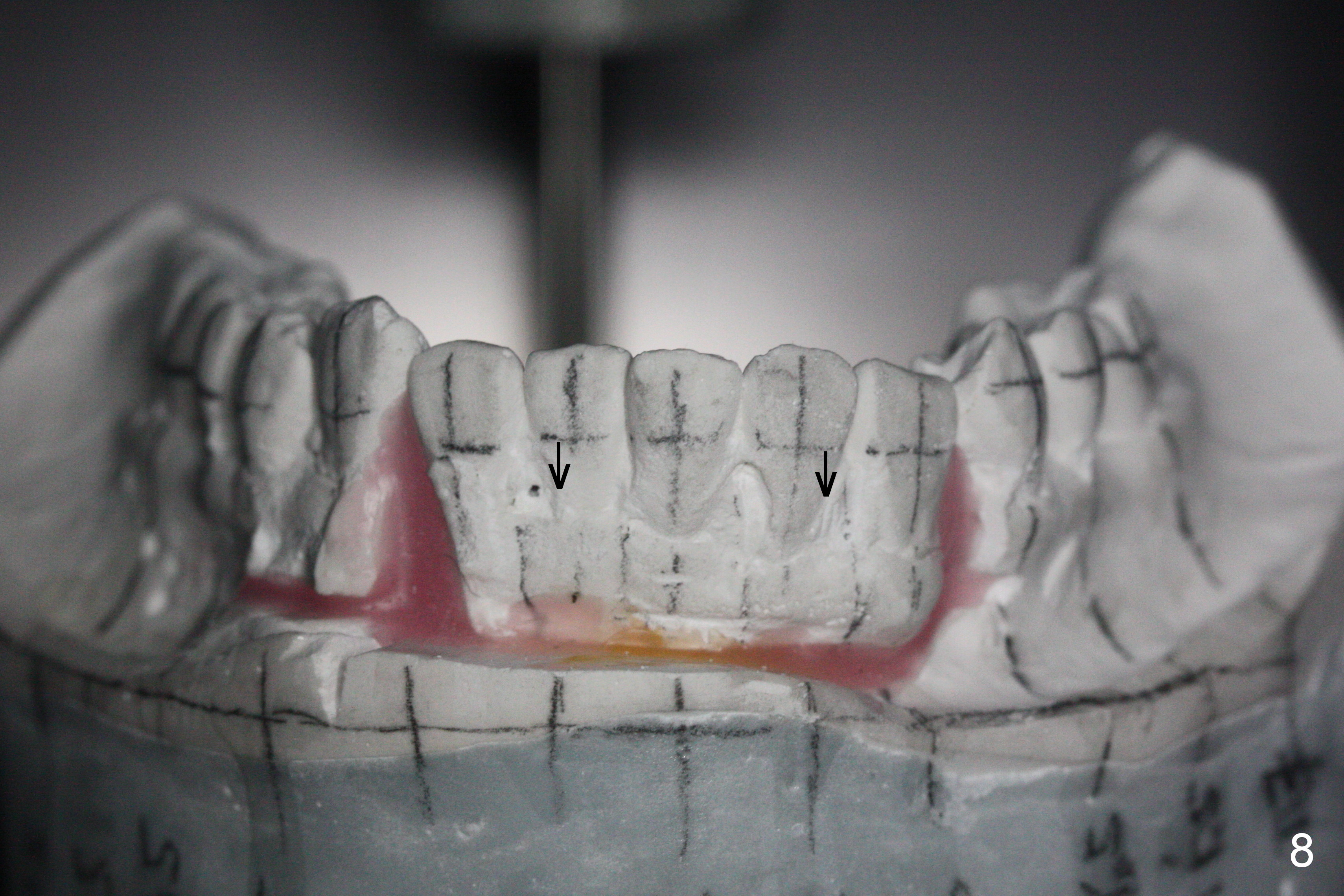 Orthodontic treatment is usually contraindicated for chronic periodontitis. Anterior tooth flaring of the 32-year-old lady (Fig.1) is also associated with excessive over bite and over jet (Fig.2) and supraeruption of the lower incisors, particularly LL2 (Fig.3 *). Differential bracketing should resolve the occlusal trauma (Fig.2 arrowheads). The oral hygiene of this patient is pristine. Even though orthodontic treatment may worsen the bone loss, normal alignment of the dentition will make implant placement easier and more cosmetic. The poor interdigitation on the left (Fig.5 *) should improve as well as that on the right (Fig.4). Model surgery will demonstrate the feasibility of the orthodontic treatment (Fig.6,7 (preop)). Intrusion of the lower anterior teeth (Fig.8 arrows) creates room (Fig.9) to lingualize the upper anteriors (Fig.10-12).