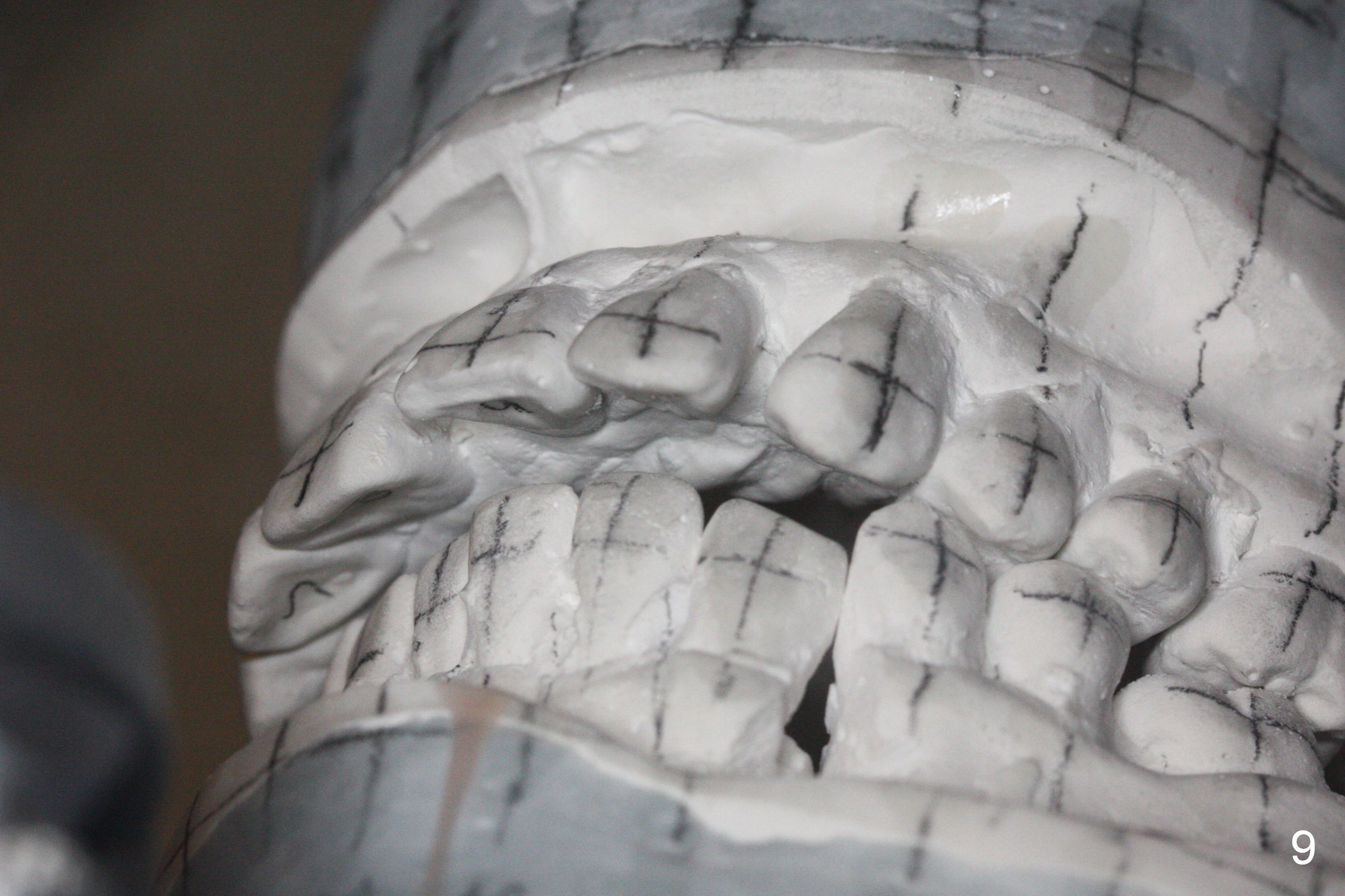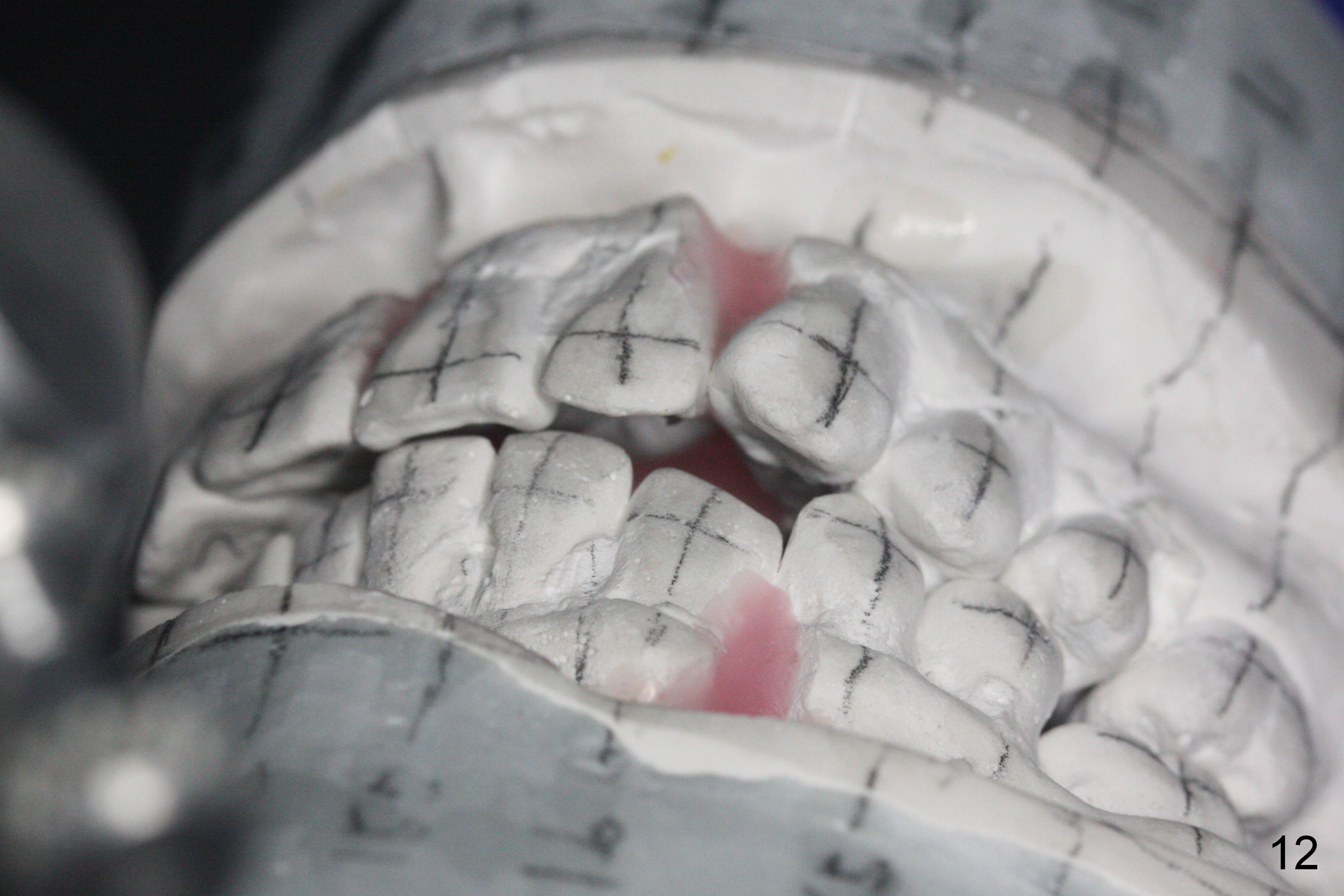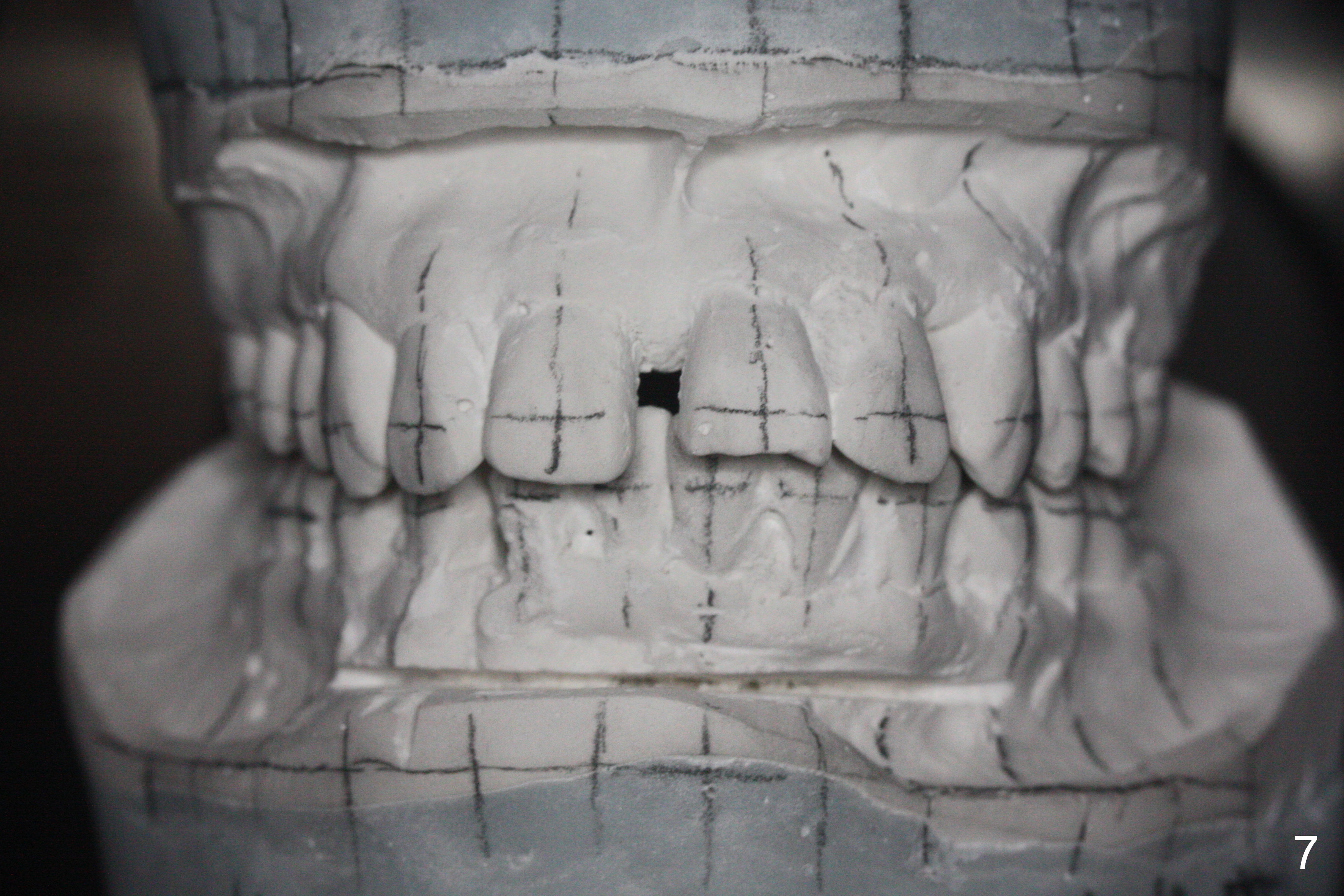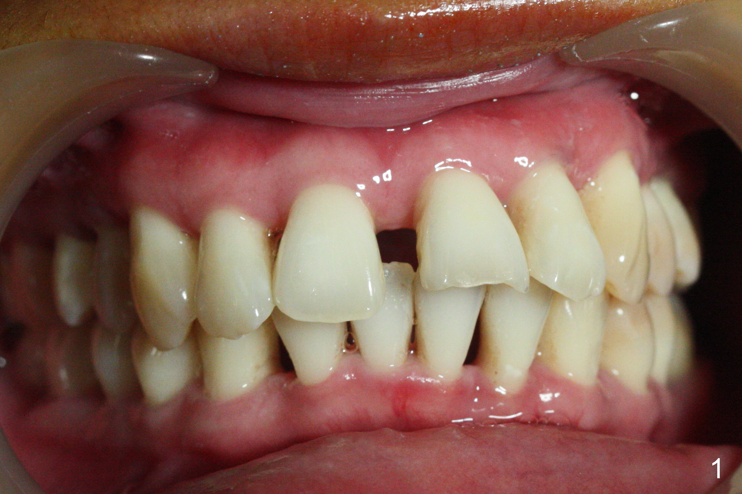 Orthodontic treatment is usually contraindicated for chronic periodontitis. Anterior tooth flaring of the 32-year-old lady (Fig.1) is also associated with excessive over bite and over jet (Fig.2) and supraeruption of the lower incisors, particularly LL2 (Fig.3 *). Differential bracketing should resolve the occlusal trauma (Fig.2 arrowheads). The oral hygiene of this patient is pristine. Even though orthodontic treatment may worsen the bone loss, normal alignment of the dentition will make implant placement easier and more cosmetic. The poor interdigitation on the left (Fig.5 *) should improve as well as that on the right (Fig.4). Model surgery will demonstrate the feasibility of the orthodontic treatment (Fig.6,7 (preop)). Intrusion of the lower anterior teeth (Fig.8 arrows) creates room (Fig.9) to lingualize the upper anteriors (Fig.10-12).