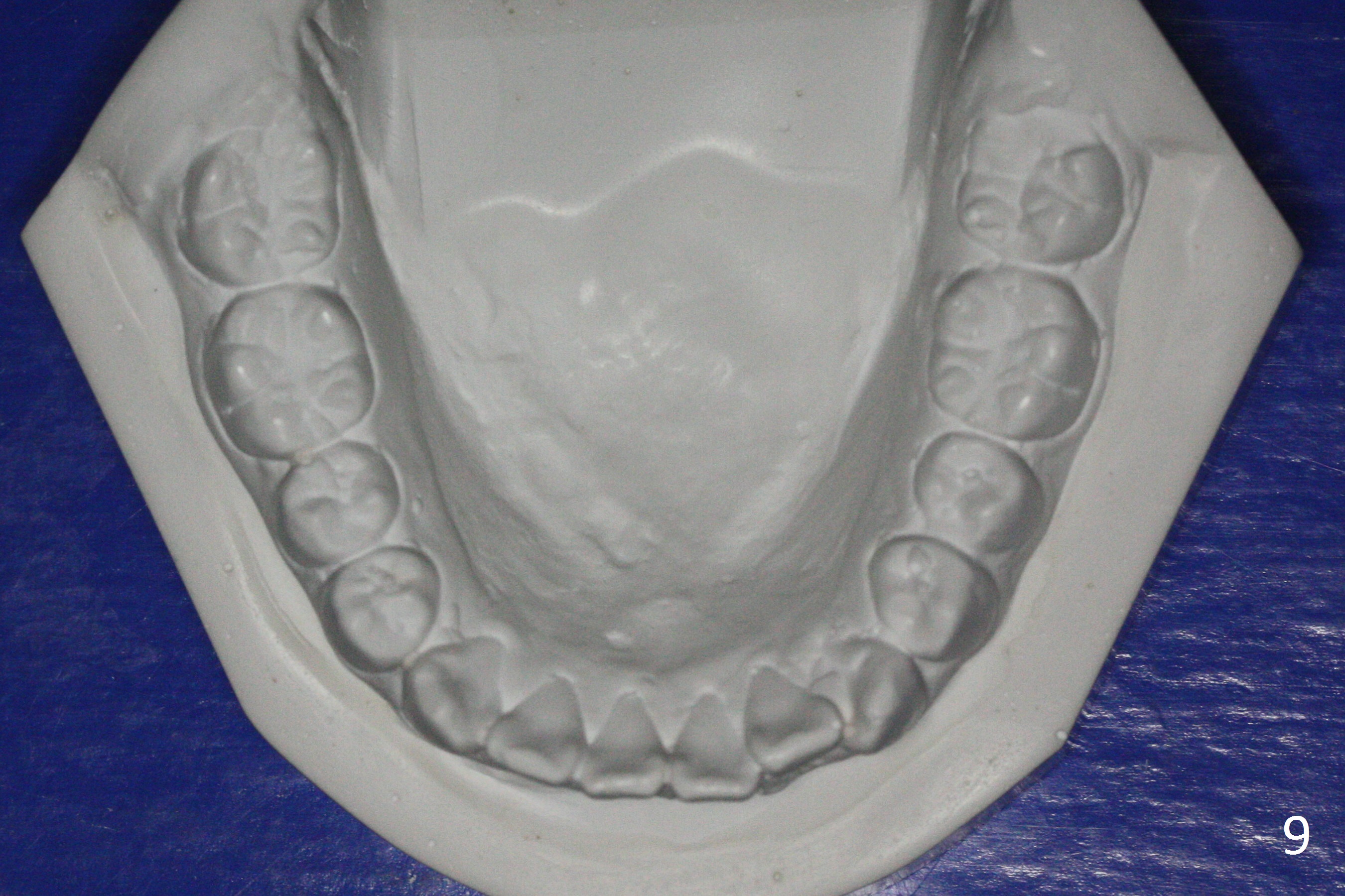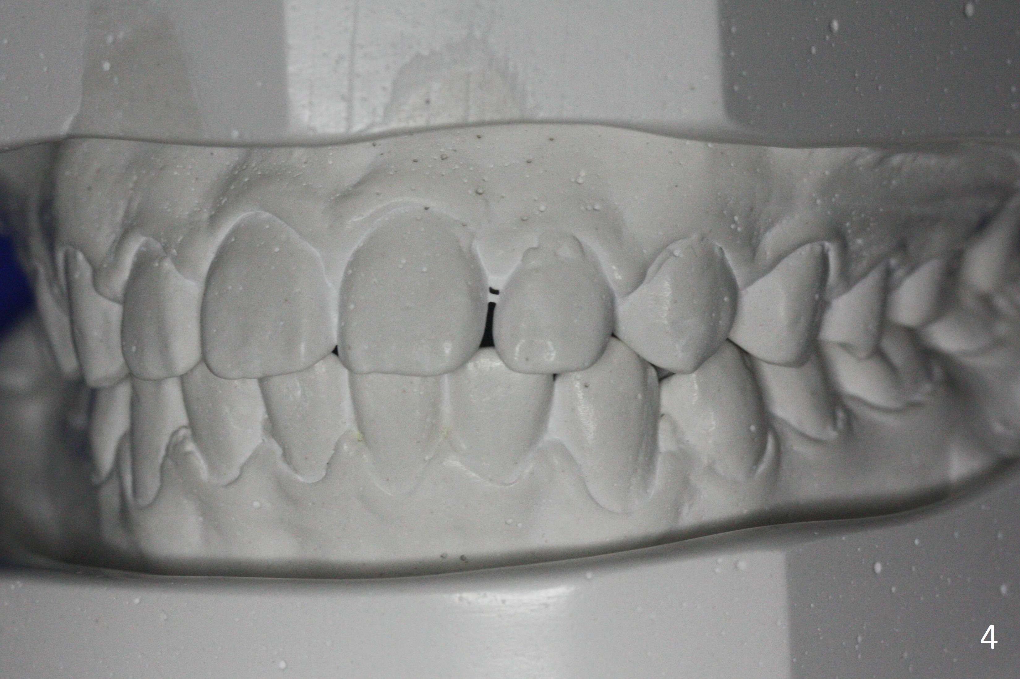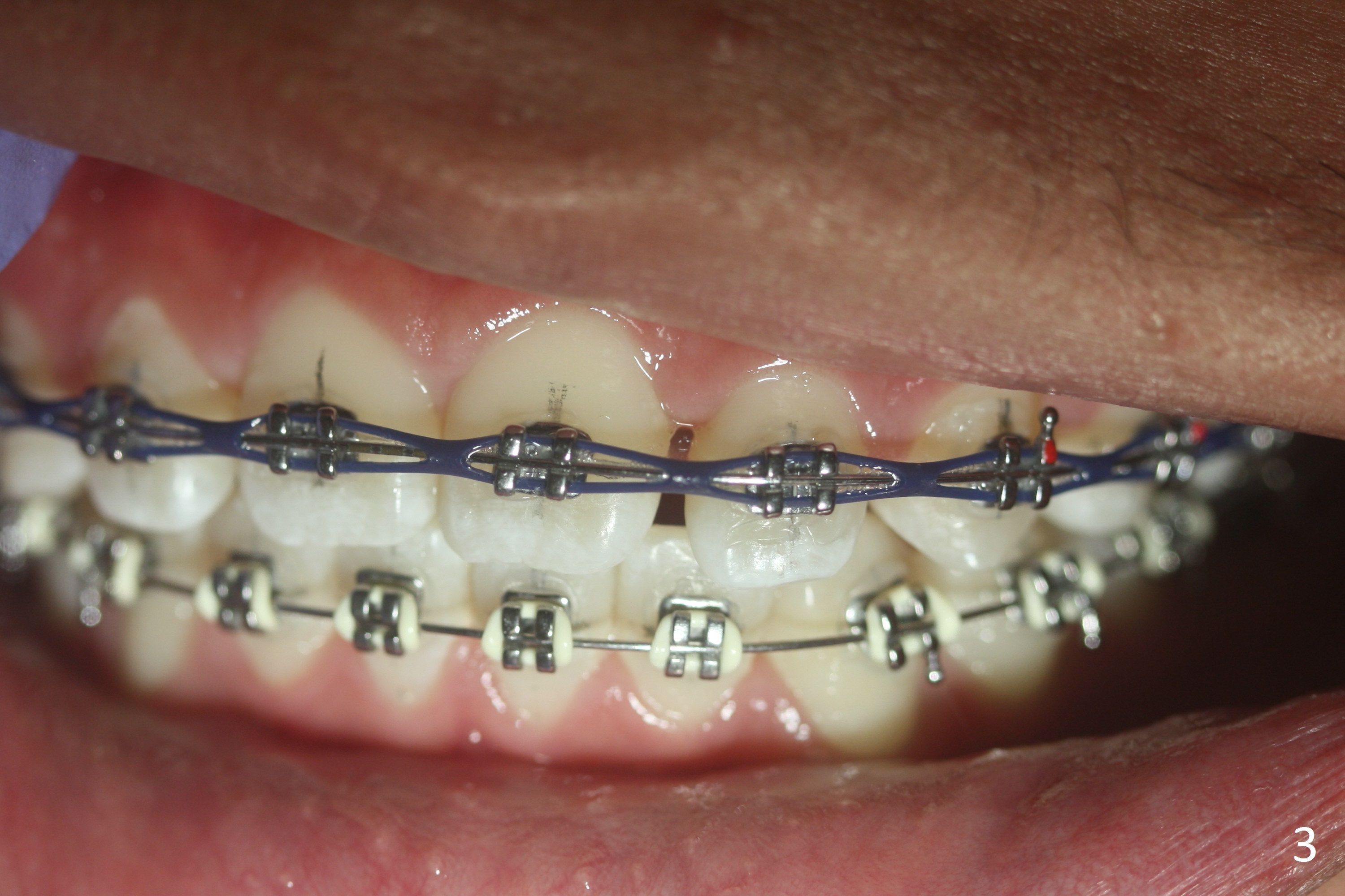 A 15-year-old man undergoes orthodontic treatment for crowding (Fig.1,9). By 3 months of treatment (18 ss wires), upper gaps appear, which are corrected by power chains for 5 months (Fig.3). When wires change to segmental ones (19x25), use of power chain discontinues. The upper diastemata relapse in the last 3 months of treatment (Fig.2,4). In fact there are posterior gaps preop (Fig.7). The use of power chains should be continuous until brackets are removed. The hidden gaps can be shown by blowing air from a 3-way syringe. Another way of revealing the diastemata is to take impression prior to debanding. Hawley appliance can be used to treat post-debanding diastemata.