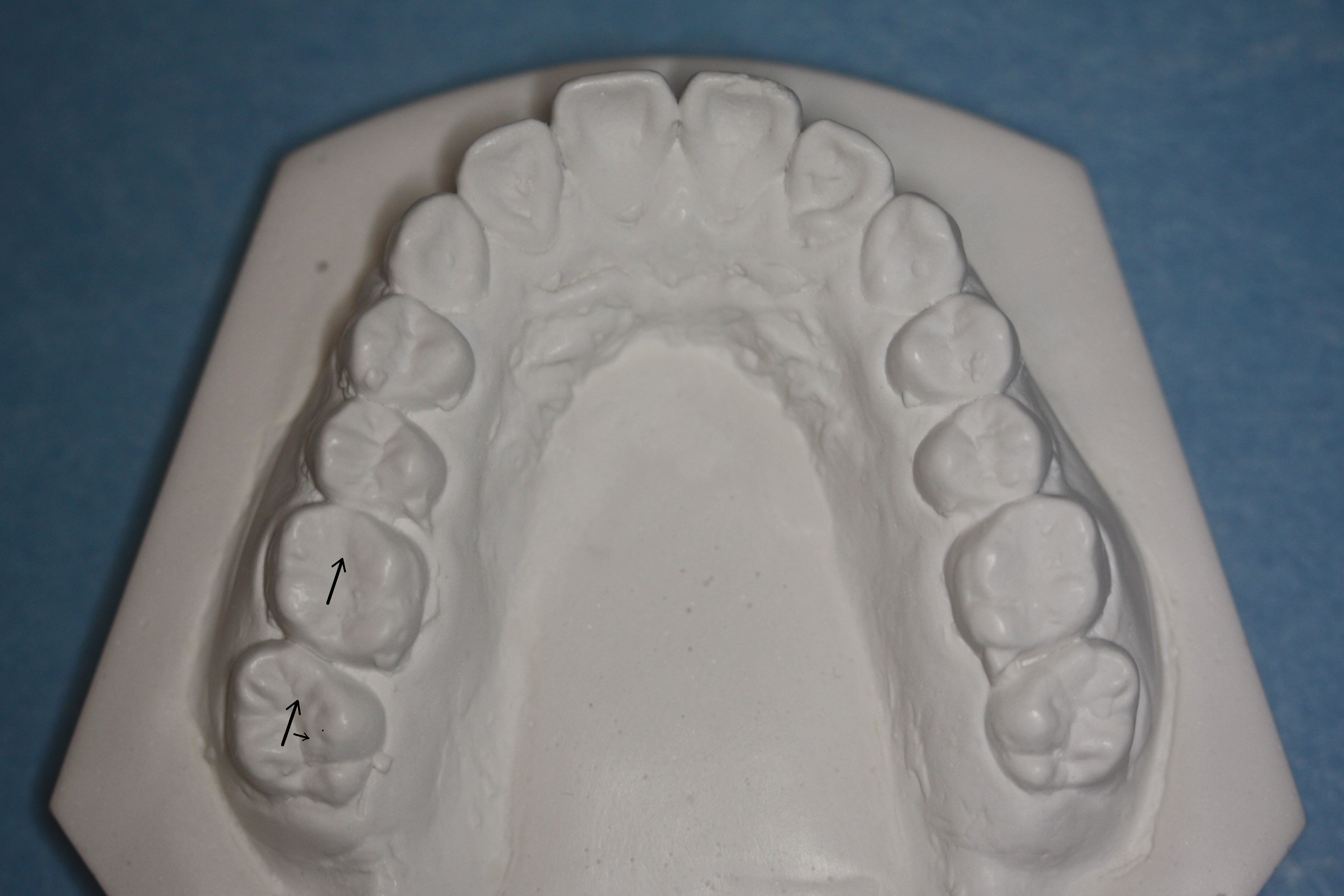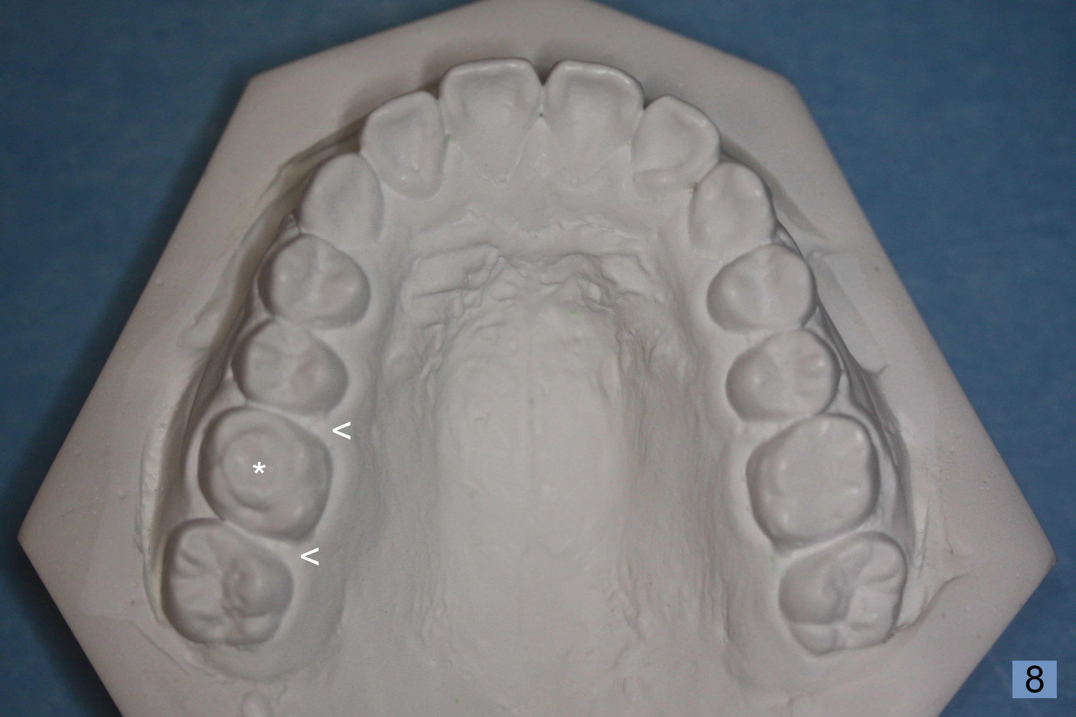 Also remove occlusal composite before final impression (Fig.8 *). It is amazing that the molars can self adjust its position 3.5 months post debanding (Fig.10 arrows) to close the space after removal of orthodontic bands (Fig.8 <).