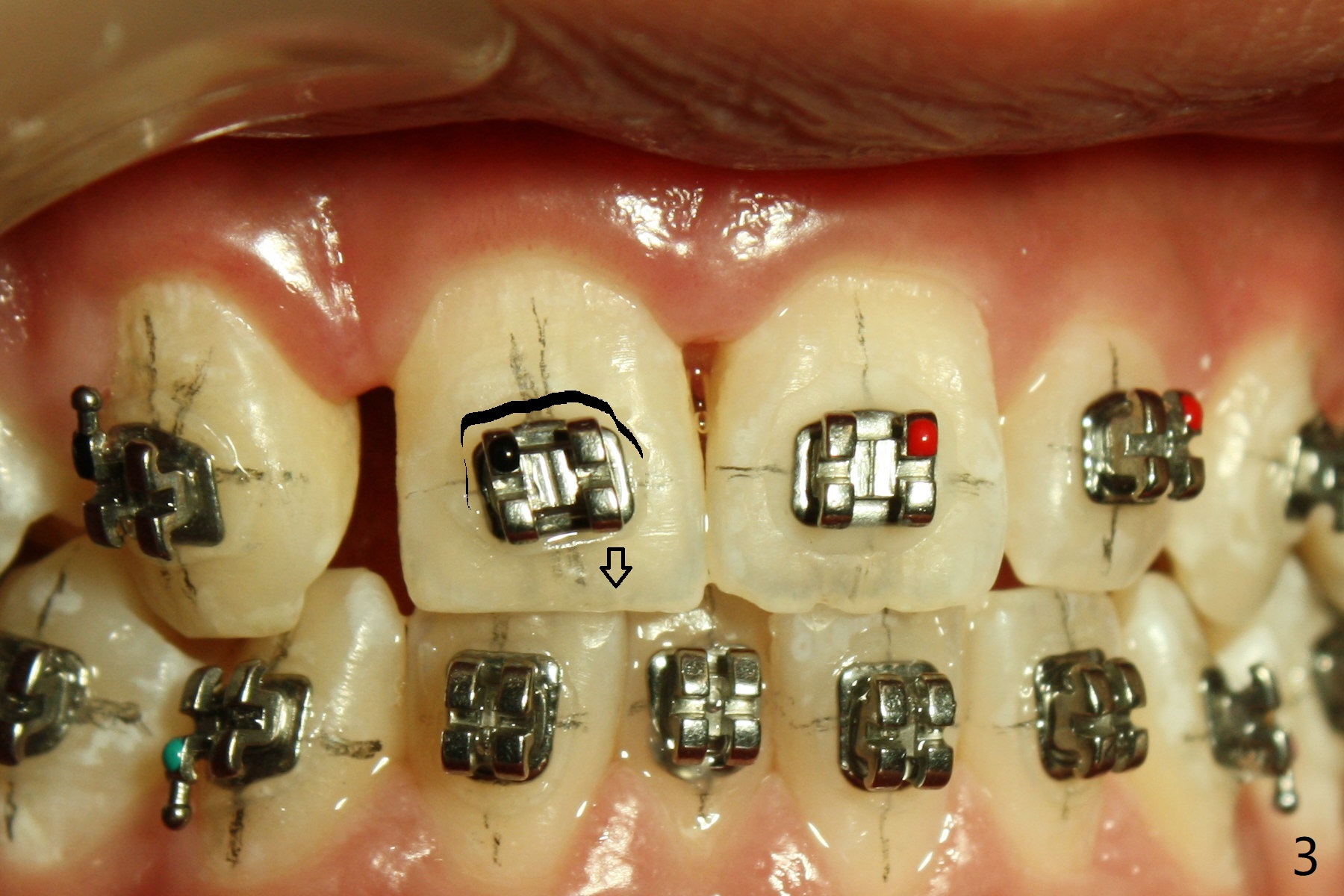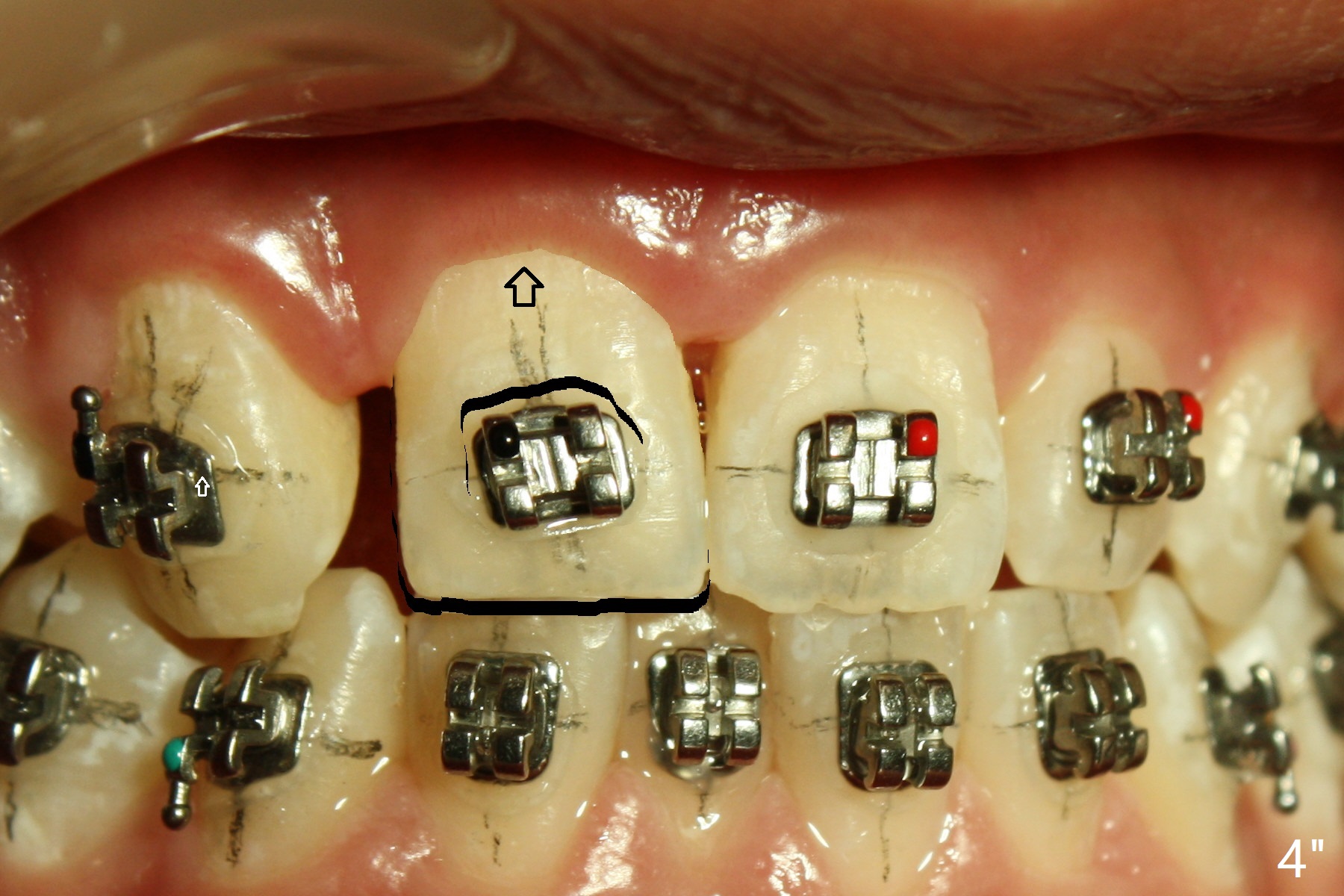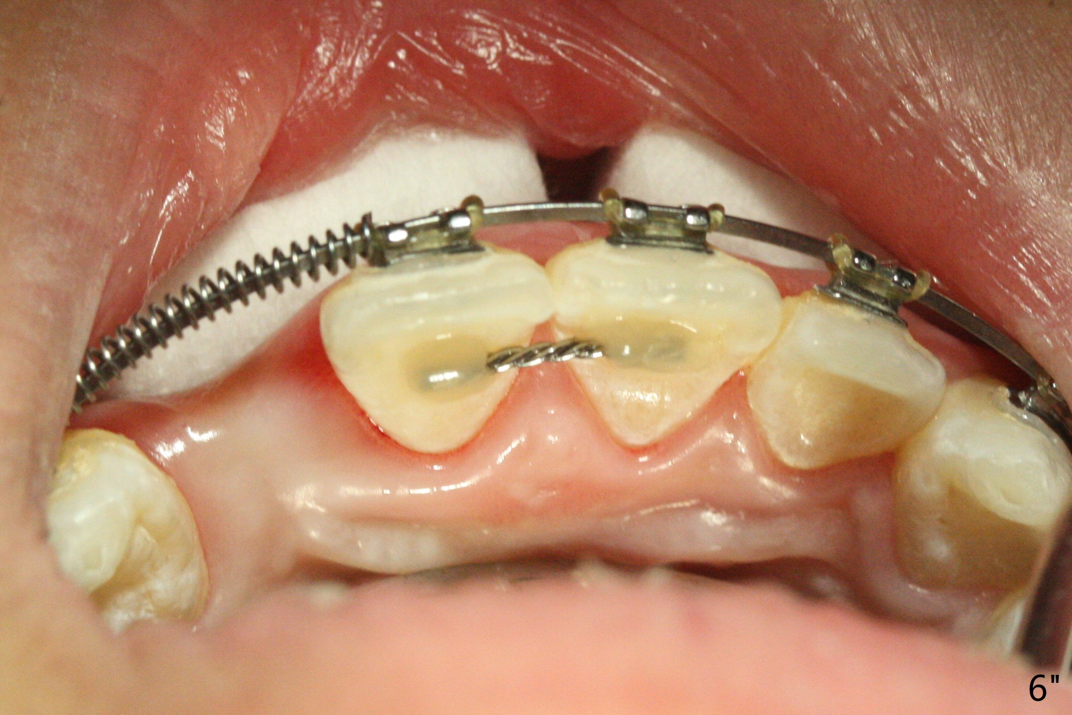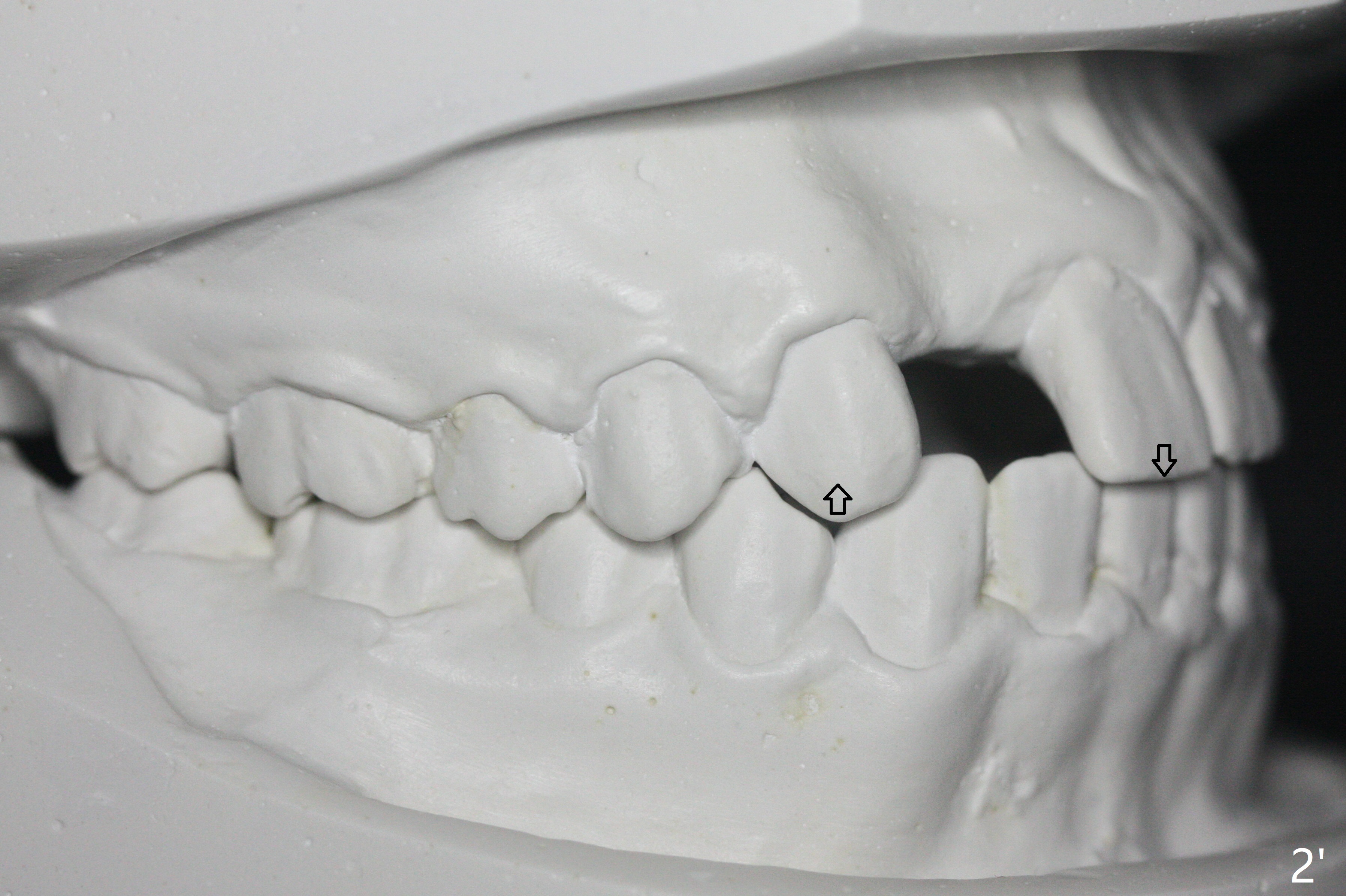 A 15-year-old man finishes orthodontic treatment for congenital missing lateral in 13 months. Molar Class I relationship remains the same (Fig.1,2,4,5). The upper diastemata mesial to 4s (Fig.4,7") close with correction of the upper midline deviation (Fig.2'-4'). The kid is unpleased with the elongated UR1 (Fig.2',3'). In fact it is a preexisting condition (Fig.2 arrow, 2"), but bracket placement at UR1 should have been overcorrected (incisal placement, Fig.3"). The intrusion should be done (Fig.4") before closure of the diastemata, since anchorage may be weakened when the separation between UR1 and 3 increases by using open coil spring. To prevent immediate relapse of the diastema between the upper central incisors, a fixed retainer is placed lingual before debracketing (Fig.6,6',6").