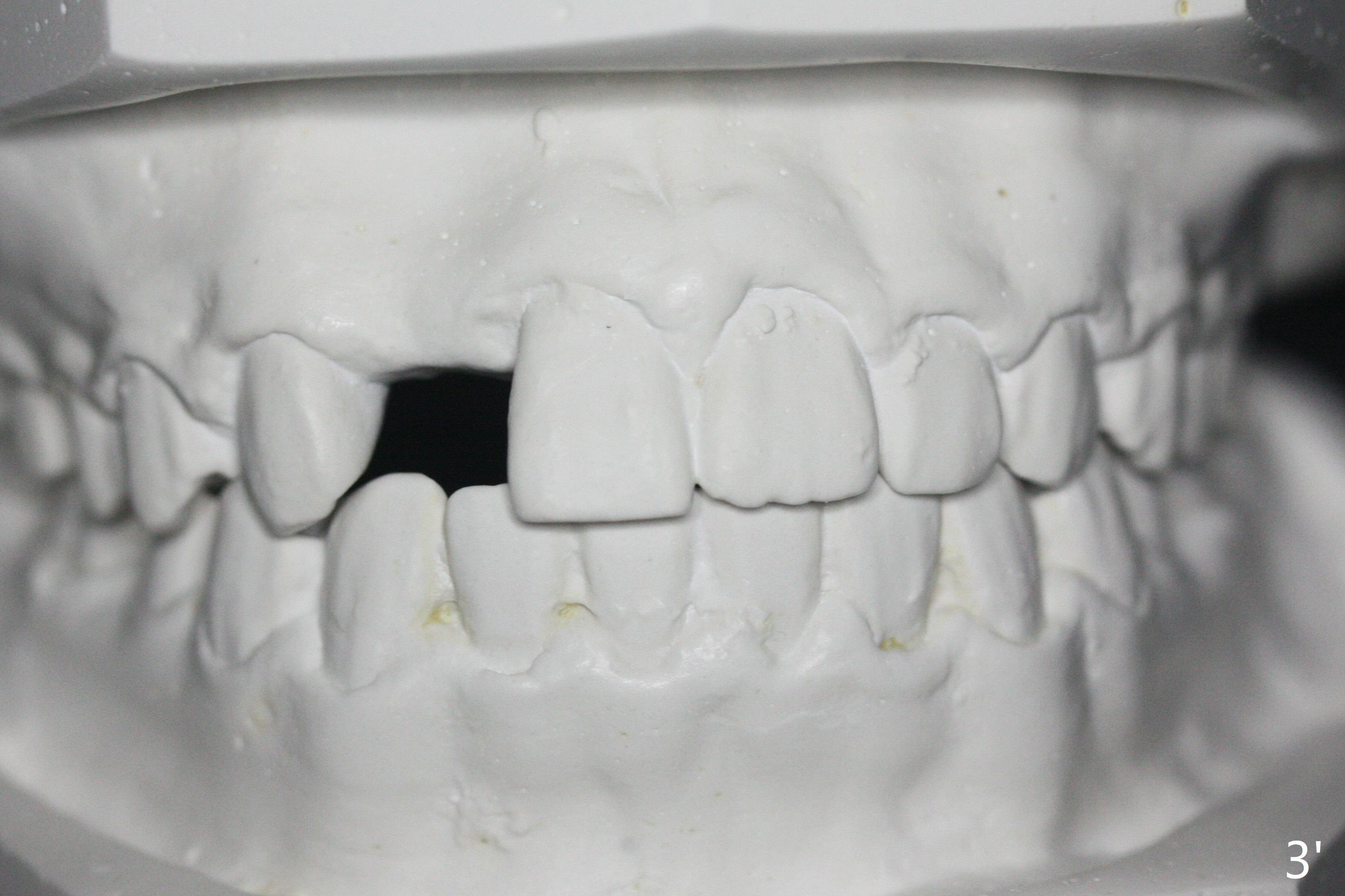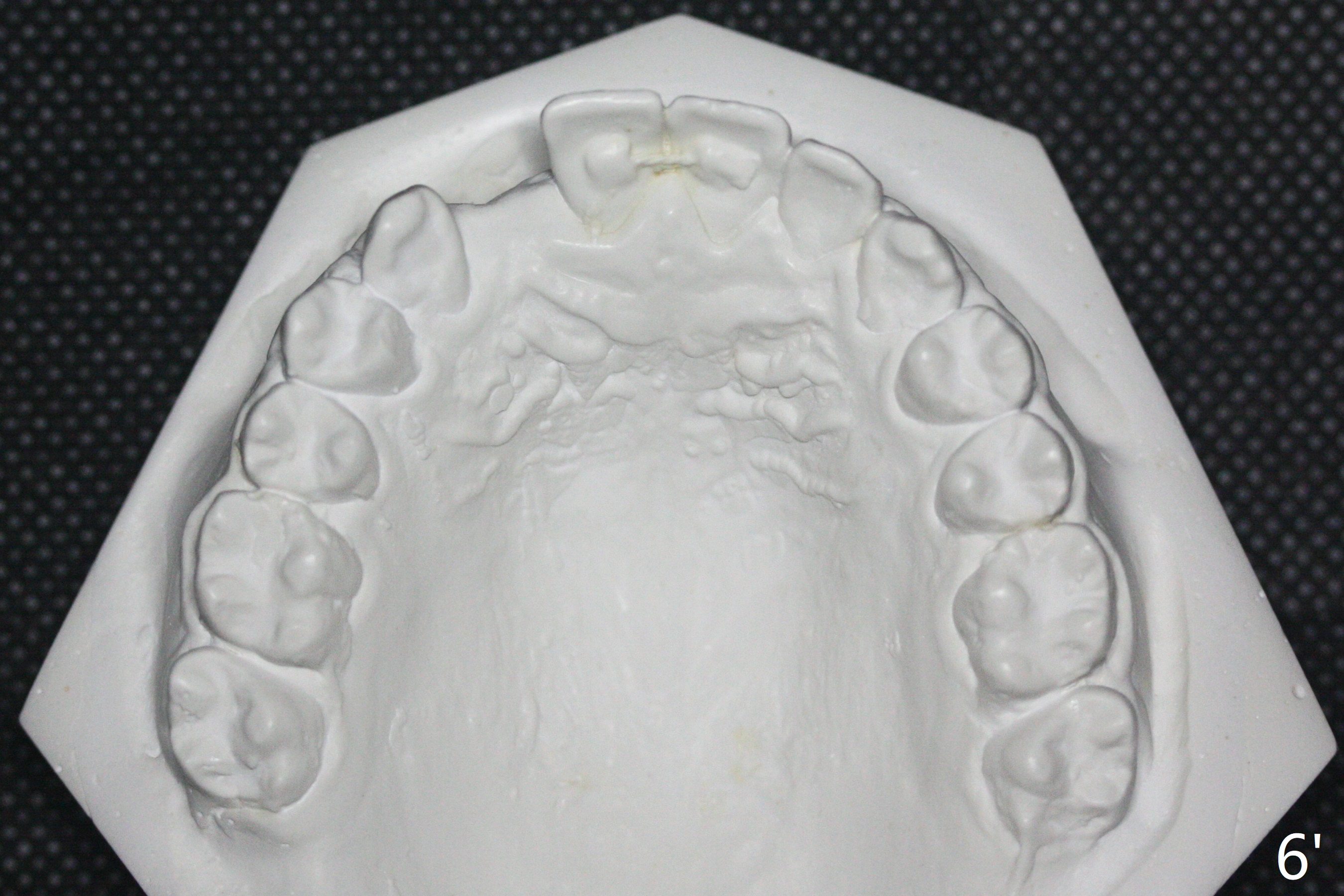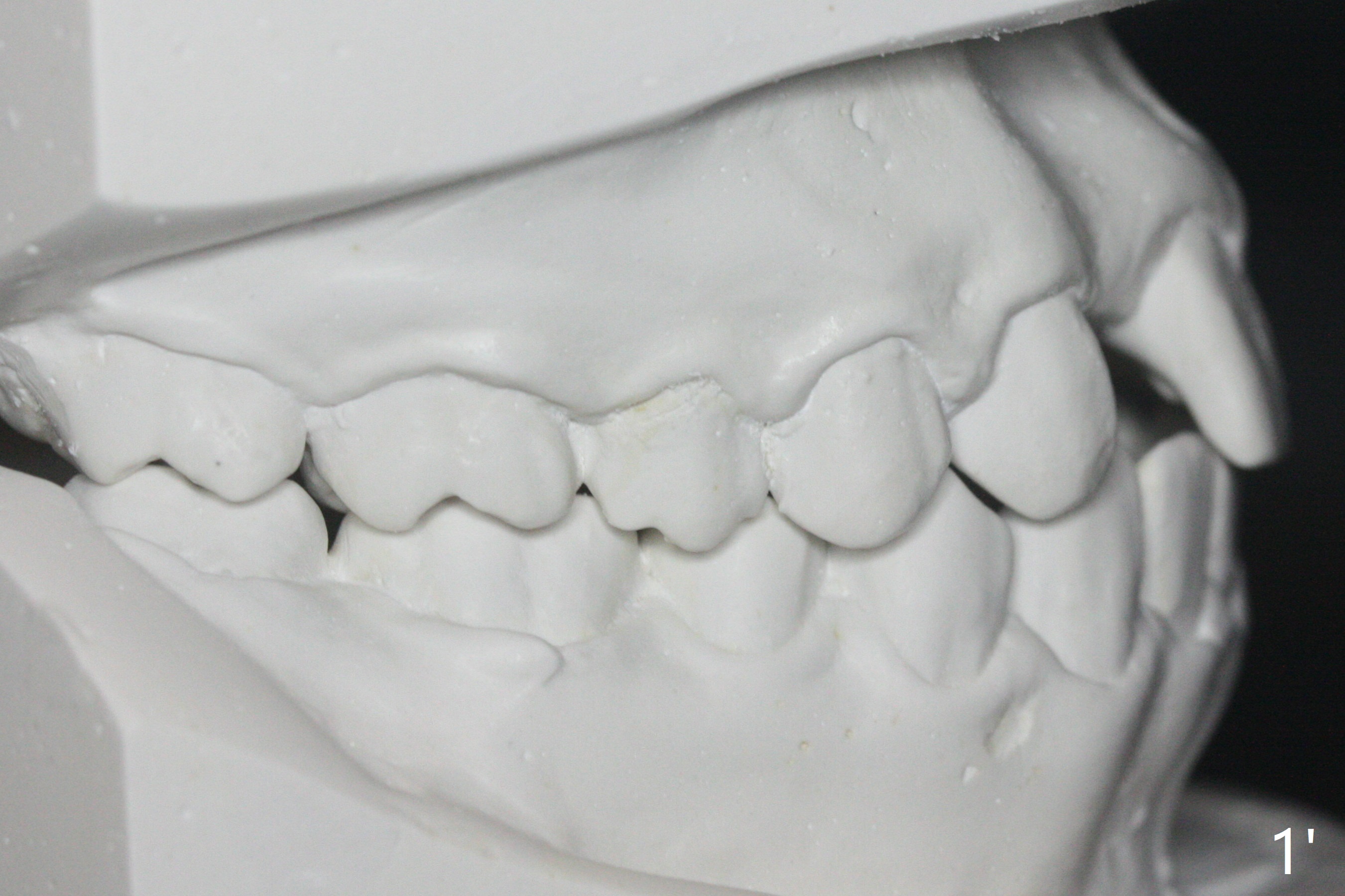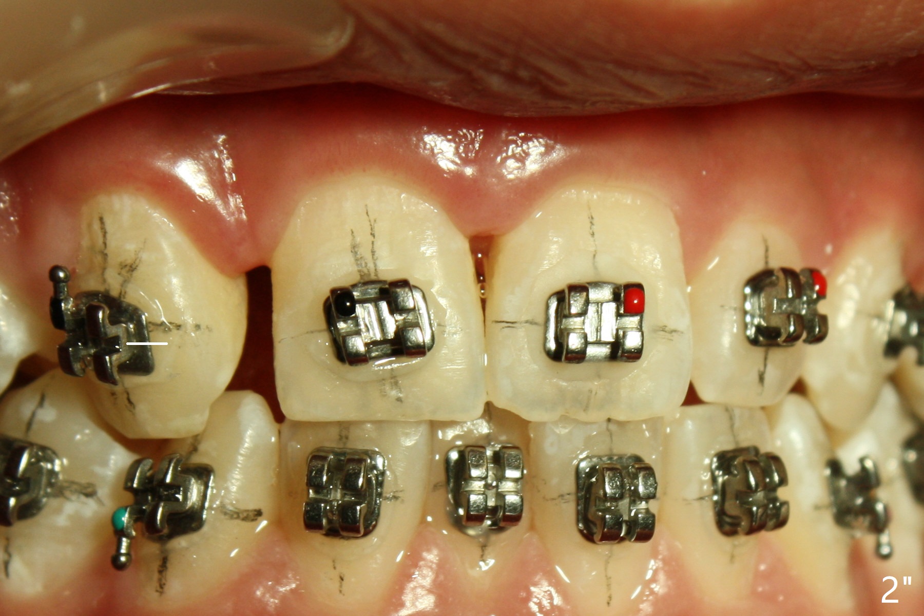 A 15-year-old man finishes orthodontic treatment for congenital missing lateral in 13 months. Molar Class I relationship remains the same (Fig.1,2,4,5). The upper diastemata mesial to 4s (Fig.4,7") close with correction of the upper midline deviation (Fig.2'-4'). The kid is unpleased with the elongated UR1 (Fig.2',3'). In fact it is a preexisting condition (Fig.2 arrow, 2"), but bracket placement at UR1 should have been overcorrected (incisal placement, Fig.3"). The intrusion should be done (Fig.4") before closure of the diastemata, since anchorage may be weakened when the separation between UR1 and 3 increases by using open coil spring. To prevent immediate relapse of the diastema between the upper central incisors, a fixed retainer is placed lingual before debracketing (Fig.6,6',6").