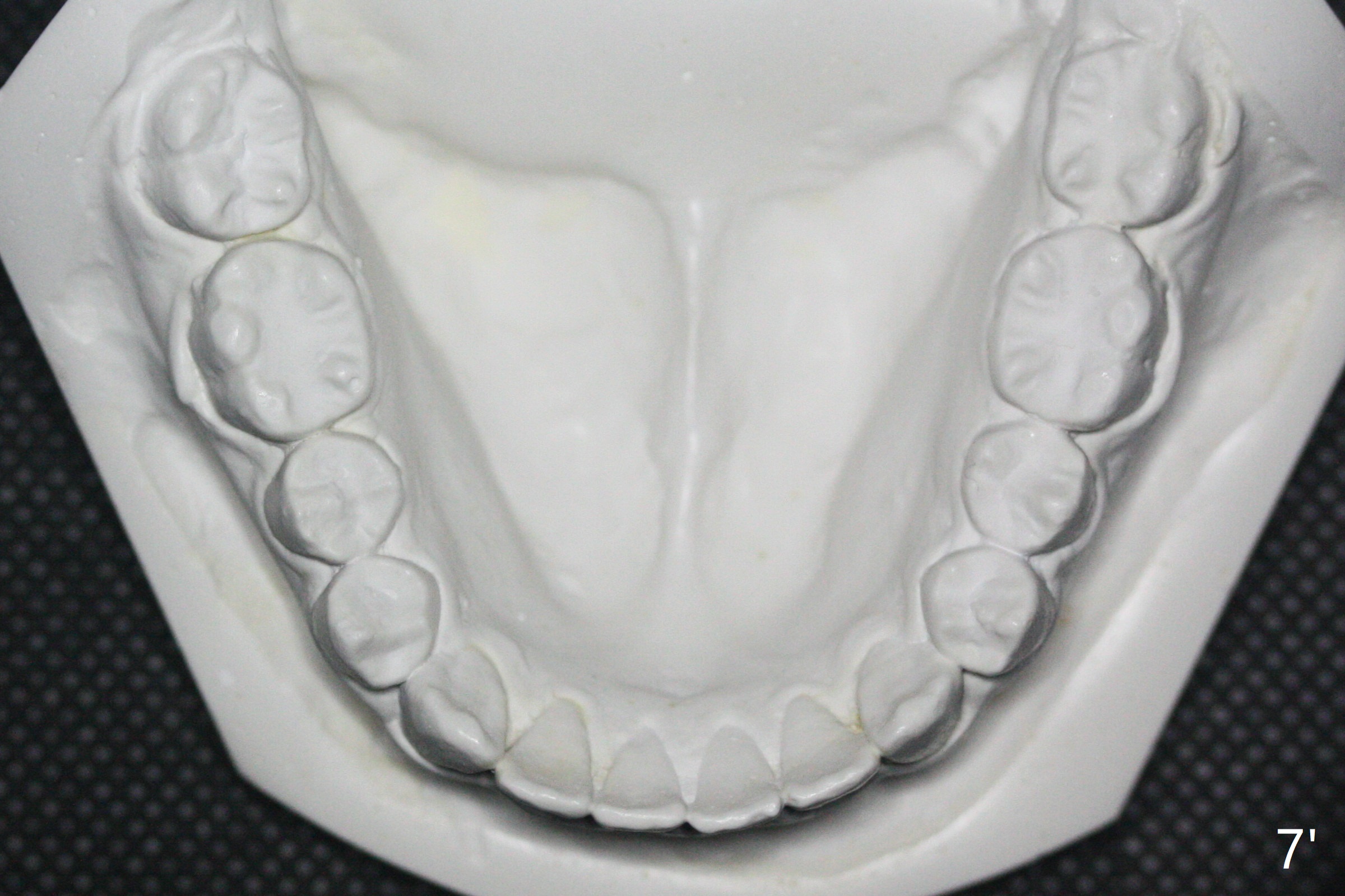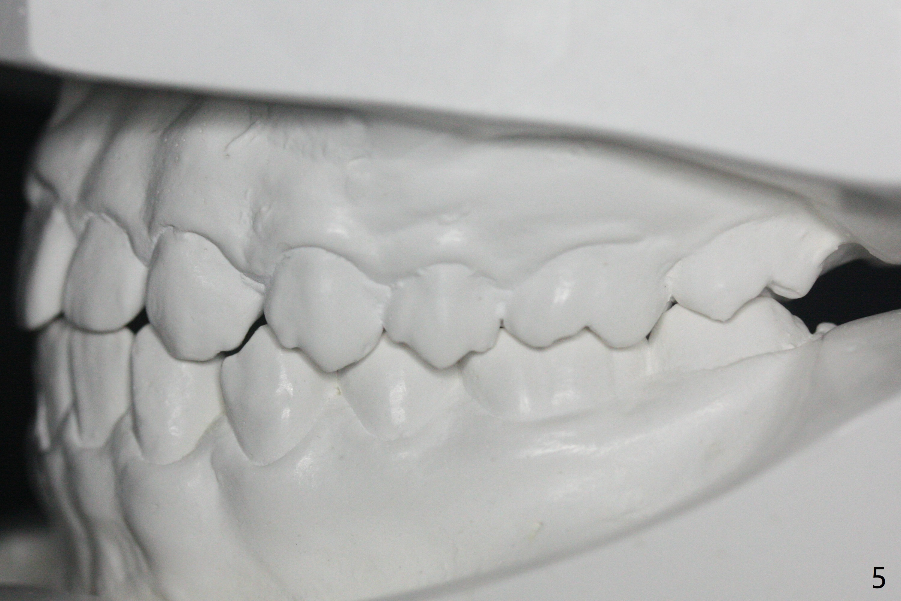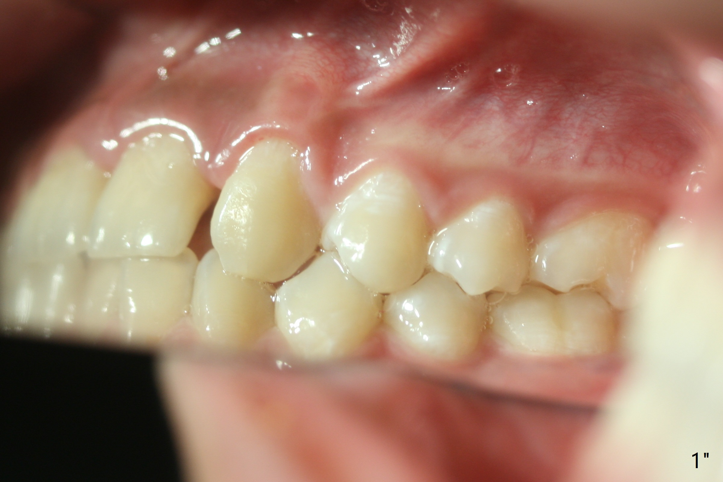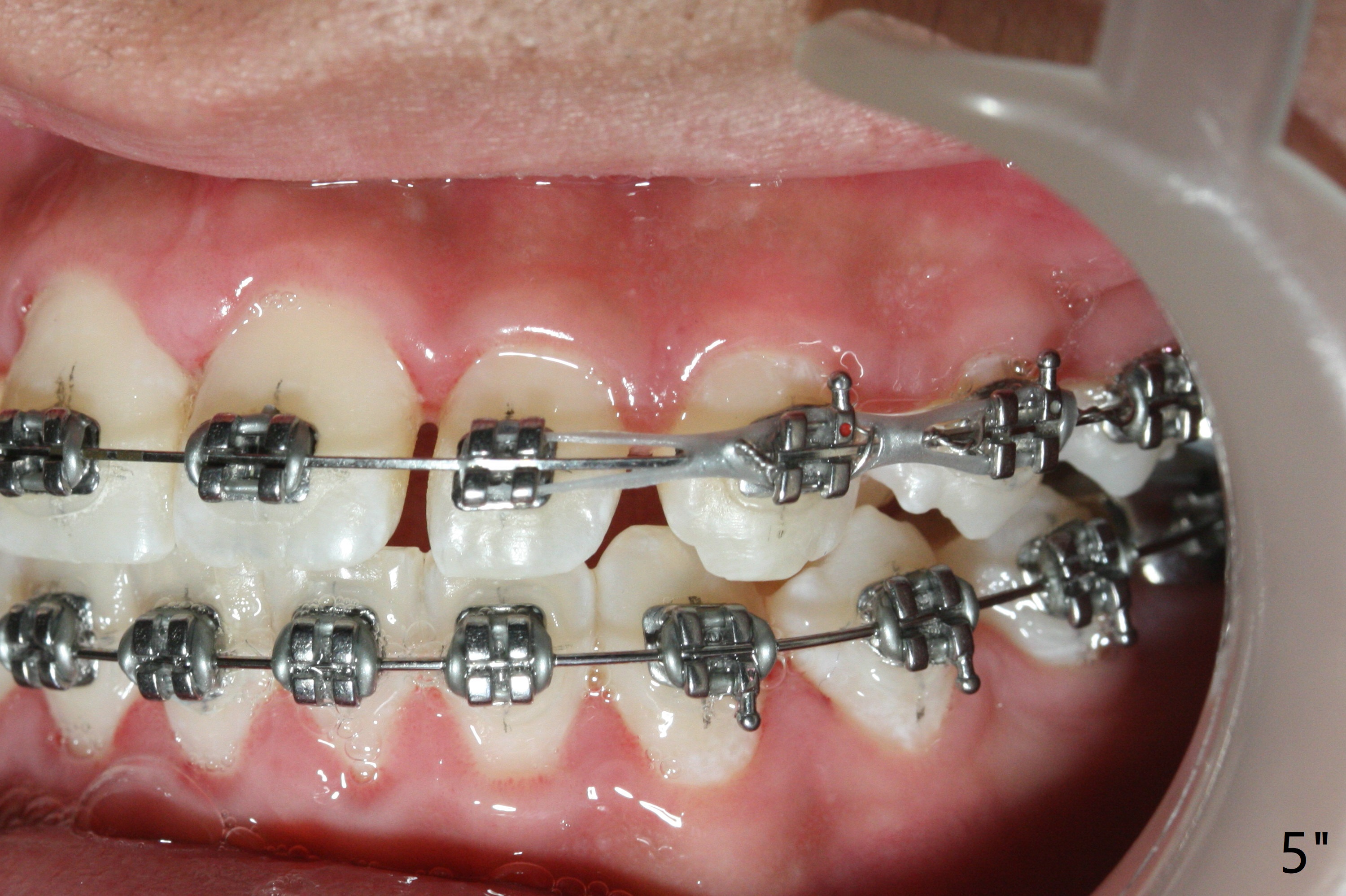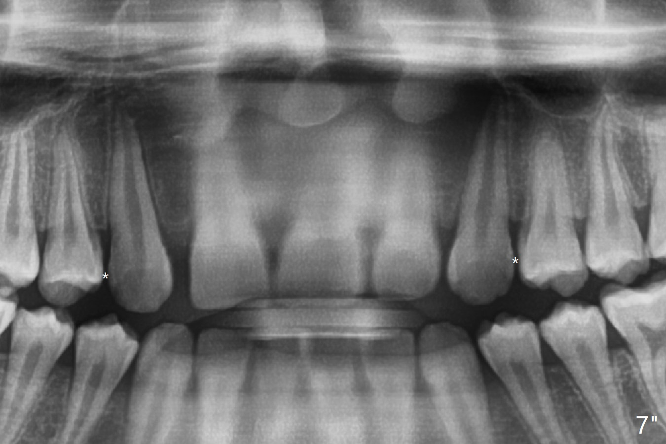 A 15-year-old man finishes orthodontic treatment for congenital missing lateral in 13 months. Molar Class I relationship remains the same (Fig.1,2,4,5). The upper diastemata mesial to 4s (Fig.4,7") close with correction of the upper midline deviation (Fig.2'-4'). The kid is unpleased with the elongated UR1 (Fig.2',3'). In fact it is a preexisting condition (Fig.2 arrow, 2"), but bracket placement at UR1 should have been overcorrected (incisal placement, Fig.3"). The intrusion should be done (Fig.4") before closure of the diastemata, since anchorage may be weakened when the separation between UR1 and 3 increases by using open coil spring. To prevent immediate relapse of the diastema between the upper central incisors, a fixed retainer is placed lingual before debracketing (Fig.6,6',6").