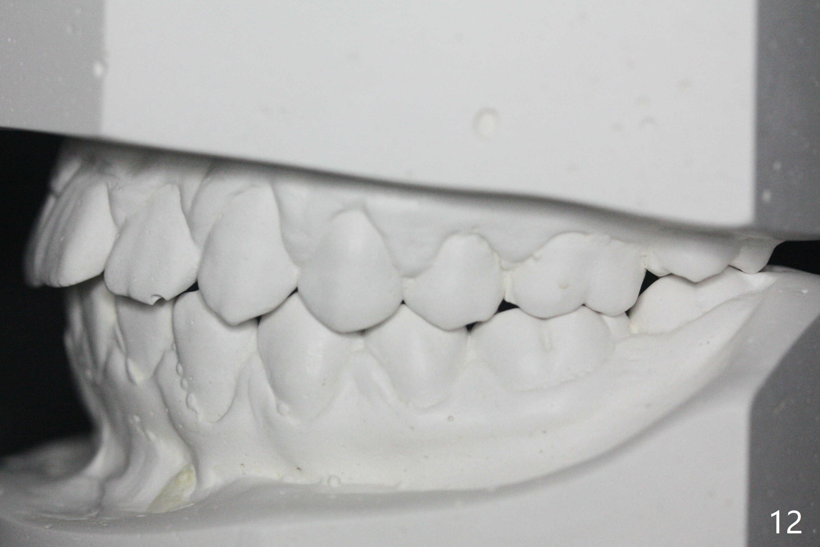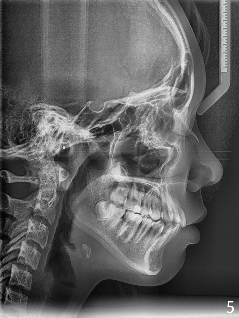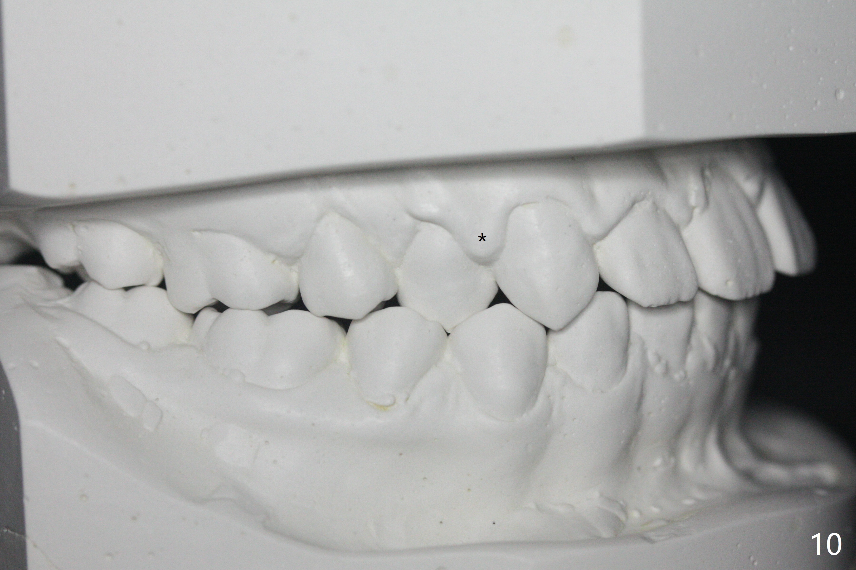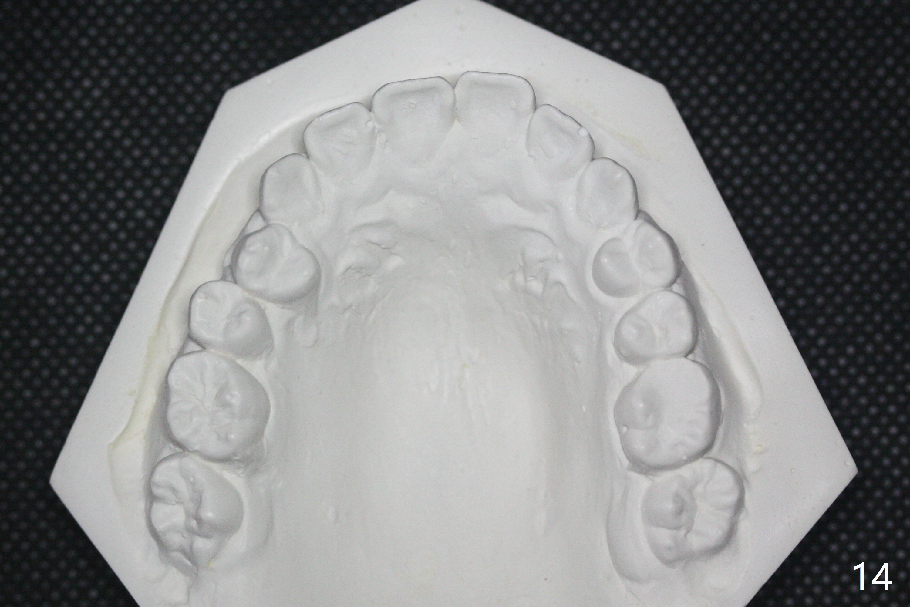 A 14-year-old woman, used to be a dental phobic (Fig.13), agrees with orthodontic treatment. Her mother is concerned about UL1 protrusion (Fig.8,11) and decalcification (Fig.8 *) and UR4 cross bite (Fig.7,10,14). There is mild lip constraint (Fig.1,3), as related to light dental protrusion (Fig.2,4), although the upper dental midline is not deviated (Fig.2). History shows that UR3 erupts before UR D is extracted, which is associated with UR4 cross bite. After arch expansion, consider proximal reduction to reduce anterior overjet if present. In fact that latter is not done; instead Class II is conducted.