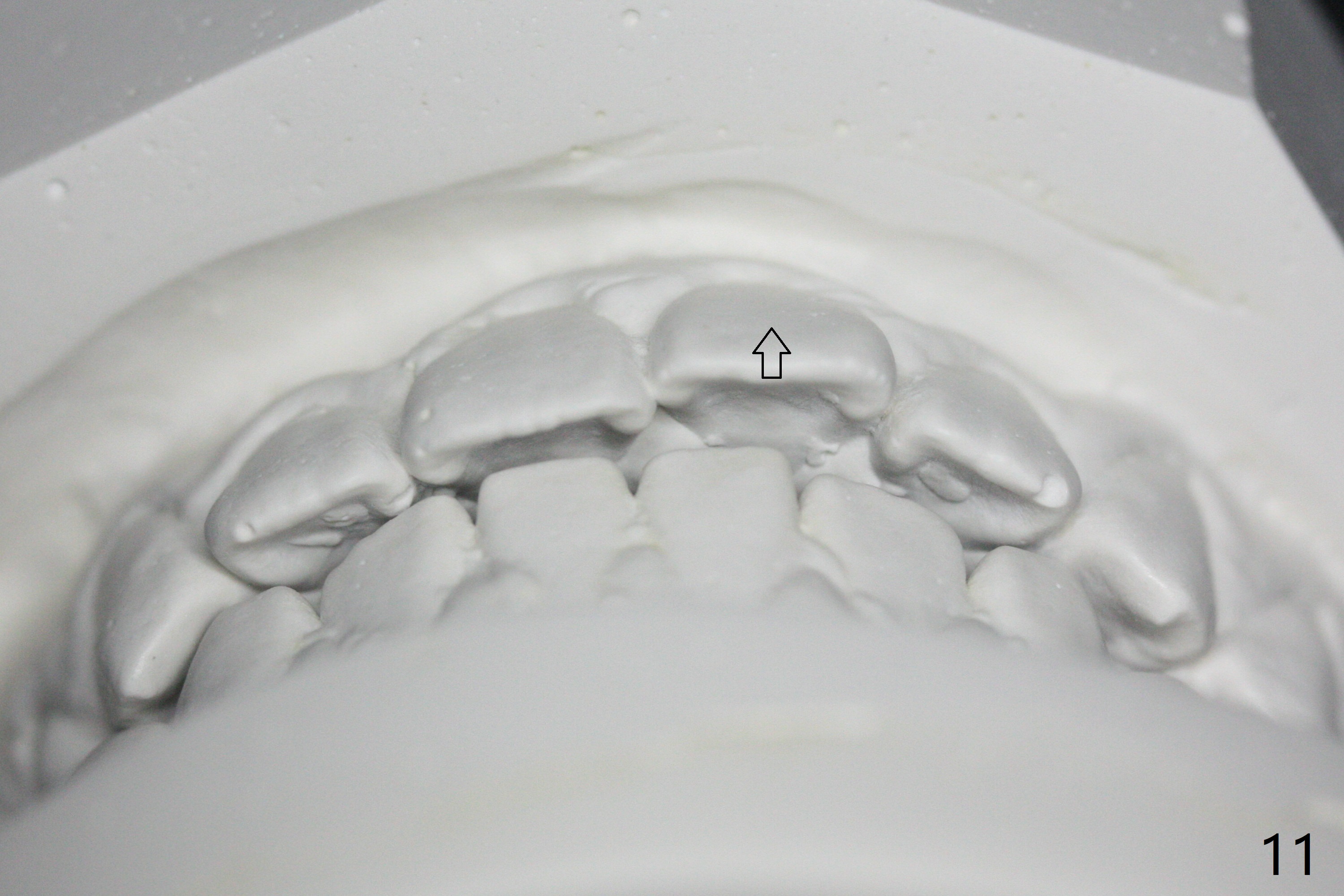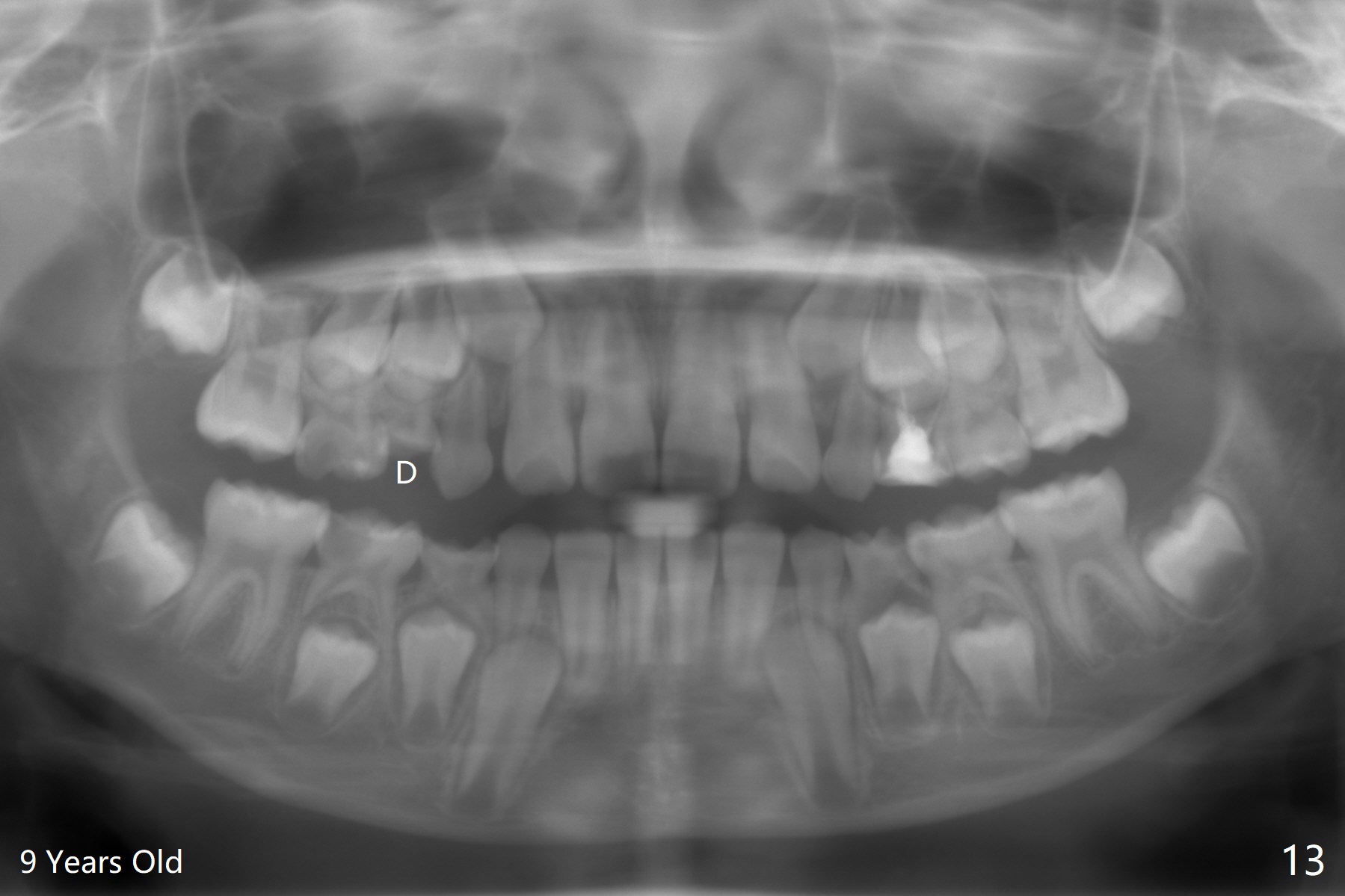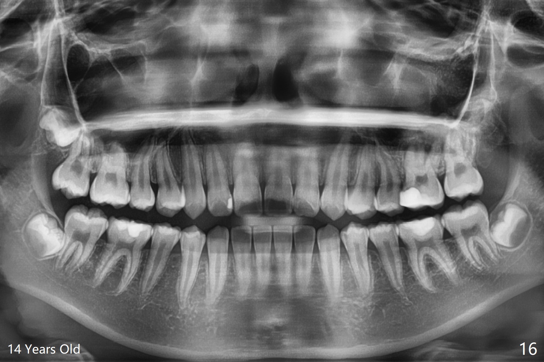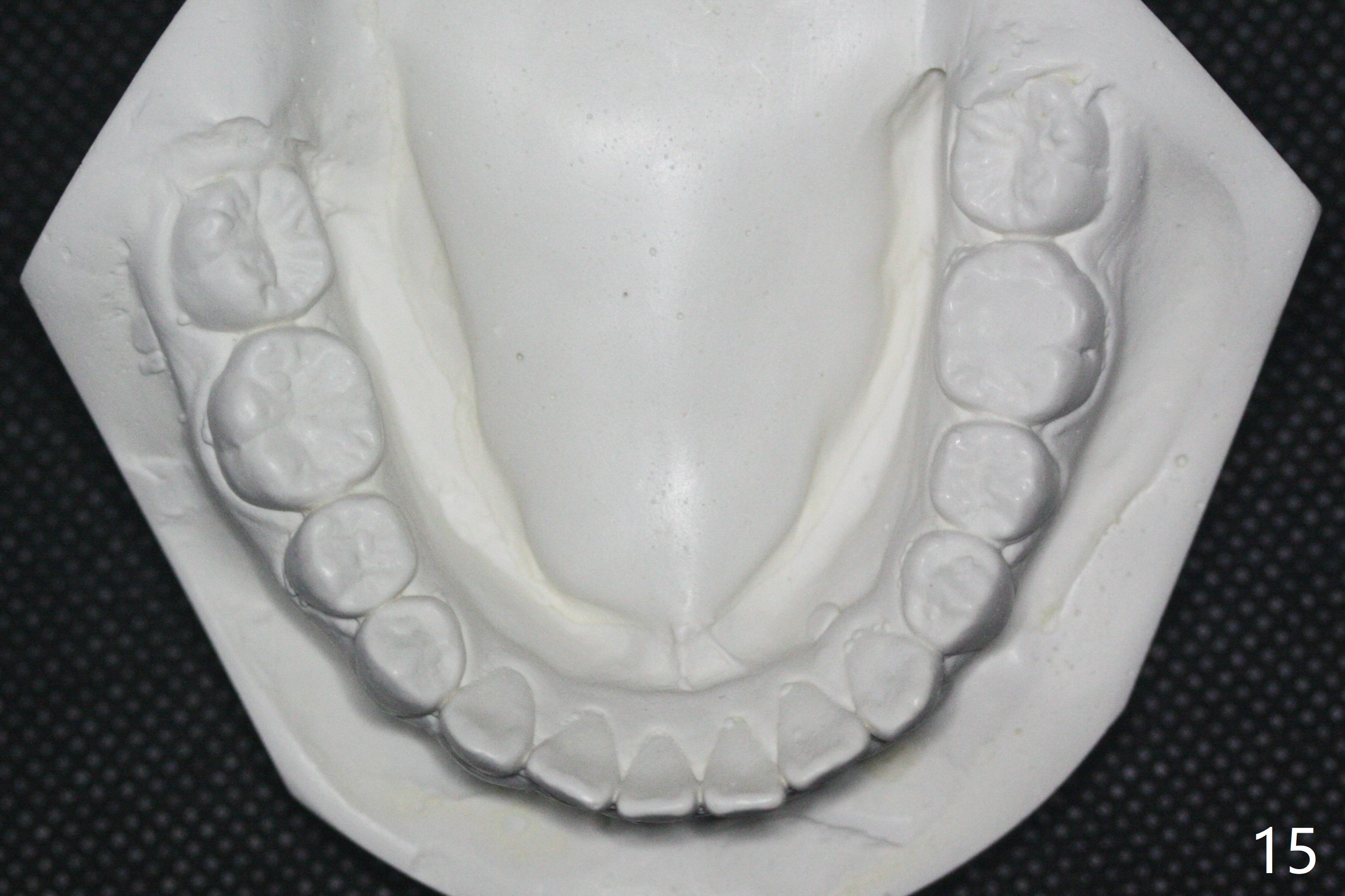 A 14-year-old woman, used to be a dental phobic (Fig.13), agrees with orthodontic treatment. Her mother is concerned about UL1 protrusion (Fig.8,11) and decalcification (Fig.8 *) and UR4 cross bite (Fig.7,10,14). There is mild lip constraint (Fig.1,3), as related to light dental protrusion (Fig.2,4), although the upper dental midline is not deviated (Fig.2). History shows that UR3 erupts before UR D is extracted, which is associated with UR4 cross bite. After arch expansion, consider proximal reduction to reduce anterior overjet if present. In fact that latter is not done; instead Class II is conducted.